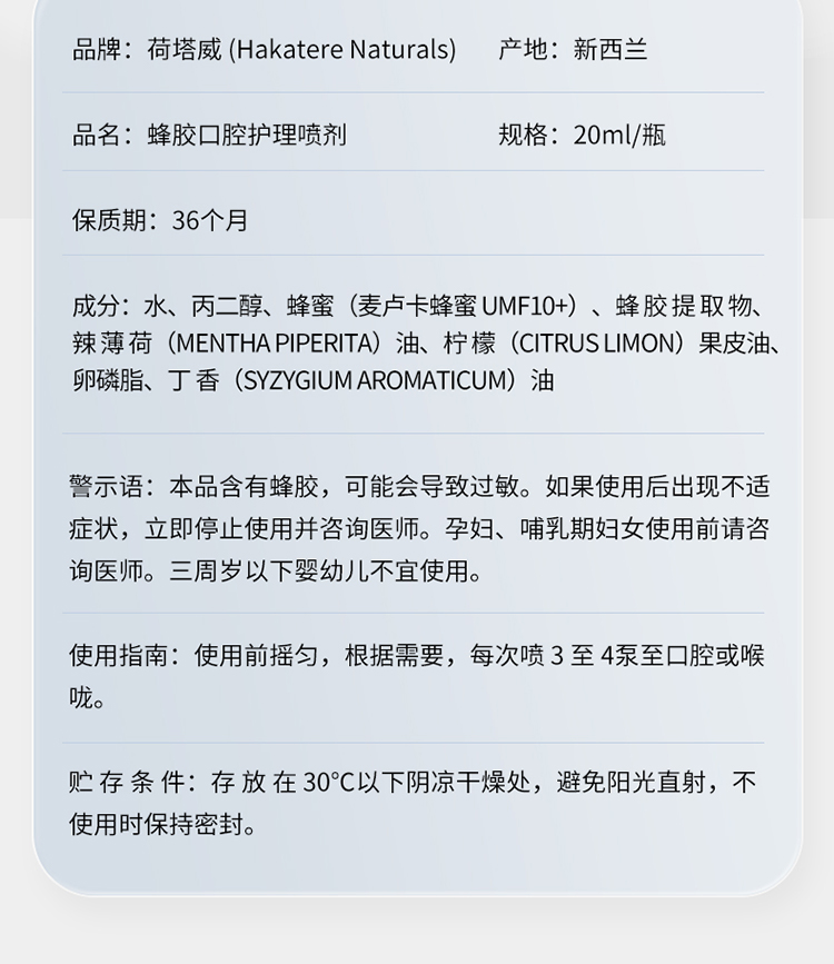 荷塔威UMF10+麦卢卡蜂胶口喷 含25%蜂胶 新西兰进口 呵护咽喉