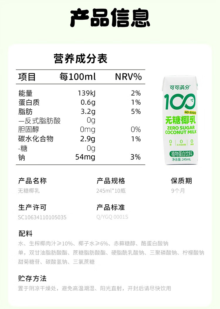 | 【品名】可可满分无糖椰乳/茉莉椰乳 【规格】125ml/200ml/320ml/330ml/瓶 【保质期】9个月 【储存方法】请置于阴凉干燥处,避免高温潮湿、阳光直射,开封后请尽快饮用。 【产地】安徽滁州 【发货地】安徽滁州 【发货快递】中通 【不发货区域】新疆、西藏、港澳台地区不发 【补邮费地区】青海、宁夏、甘肃、内蒙、海南每箱加15元 【发货时效】48小时内,中午12:00前订单当天可发出,特殊情况节假日顺延 |