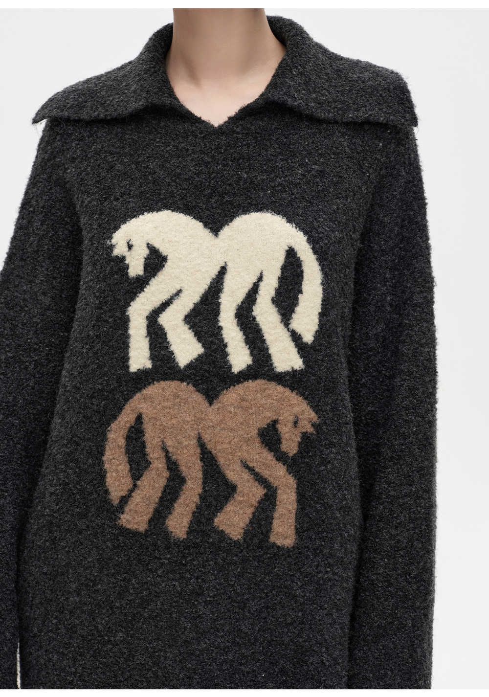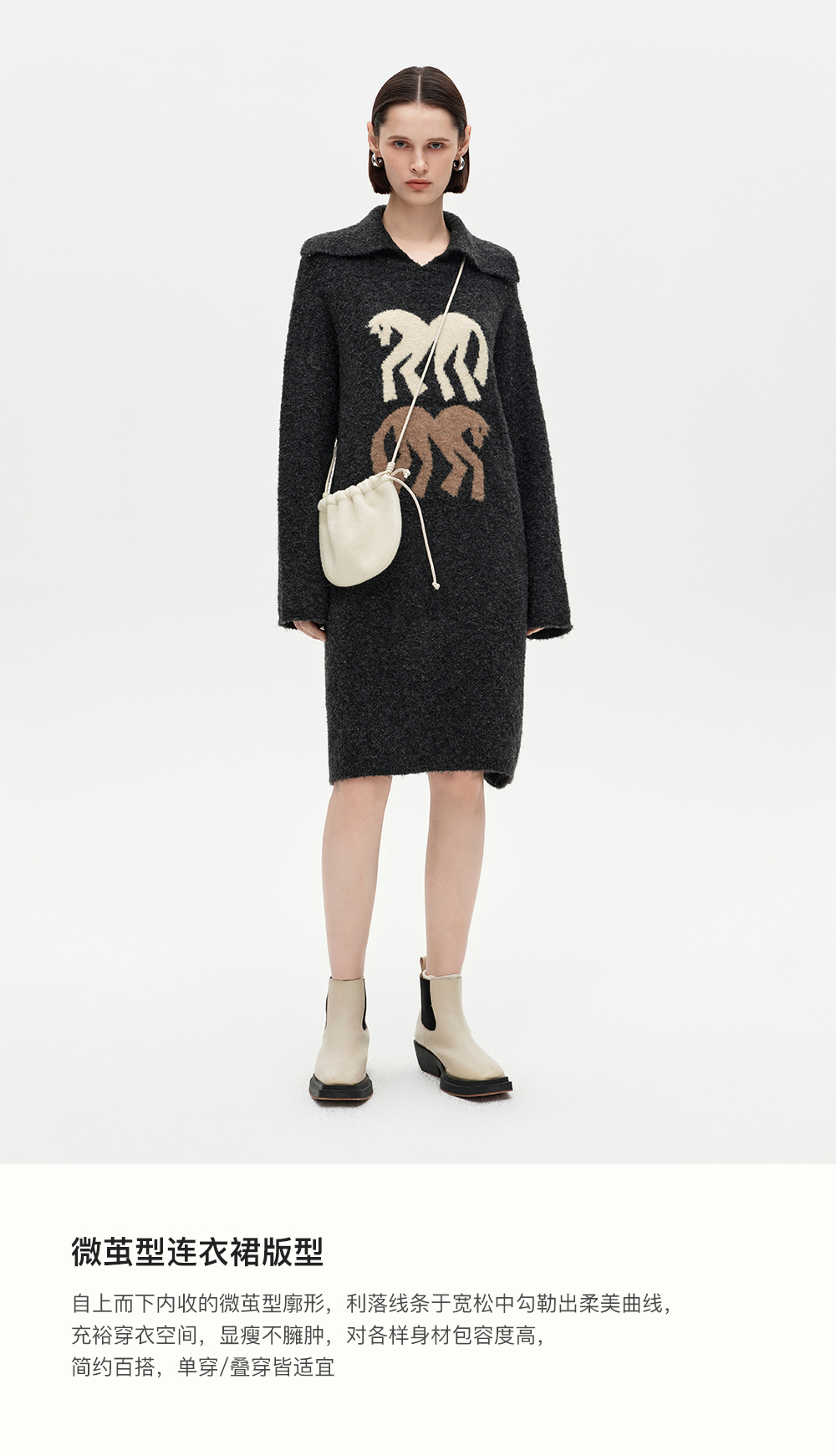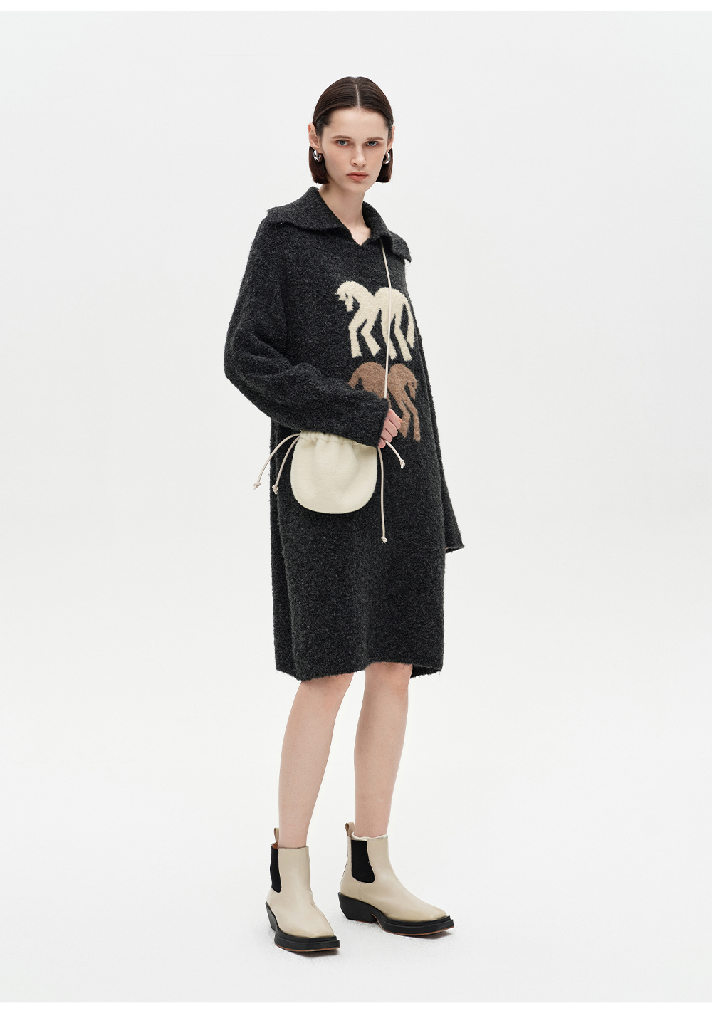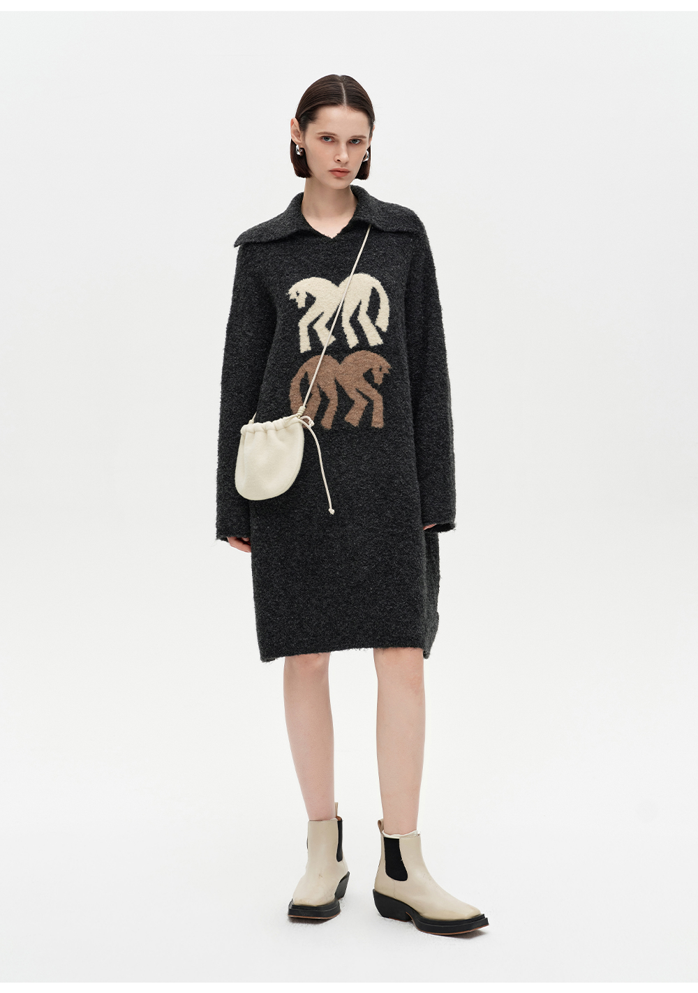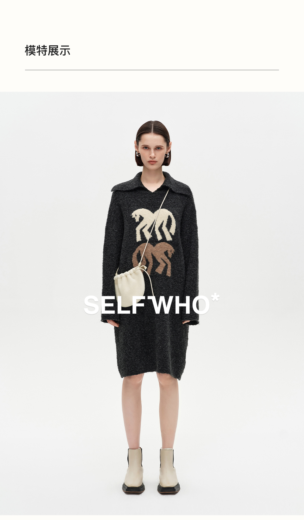 SELFWHO绵羊毛混纺小马图案灰色连衣裙女2025冬季新款翻领落肩裙