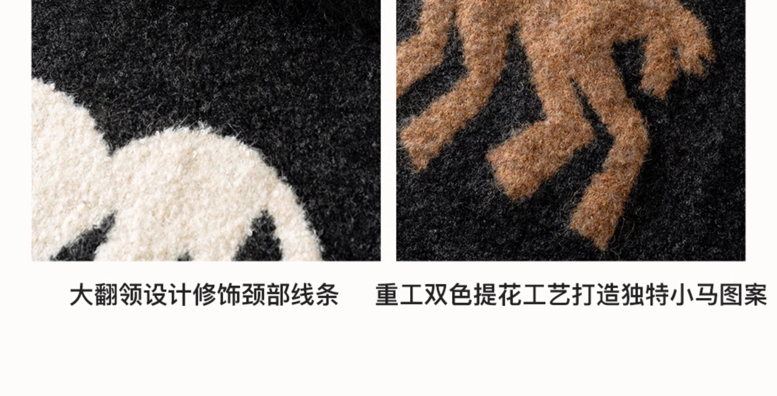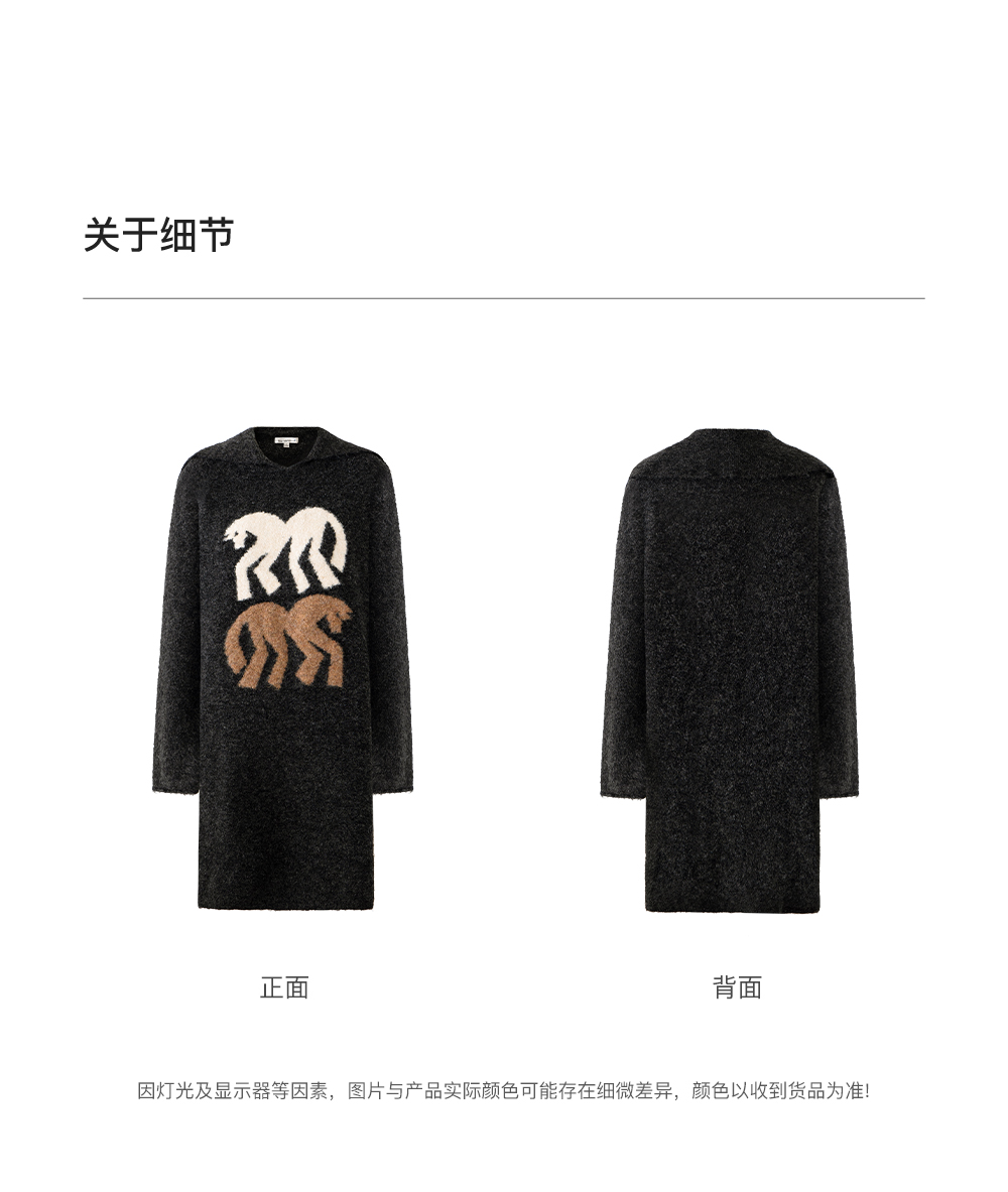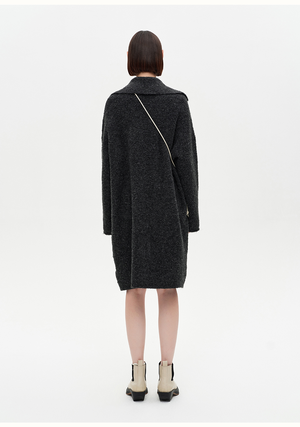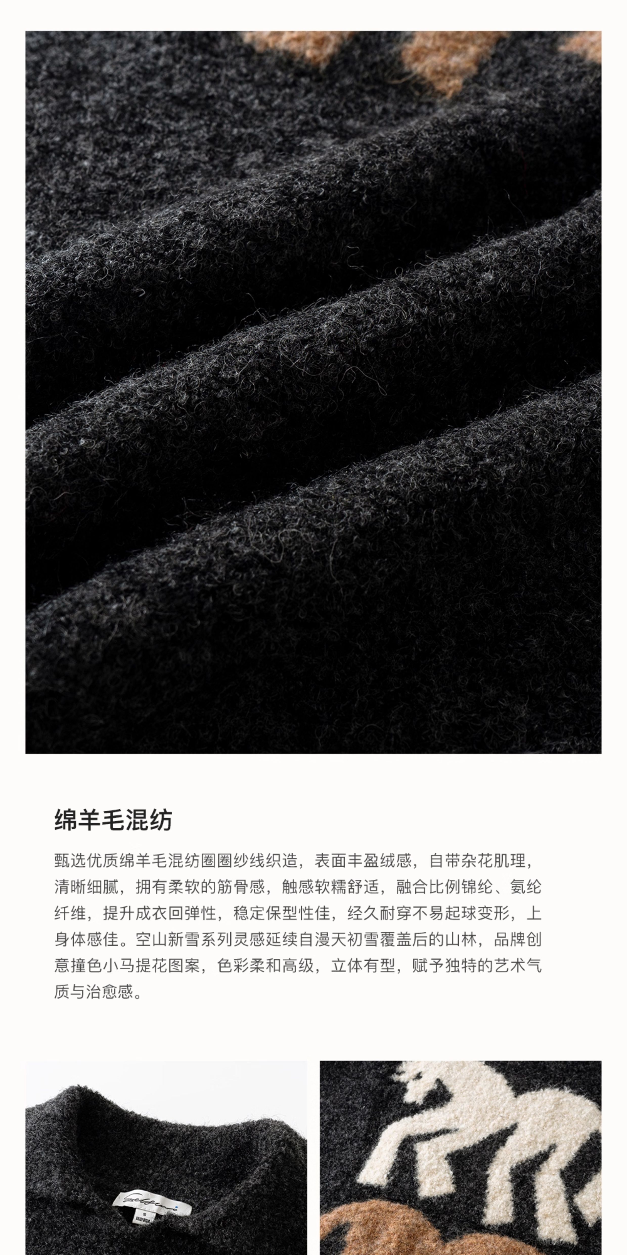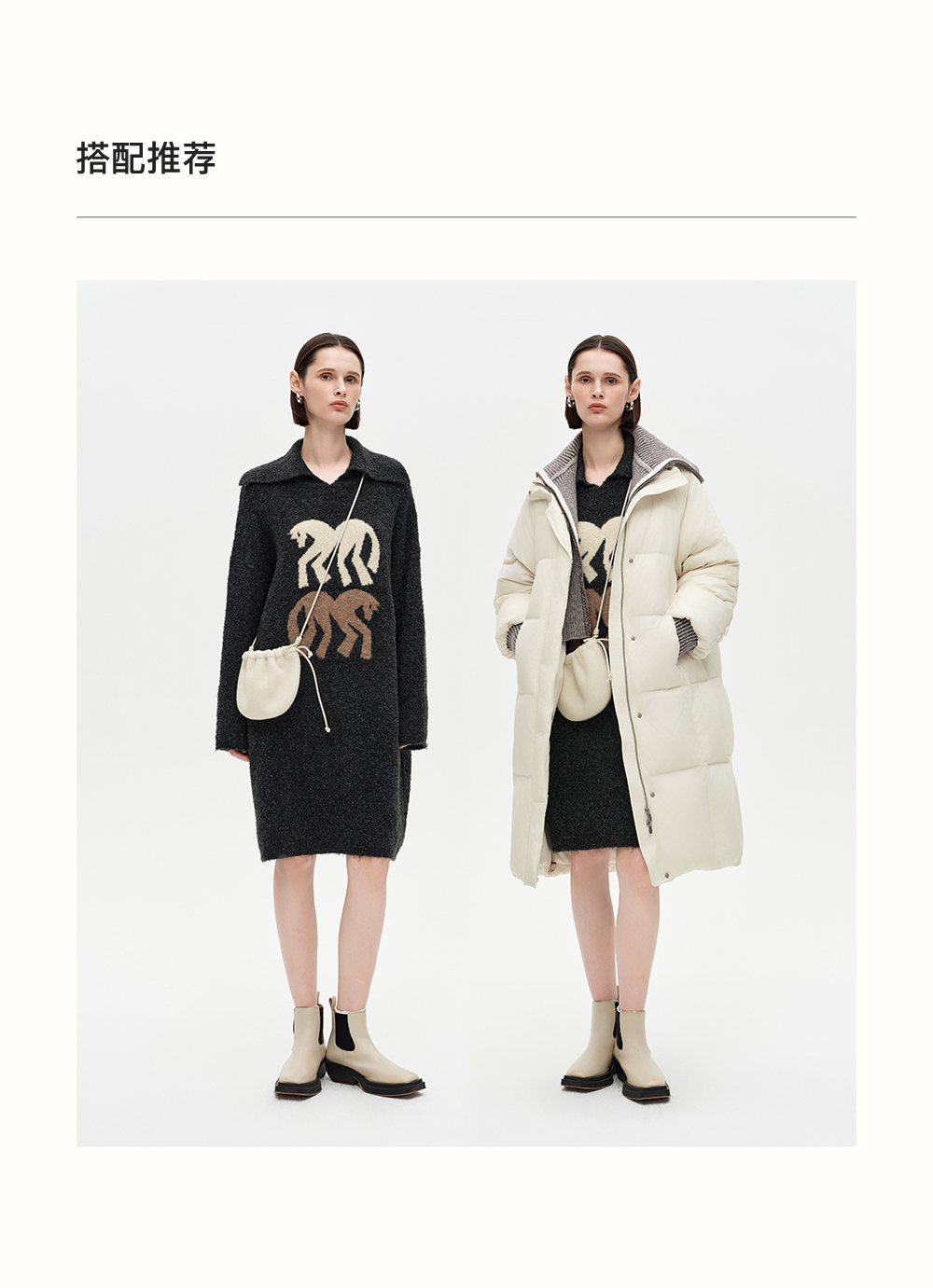 SELFWHO绵羊毛混纺小马图案灰色连衣裙女2025冬季新款翻领落肩裙