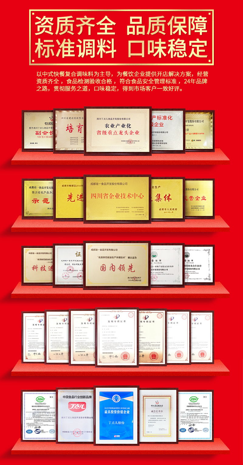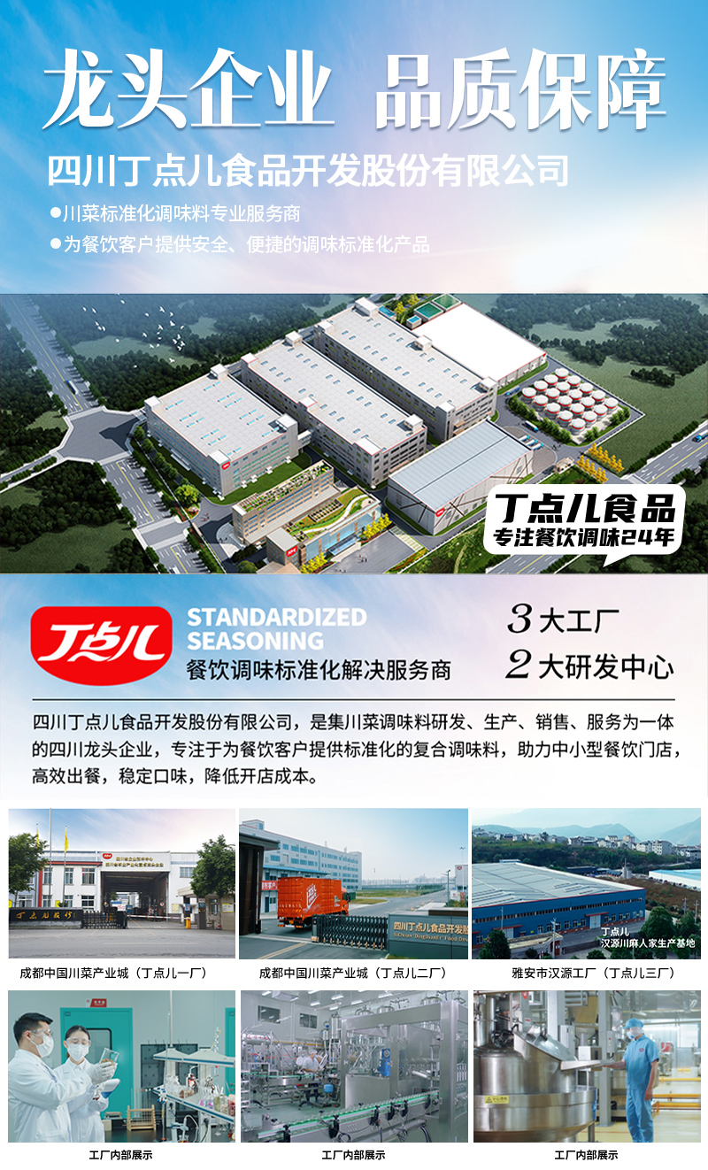 四川丁点儿食品开发股份有限公司,是集川菜调味料研发、生产、销售、服务为一体的现代化企业,专注为餐饮客户提供川菜调味解决方案。公司成立至今,服务了超百万家的餐饮门店以及连锁品牌。