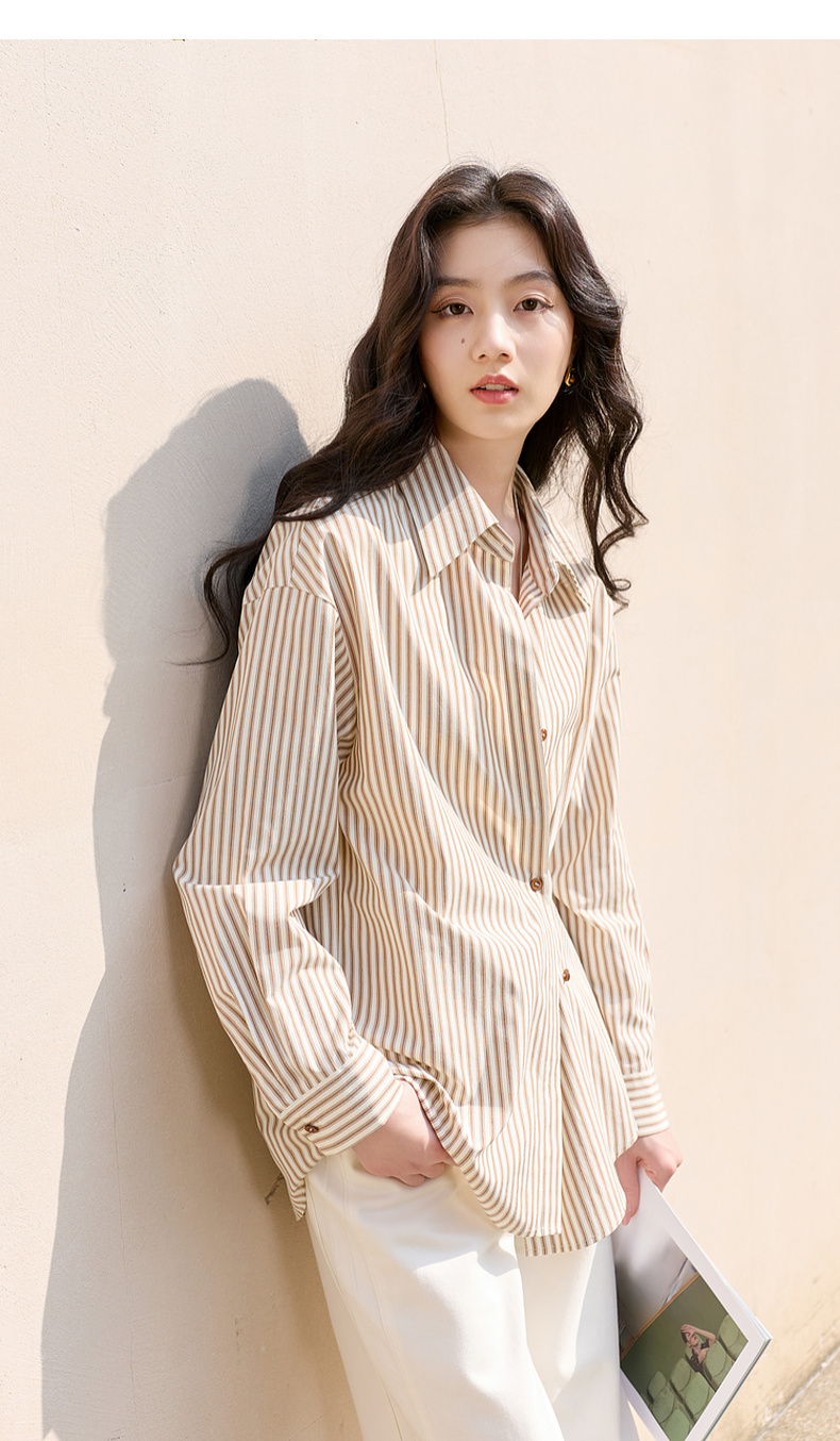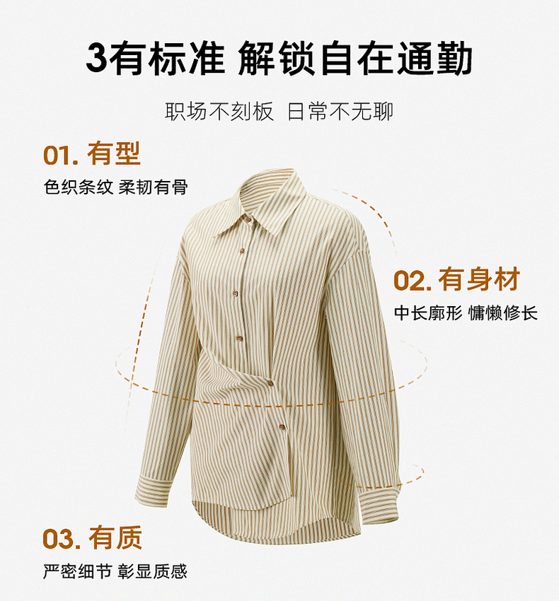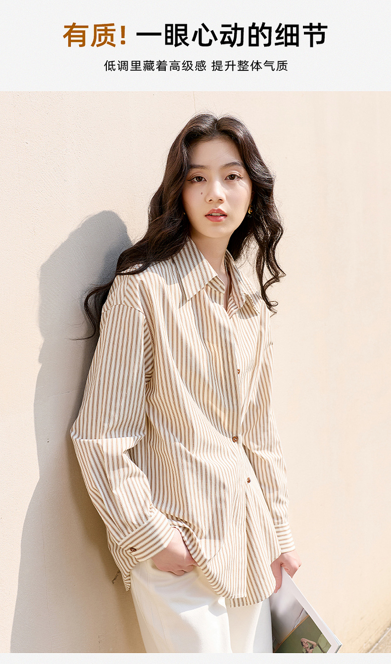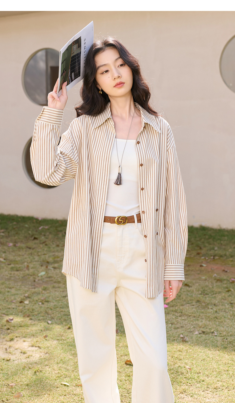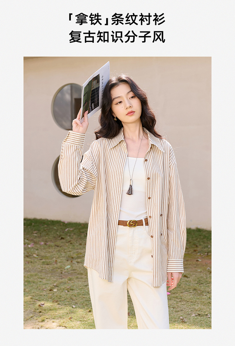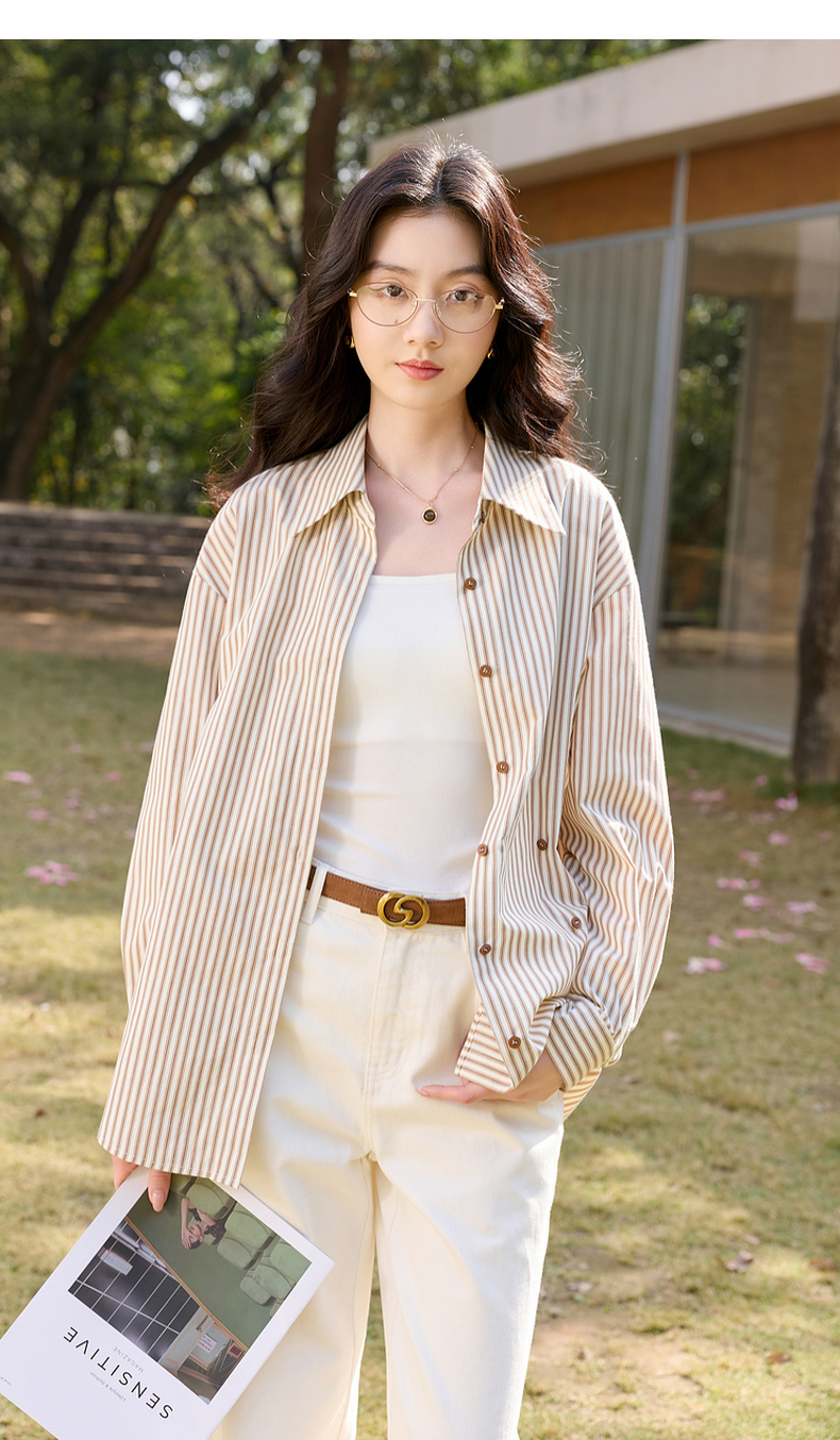 三彩2026春季新款翻领条纹衬衣宽松中长衬衫小衫气质上衣通勤S