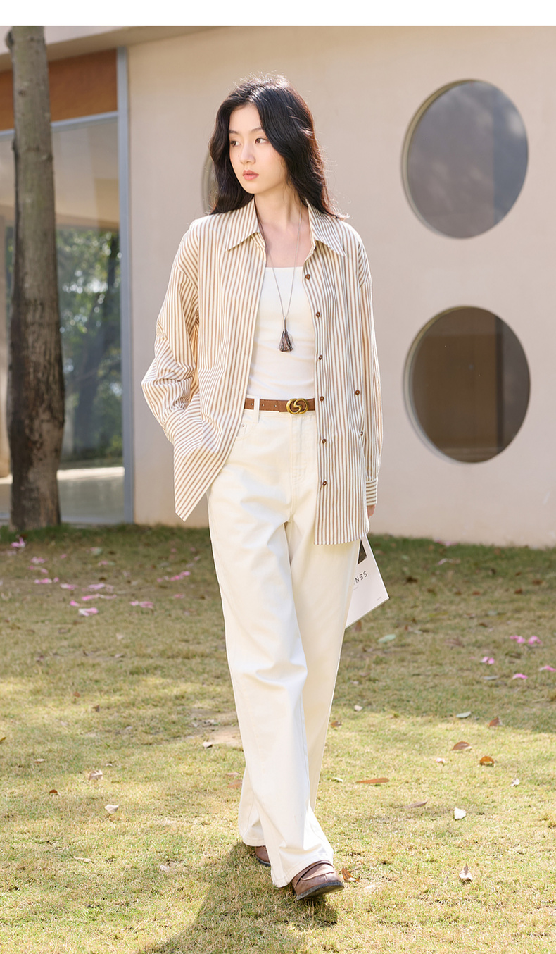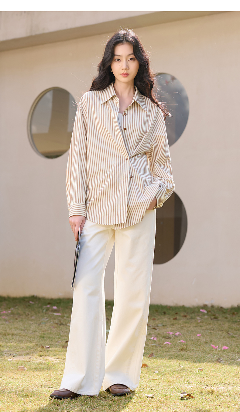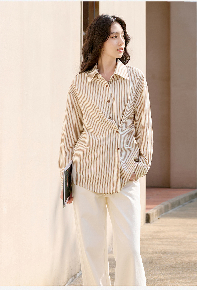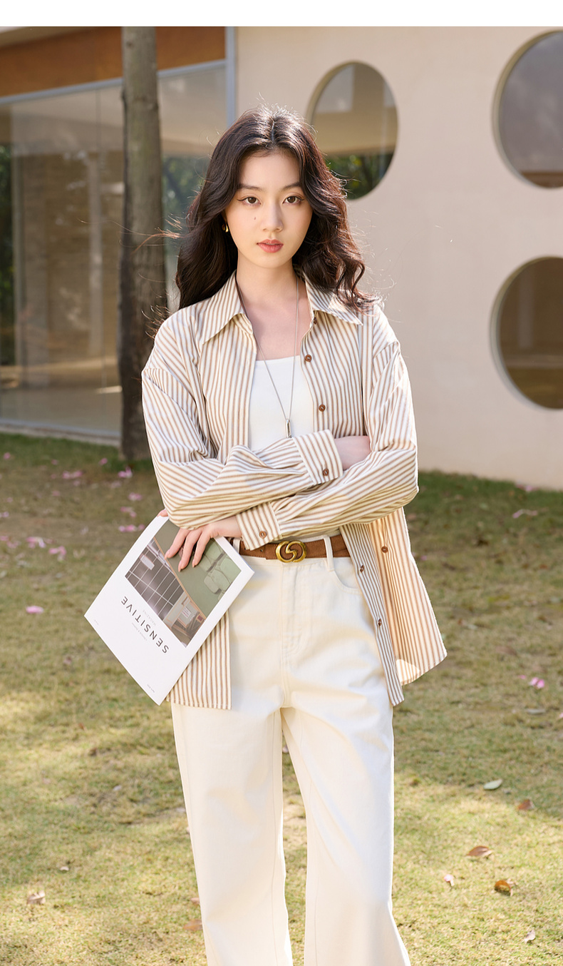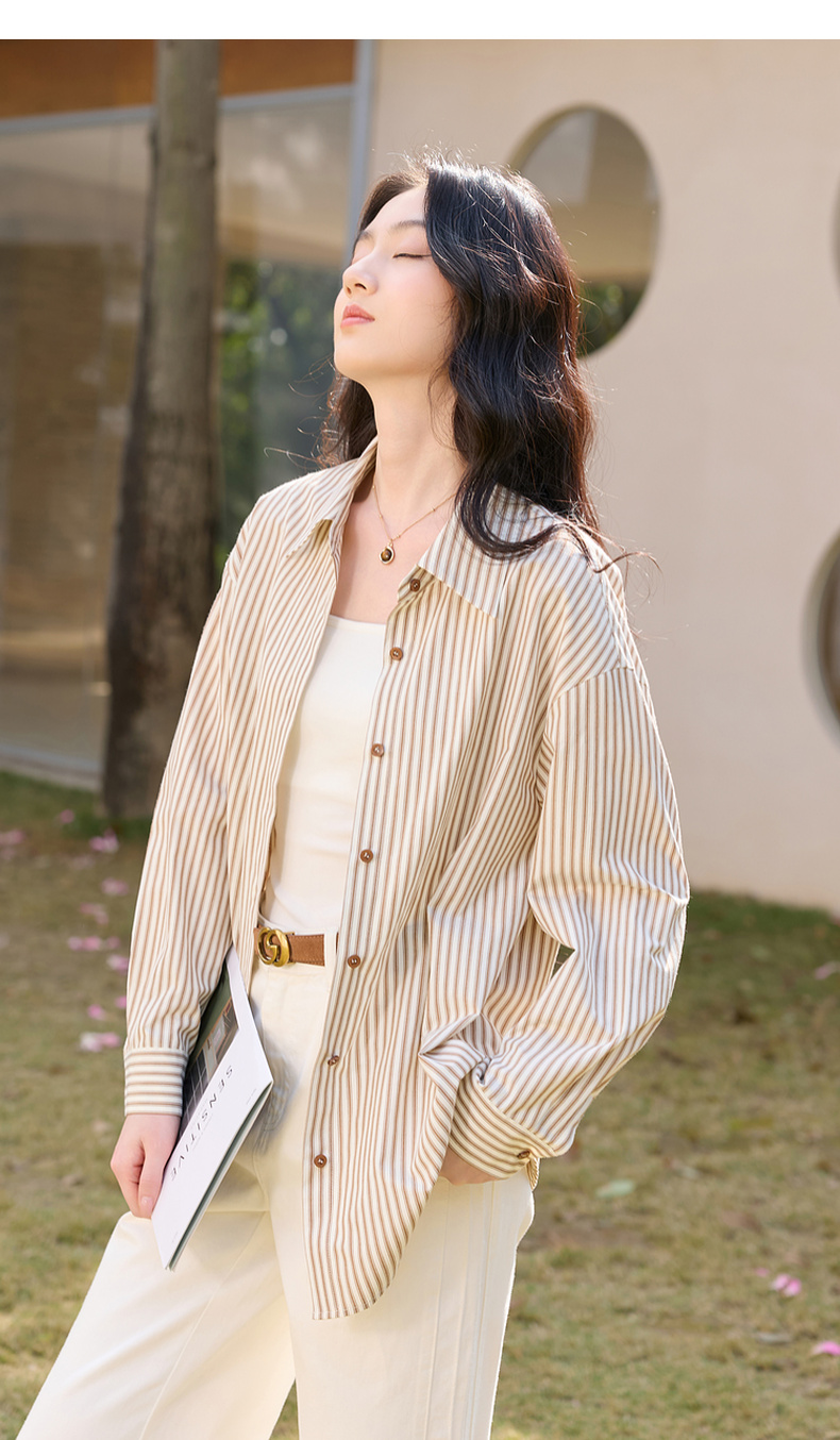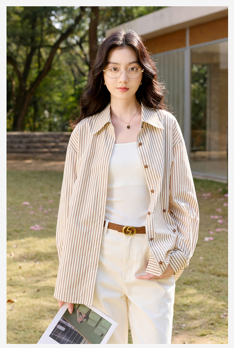三彩2026春季新款翻领条纹衬衣宽松中长衬衫小衫气质上衣通勤S
