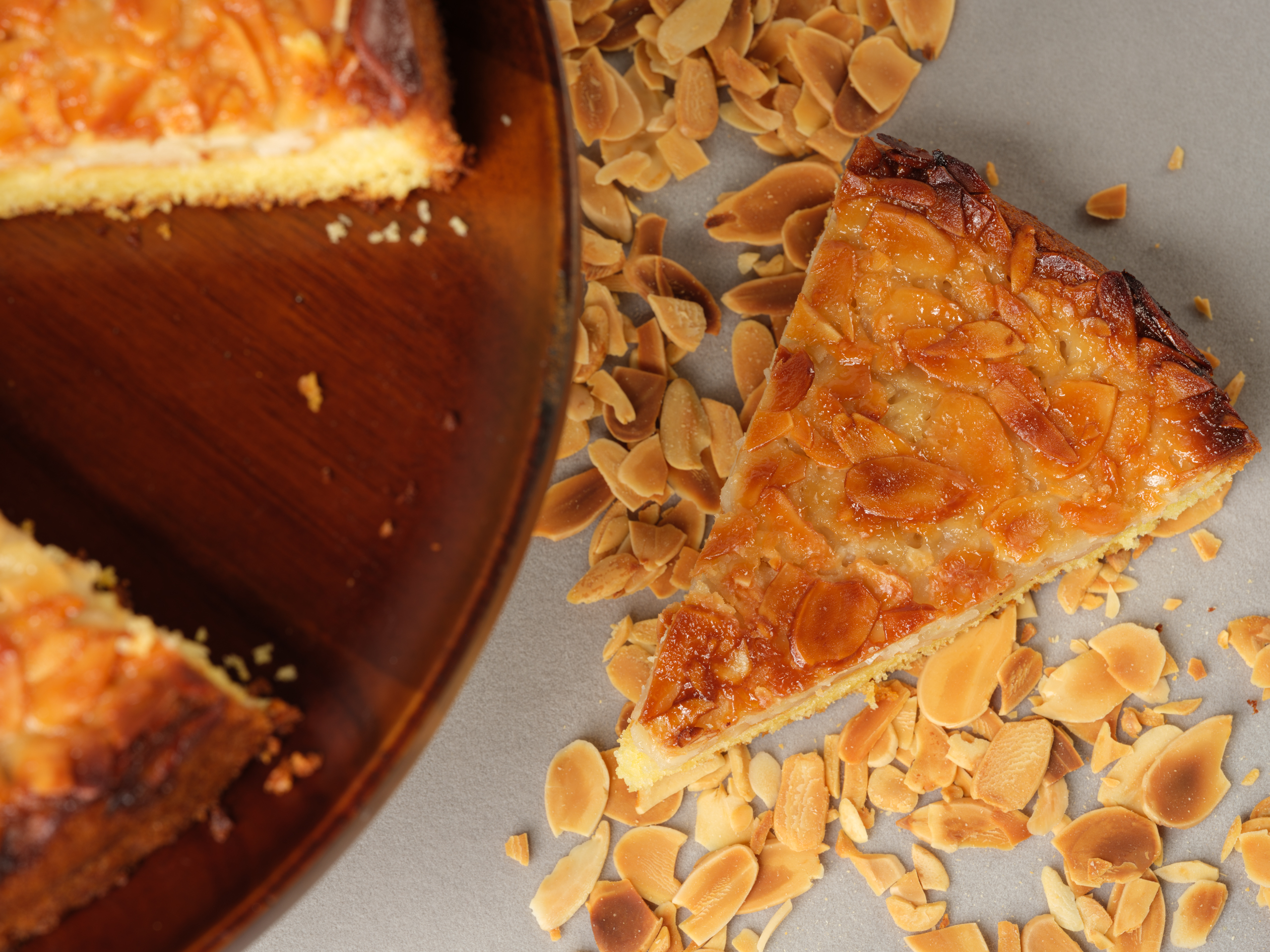 Traditional Swedish Tosca cake, a soft, vanilla cake base with a thick layer of caramelized almonds that lend a sweet, nutty crunch with every bite. A must for your next Fika.