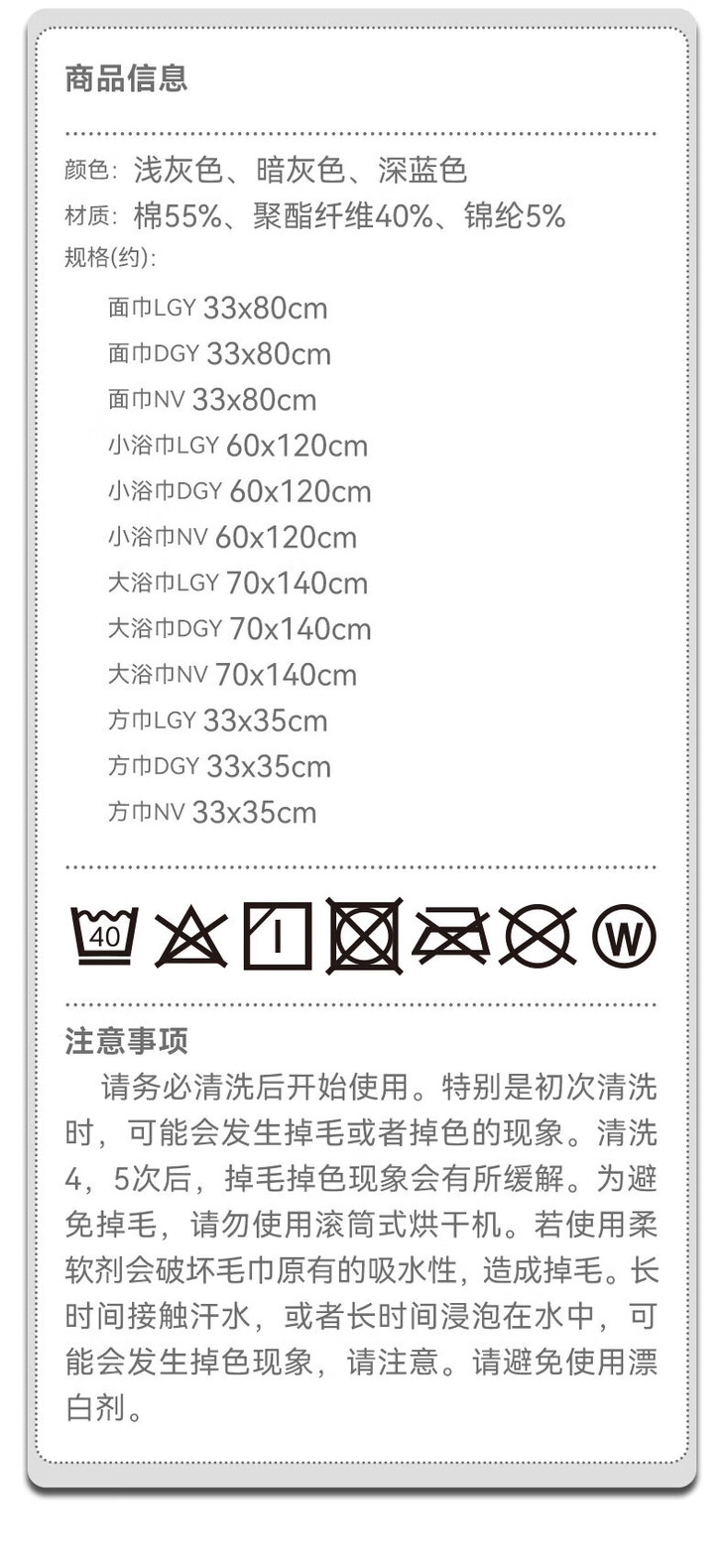 WT006系列毛巾 面巾/小浴巾/浴巾/方巾 浅灰色/深灰色/深蓝色