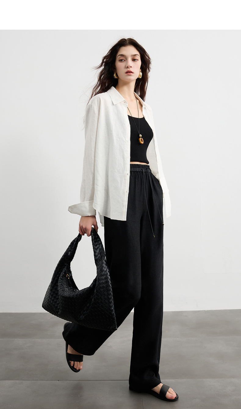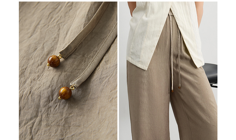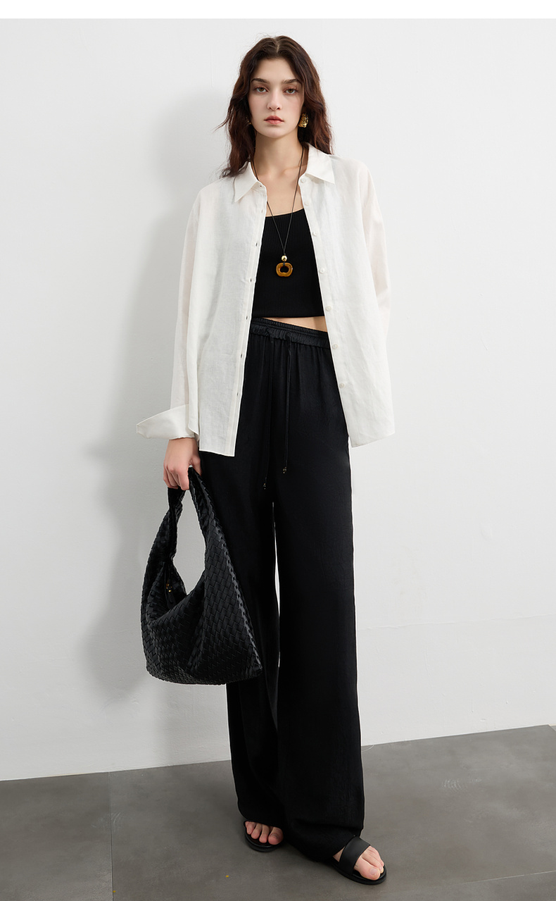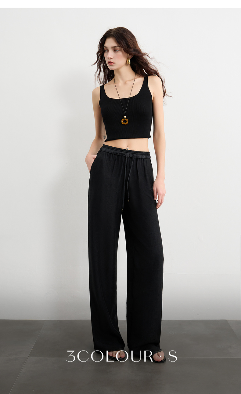 三彩2025春季新款轻奢醋酸禅意裤松紧高腰长裤宽松直筒裤显瘦S
