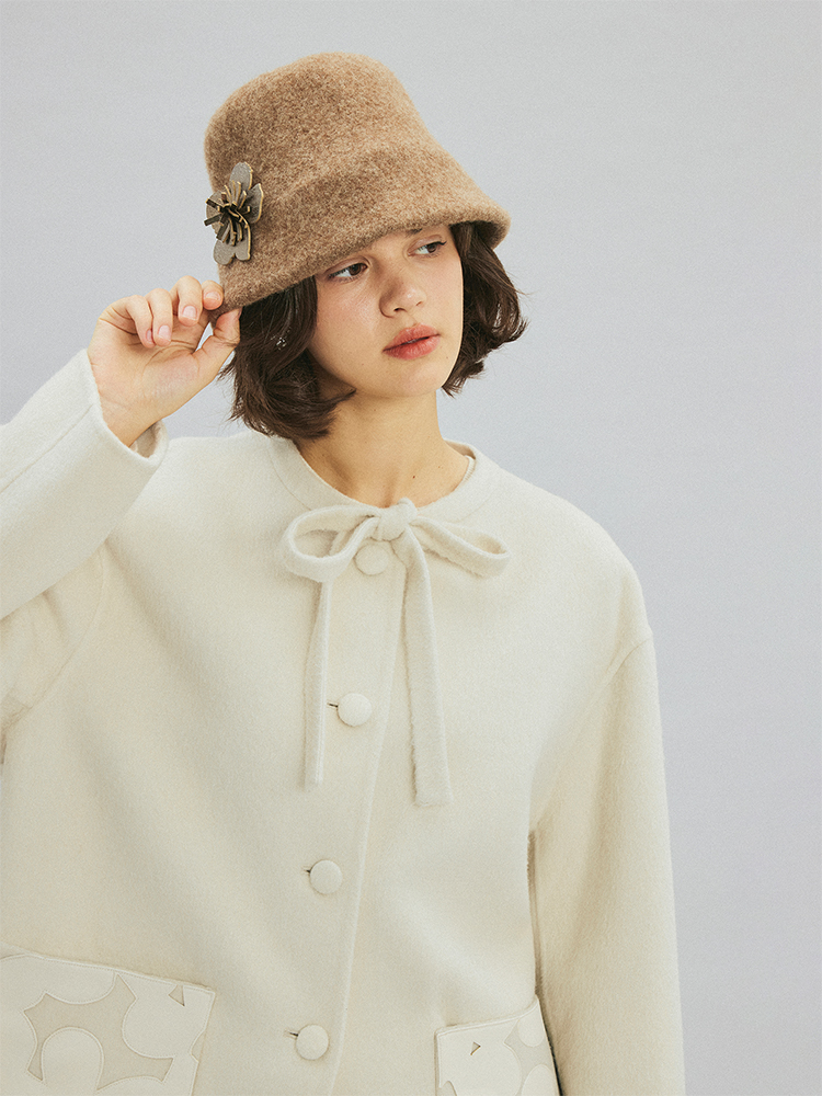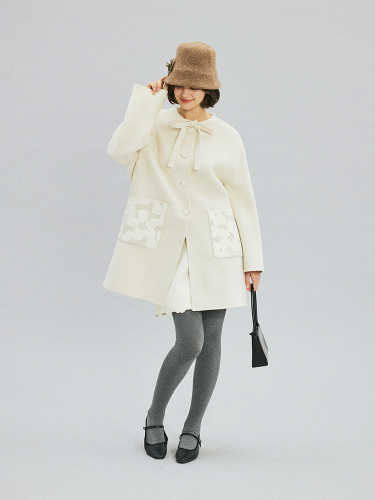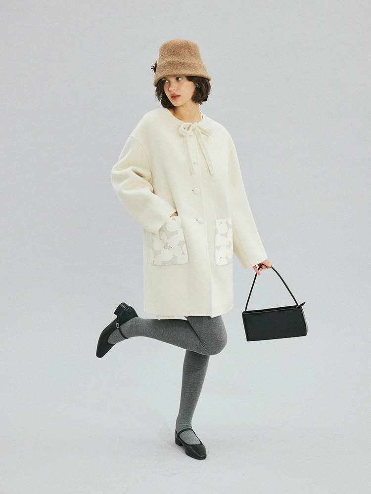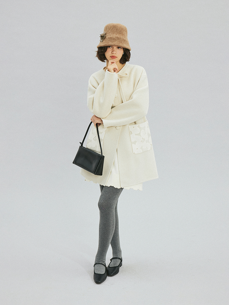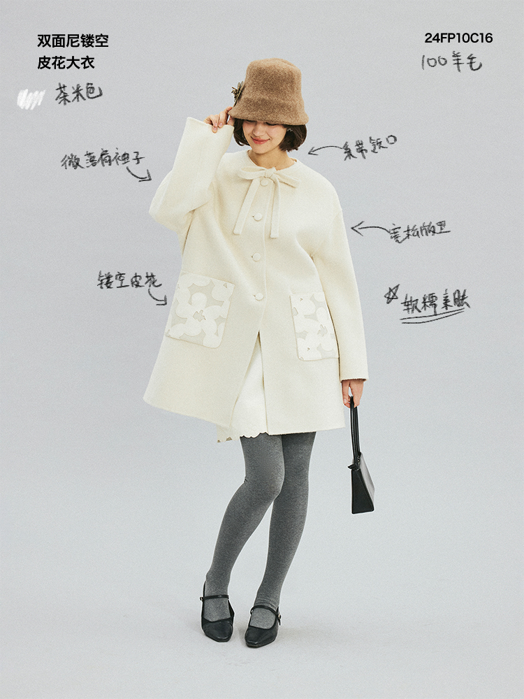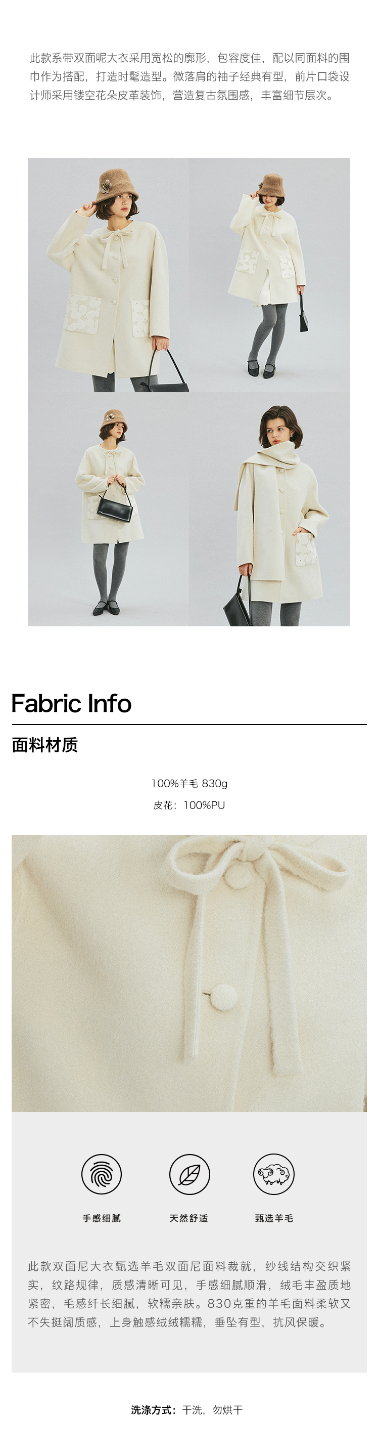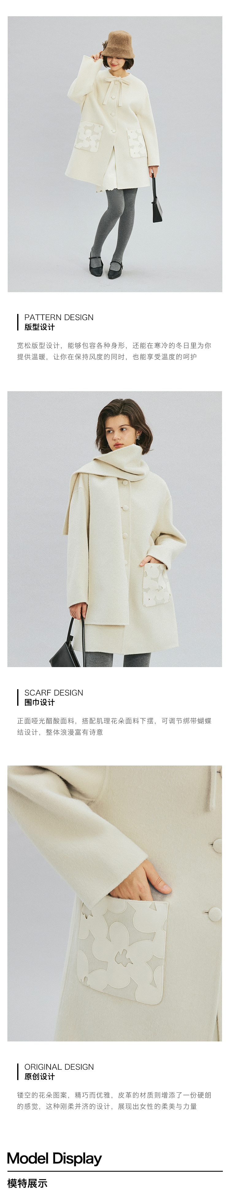 ForPoem 现货 24/FW原创设计镂空皮革花朵绑带100羊毛双面尼大衣