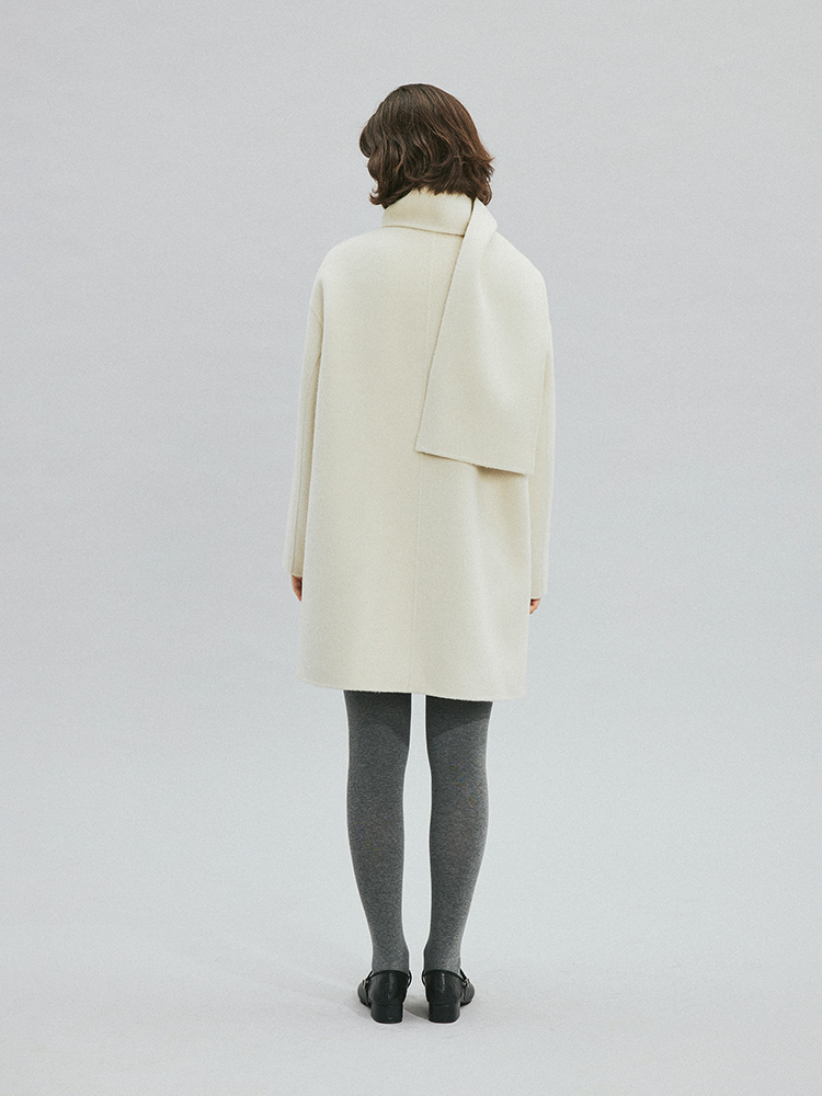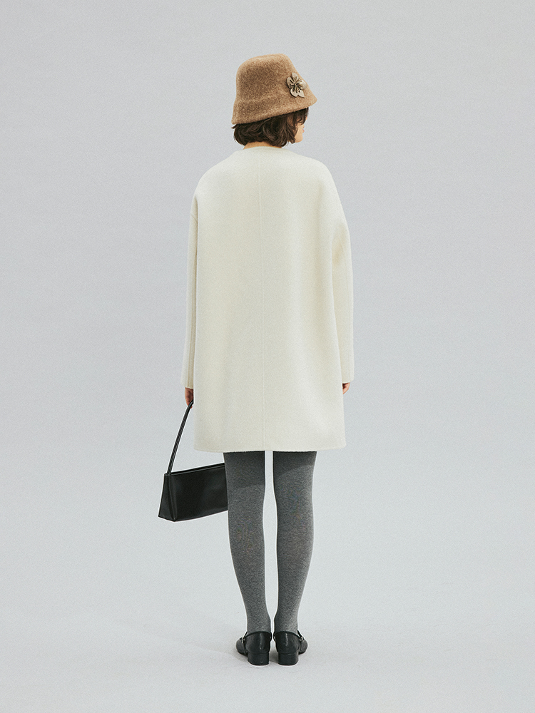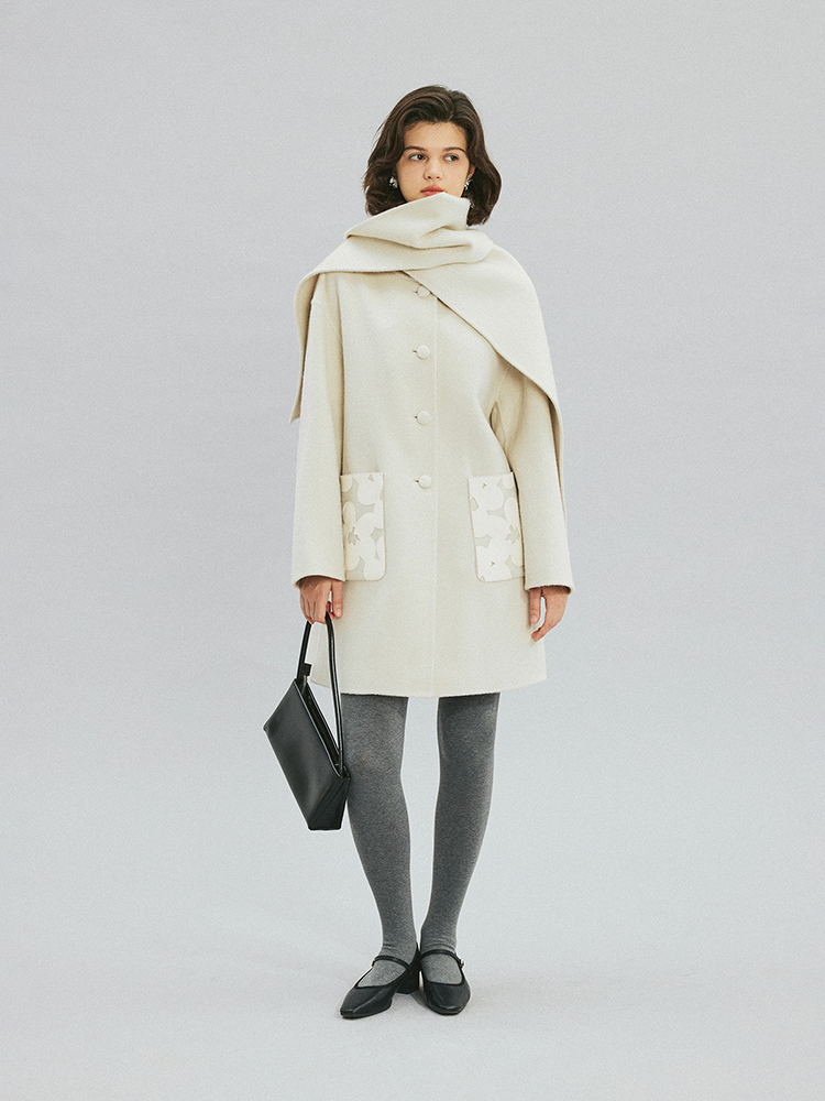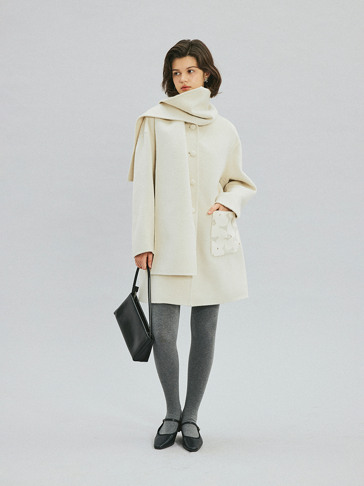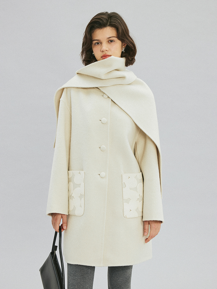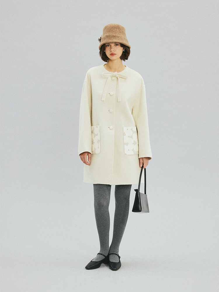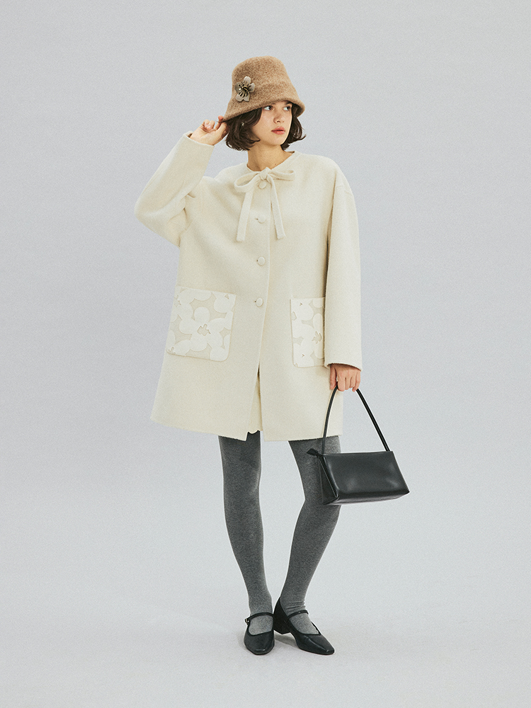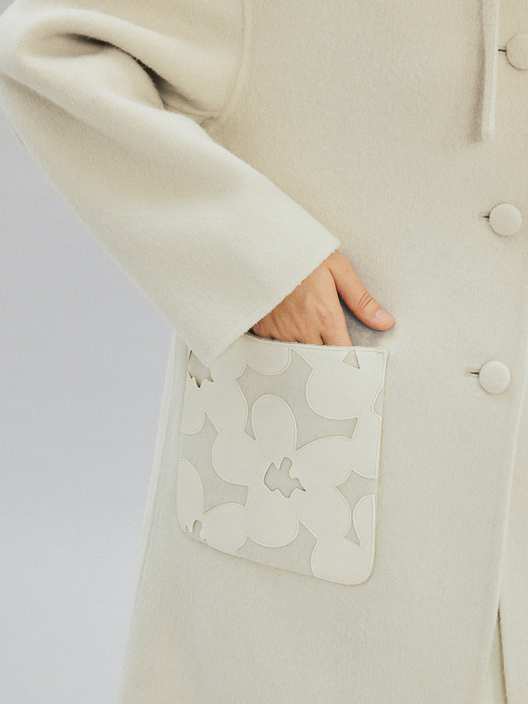 ForPoem 现货 24/FW原创设计镂空皮革花朵绑带100羊毛双面尼大衣