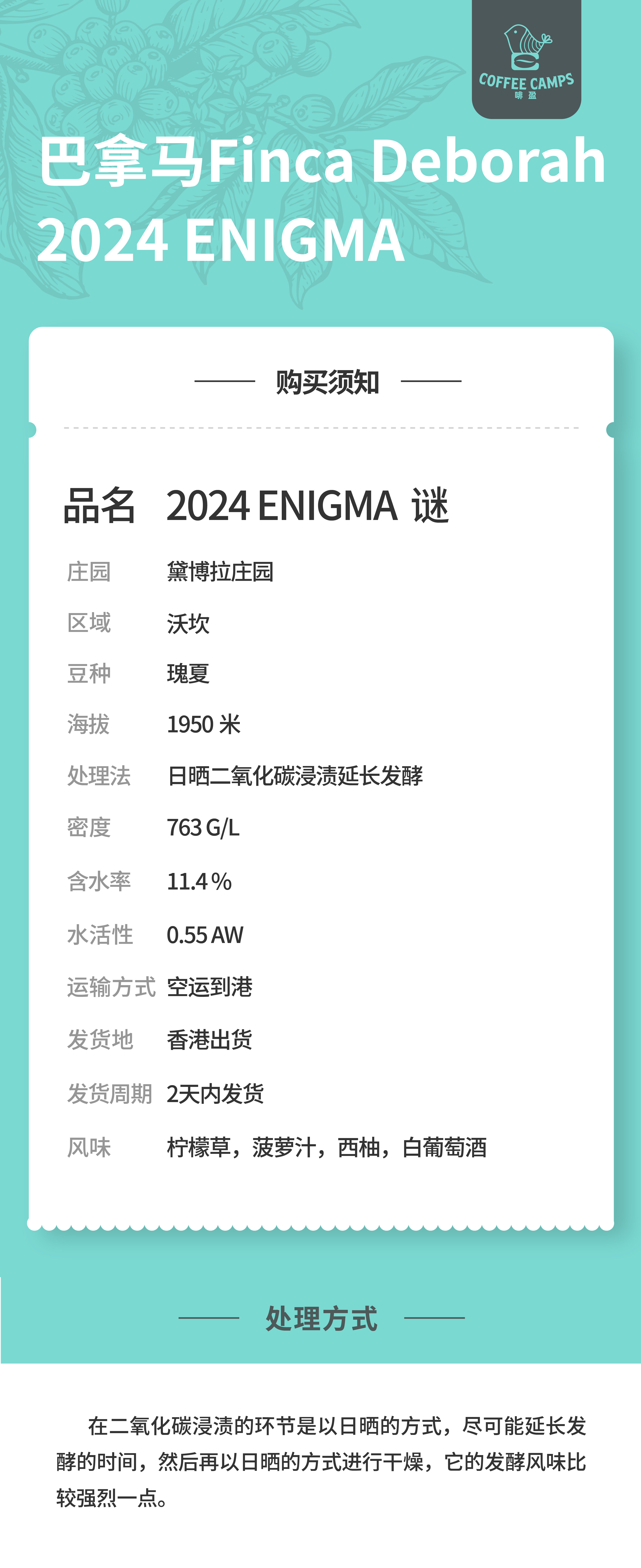 24产季 巴拿马 黛博拉 Finca Deborah 谜 ENIGMA 瑰夏 日晒二氧化碳浸渍延长发酵(生豆)空运批次