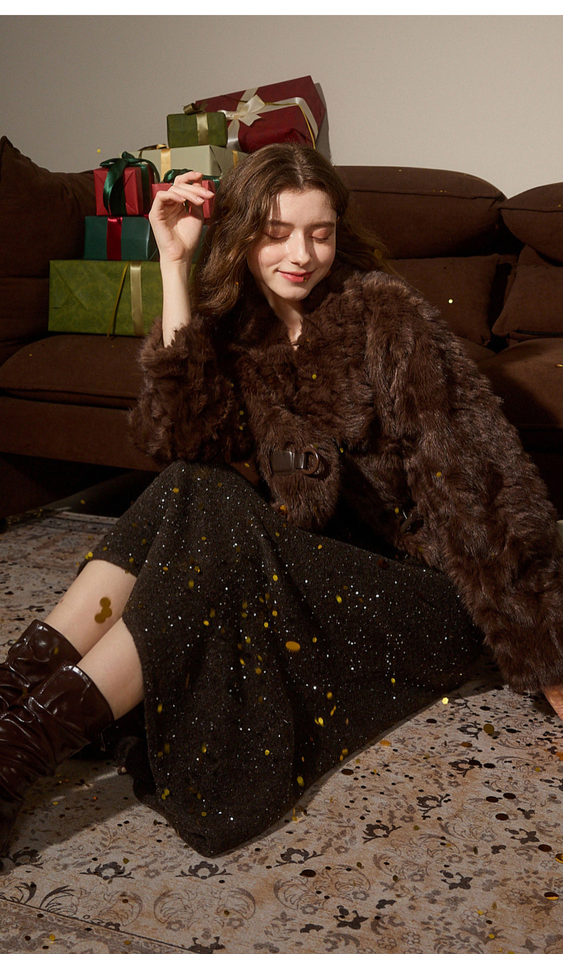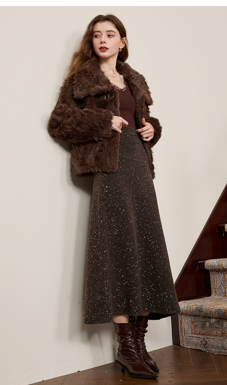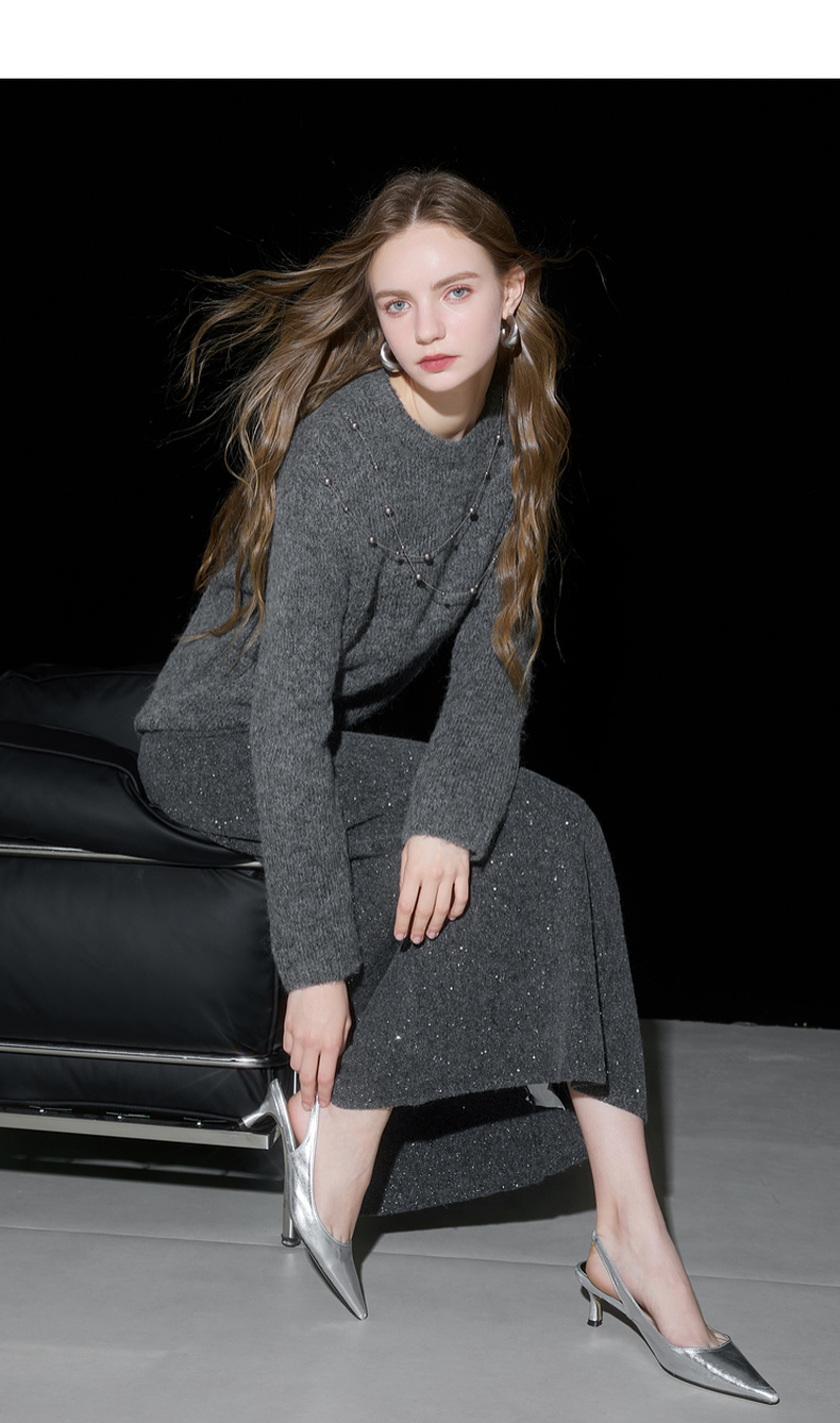 三彩2025冬季新款亮片针织裙高腰松紧半身裙A字裙长裙气质M