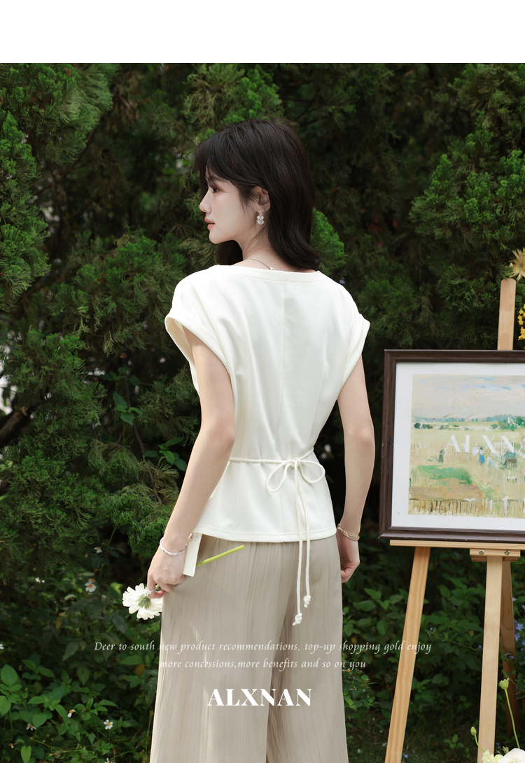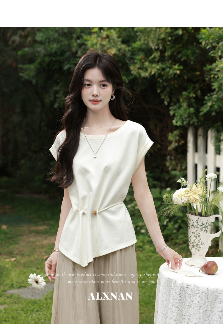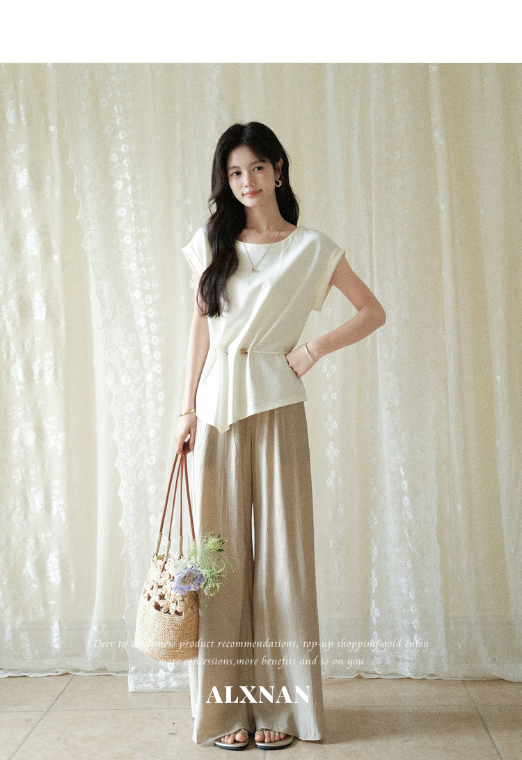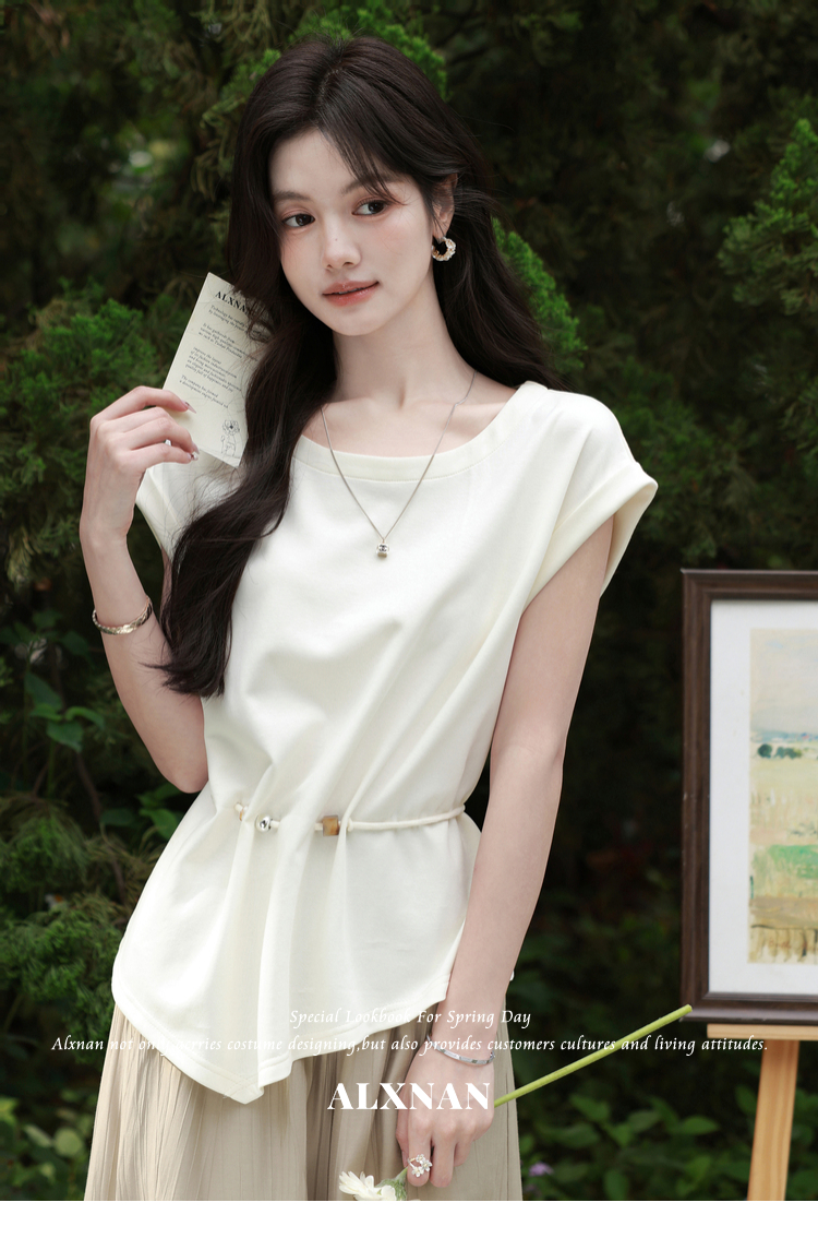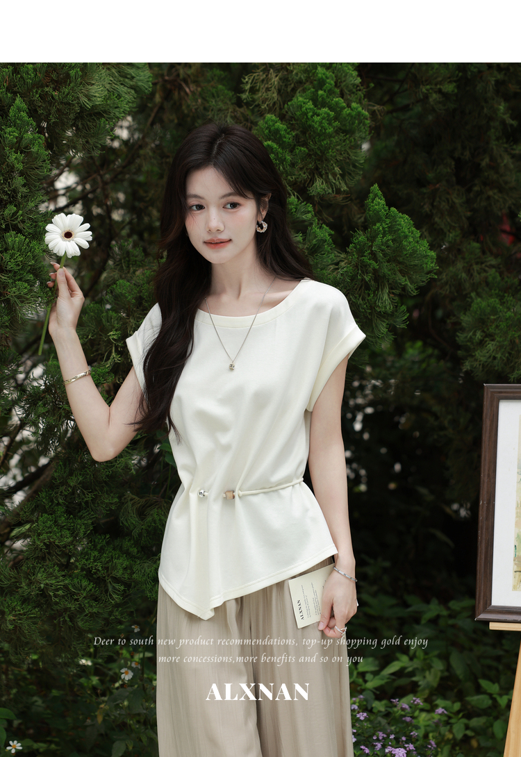 鹿向南「夏木温柔」气质高级感杏色短袖T恤女夏季不规则收腰上衣
