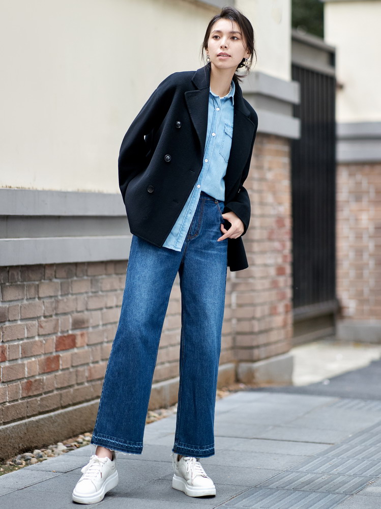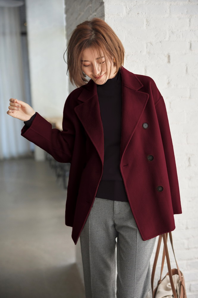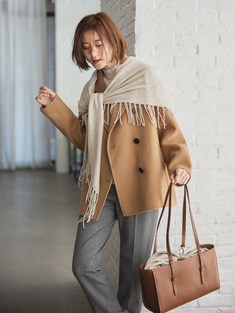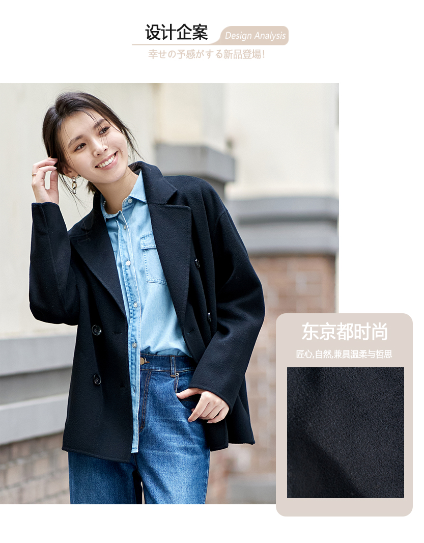 23区日系春季通勤宽松羊毛桑蚕丝混纺双排扣大衣毛呢外套商场同款