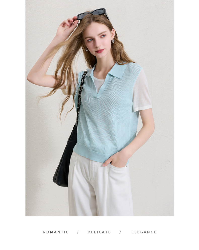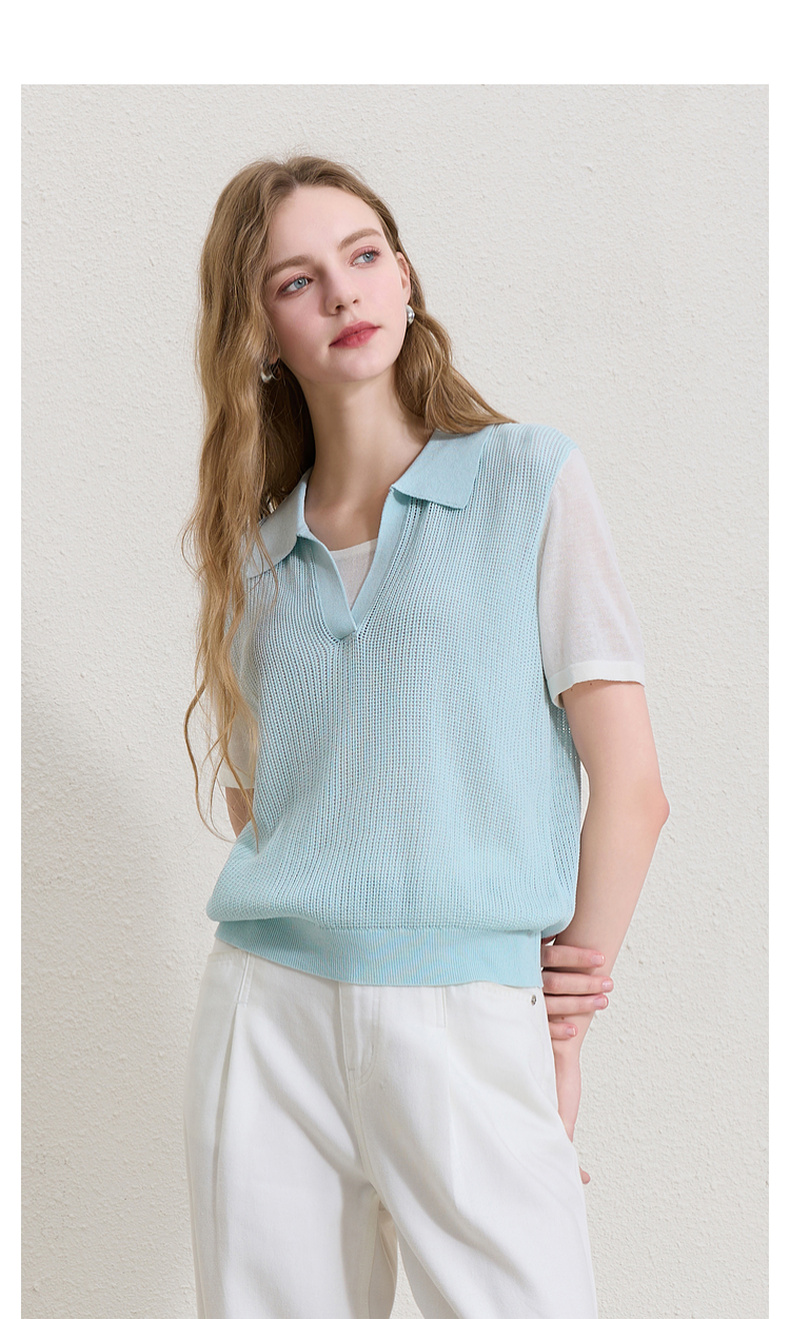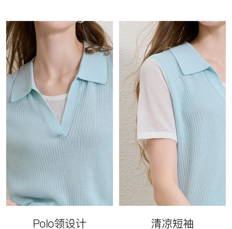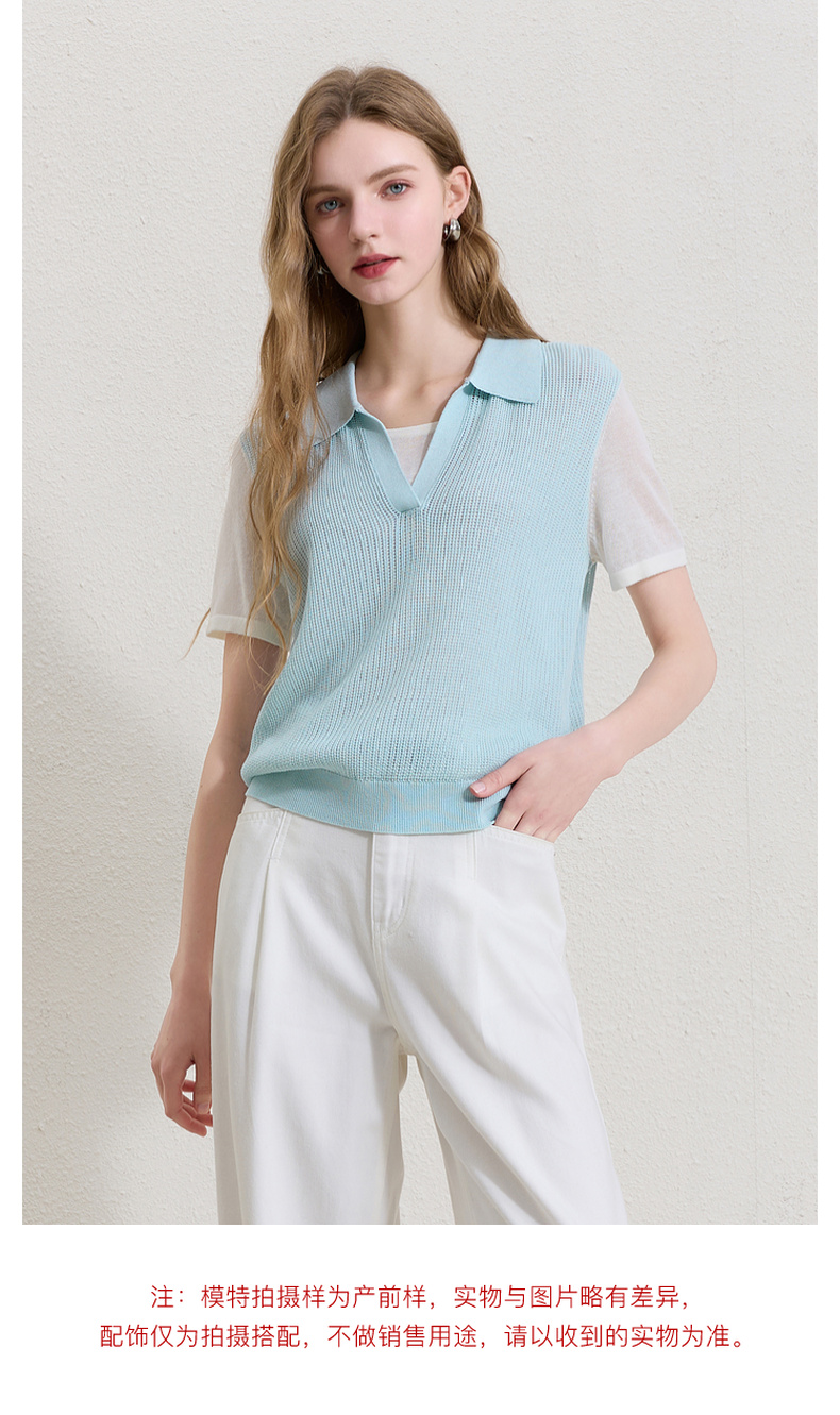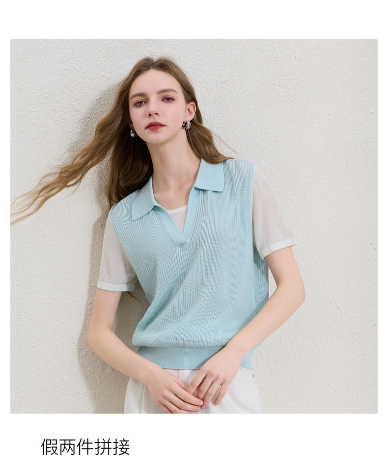 【莱赛尔+亚麻】三彩2025夏季新款假两件Polo领针织衫短袖套头设计感M