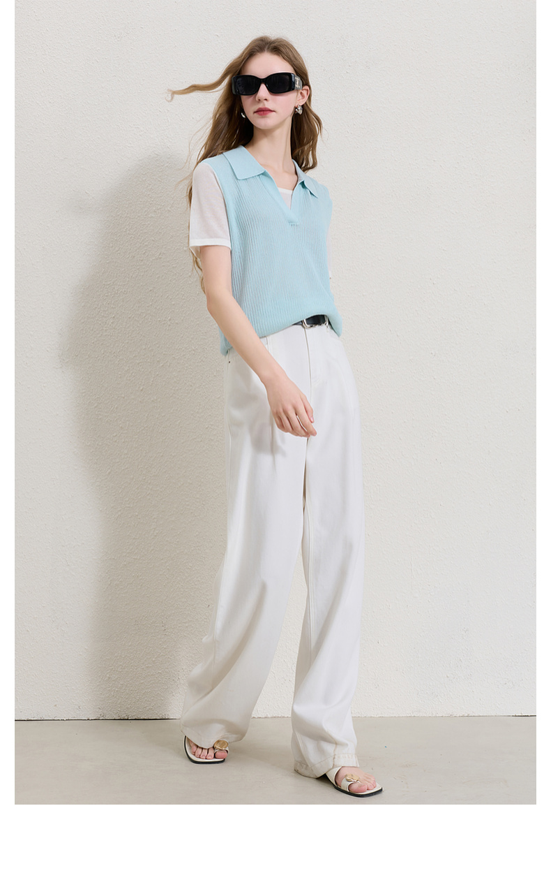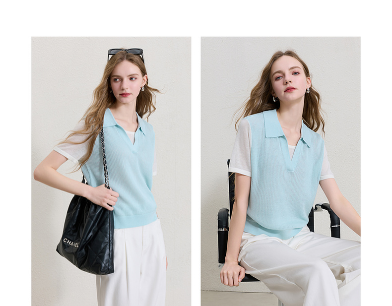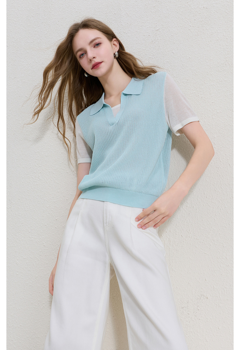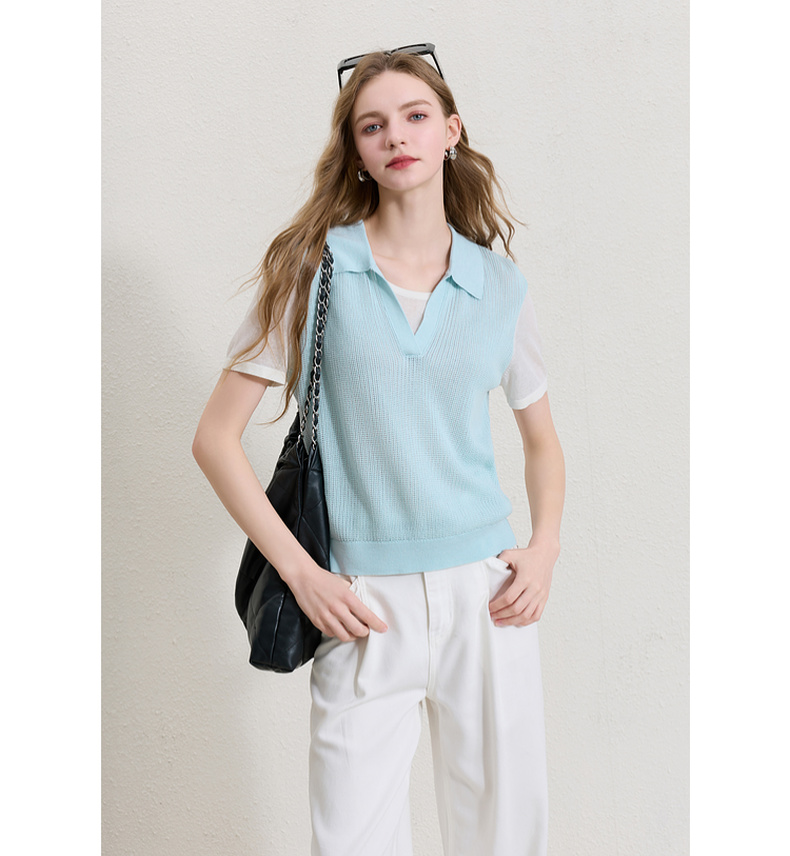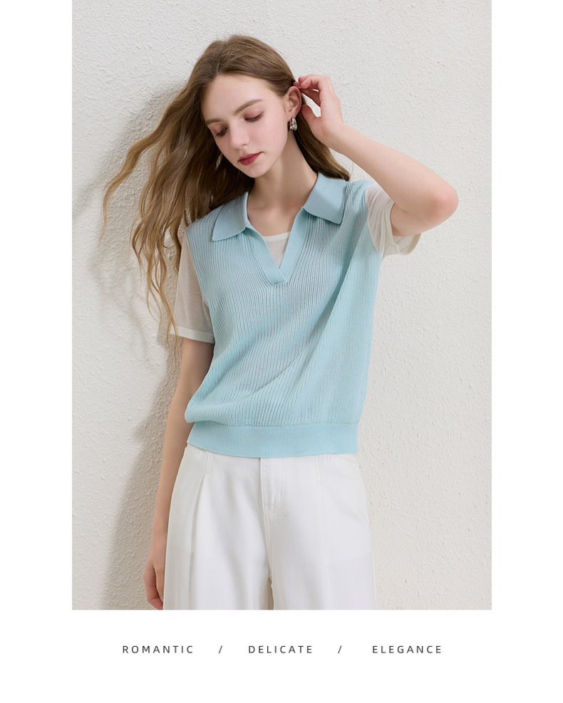 【莱赛尔+亚麻】三彩2025夏季新款假两件Polo领针织衫短袖套头设计感M