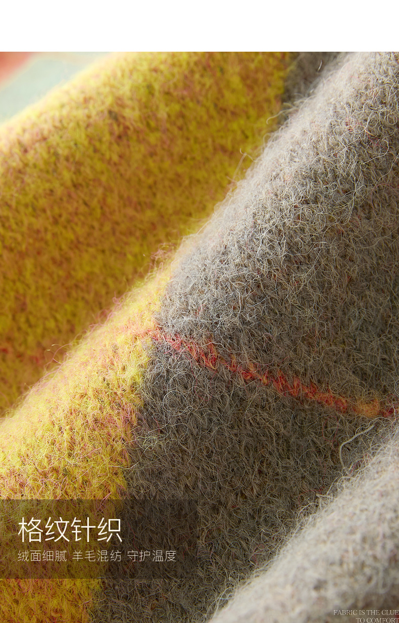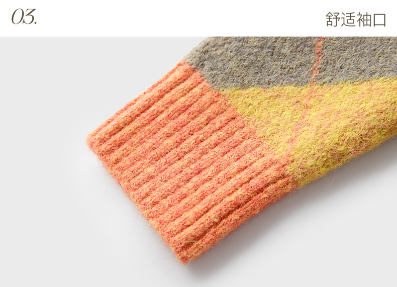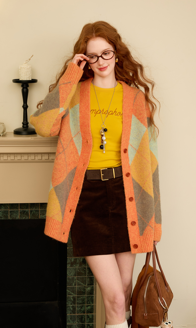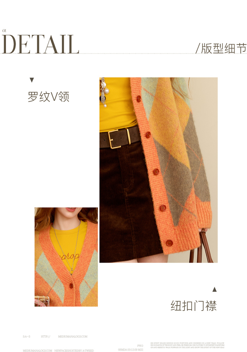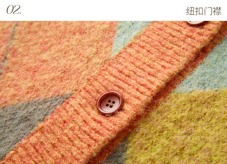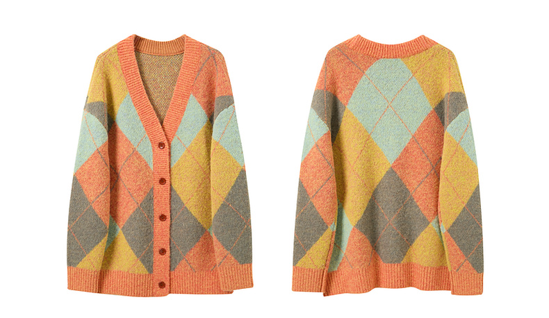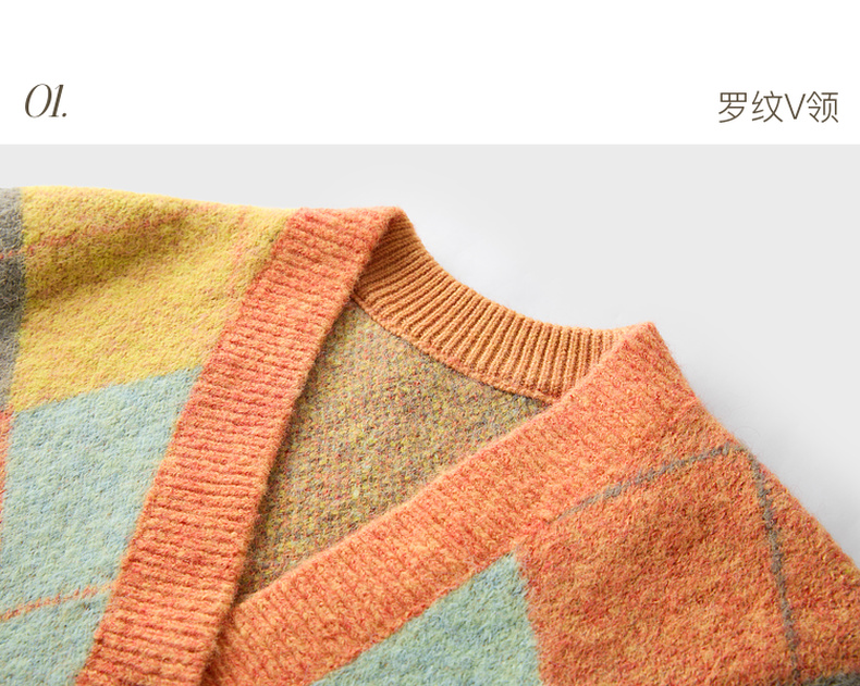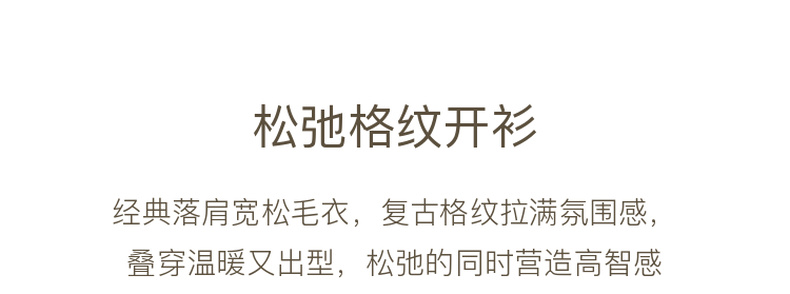 三彩2025冬季新款复古格纹V领开衫针织衫宽松落肩袖外套毛衫休闲M