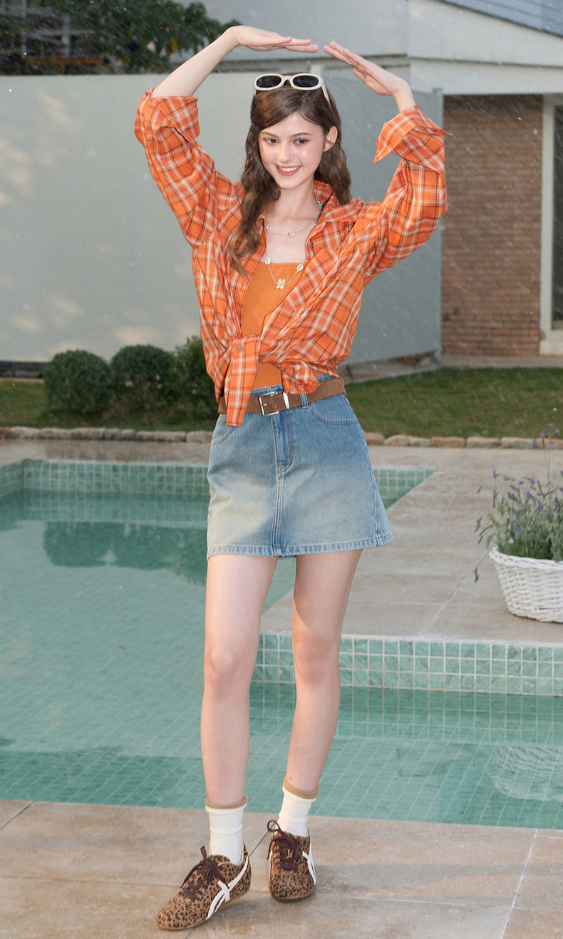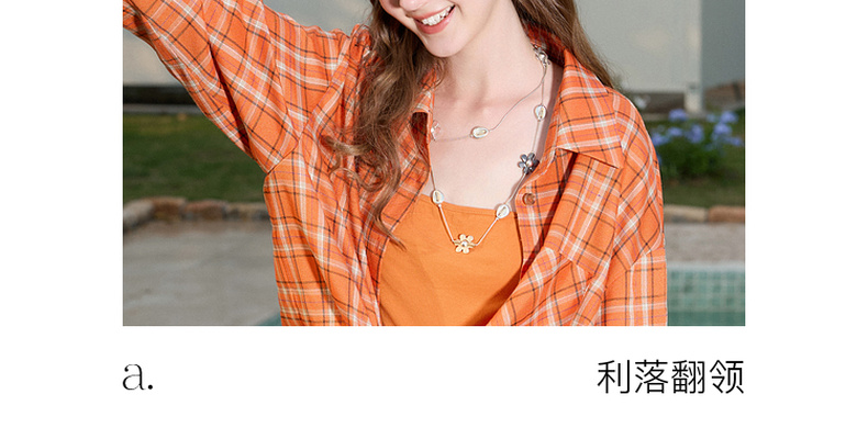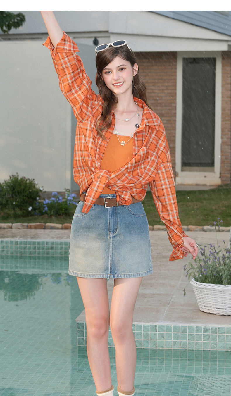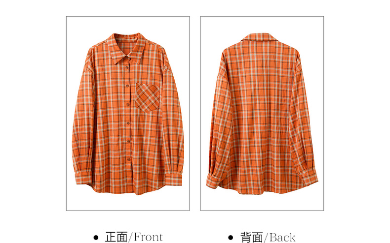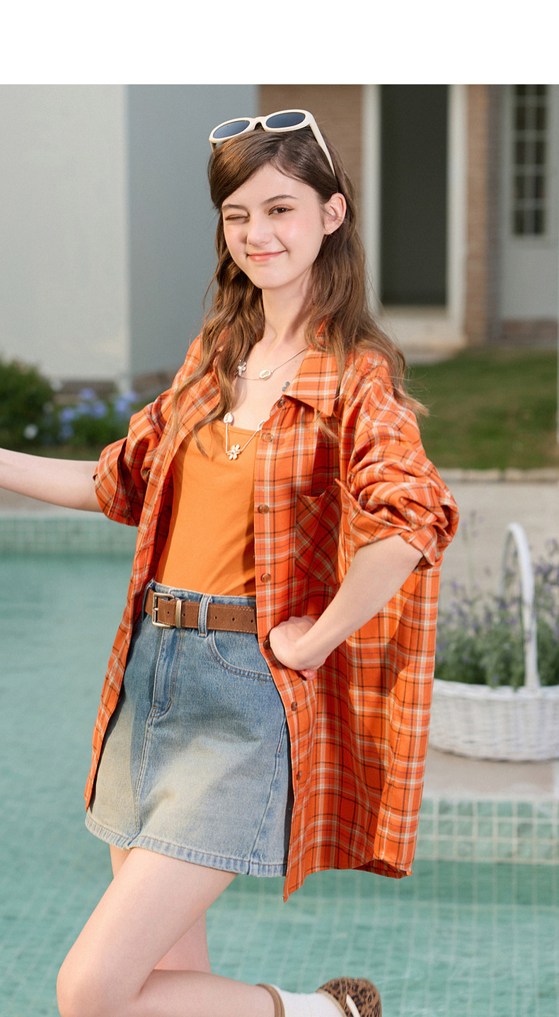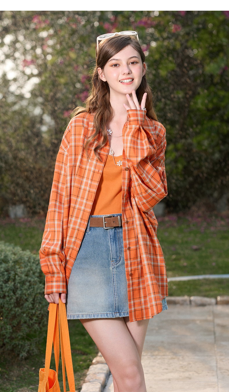 三彩独醒2026春季新款格纹衬衫口袋翻领宽松衬衣中长甜酷F