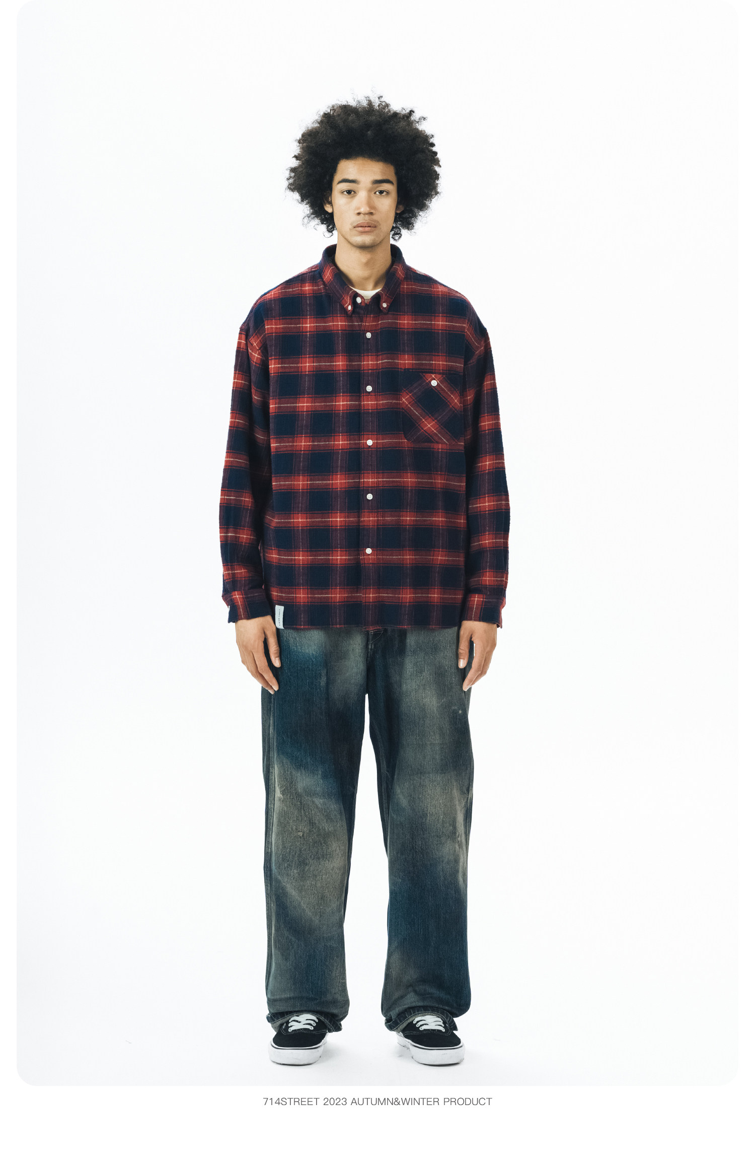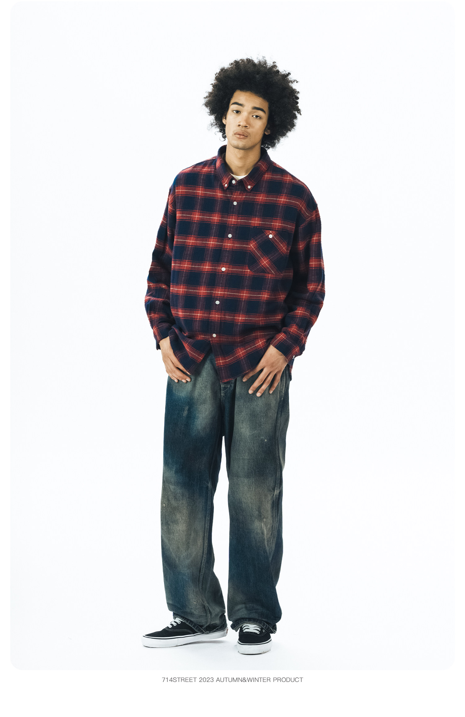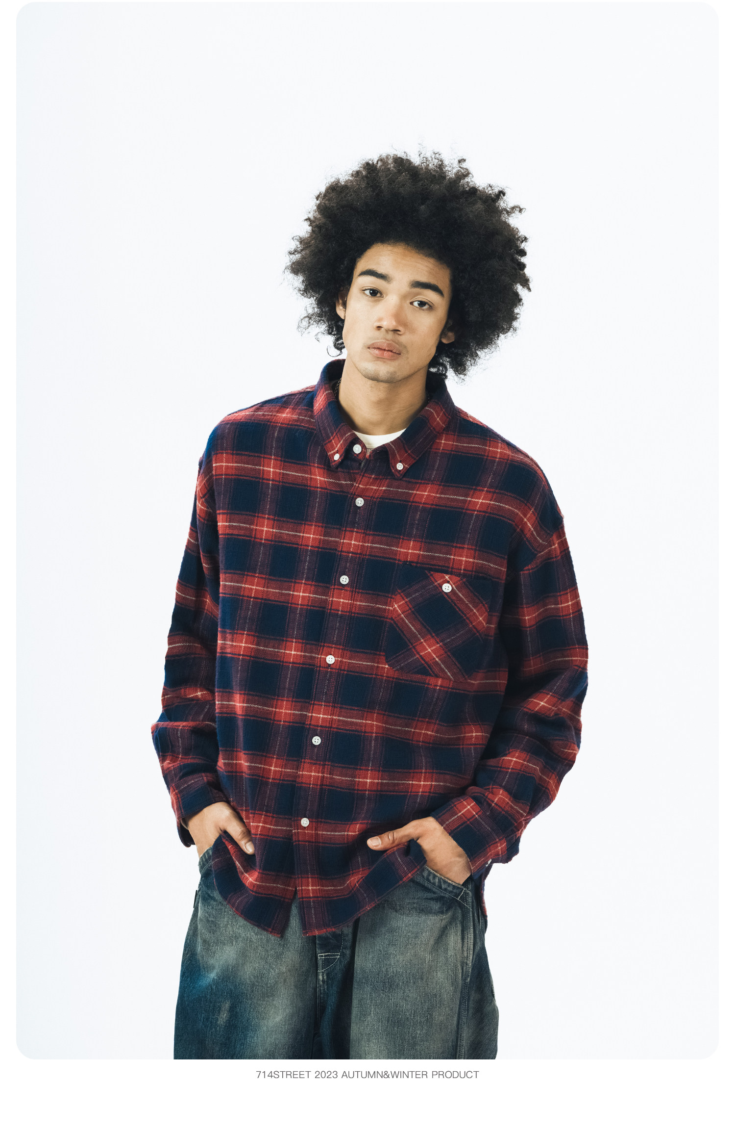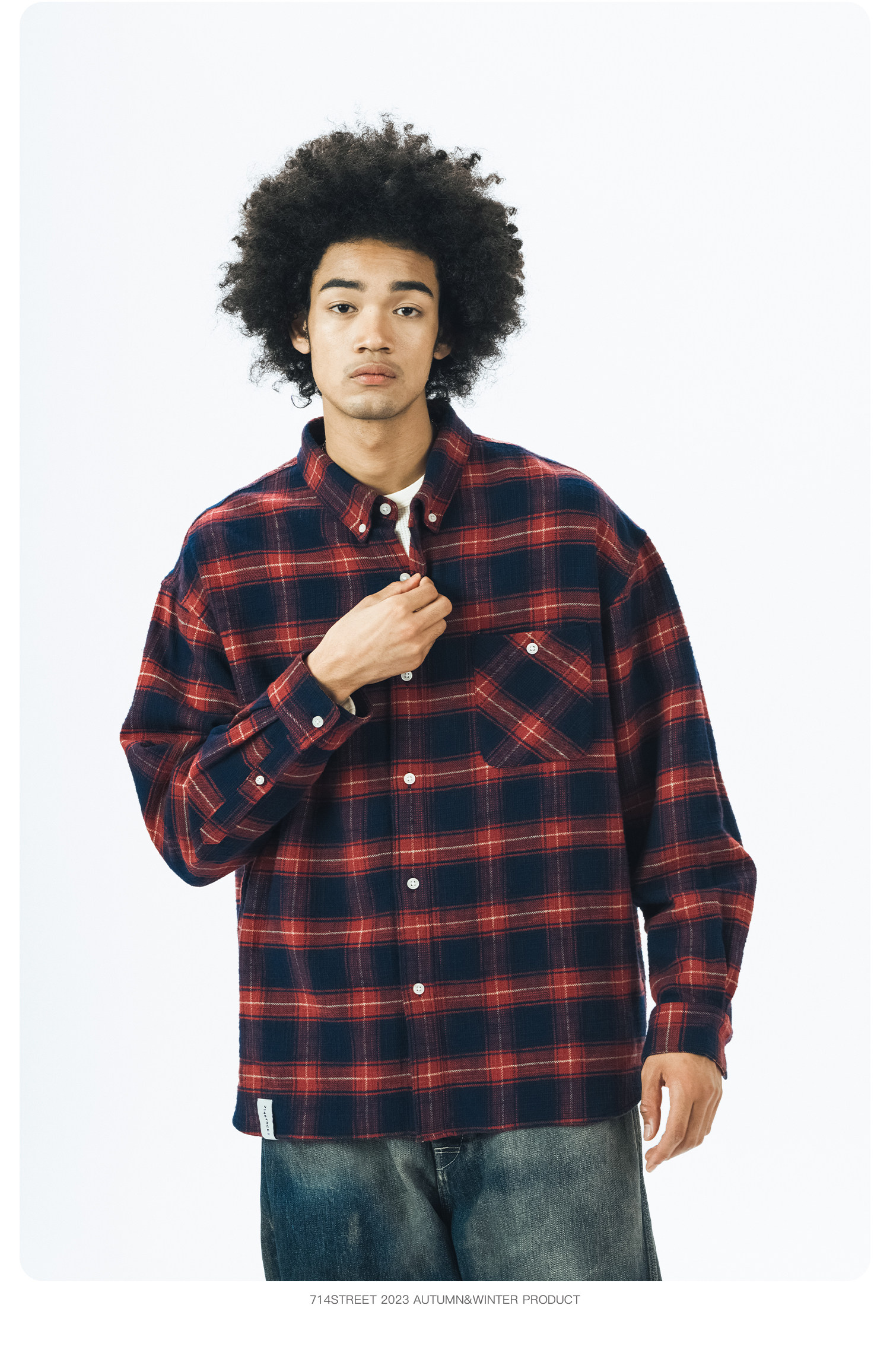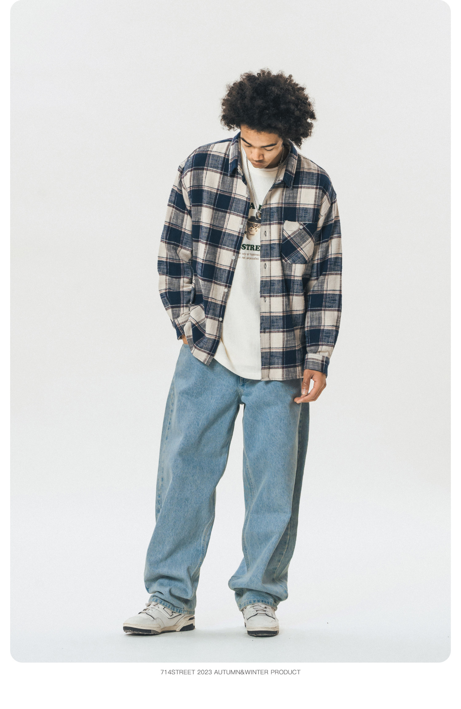 714street格子长袖衬衫男日系复古衬衣潮牌宽松上衣春季休闲外套