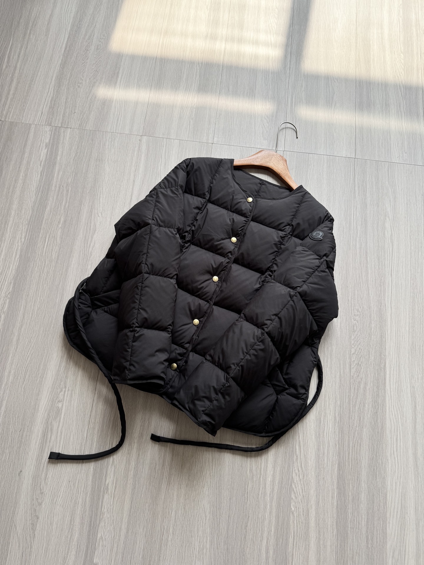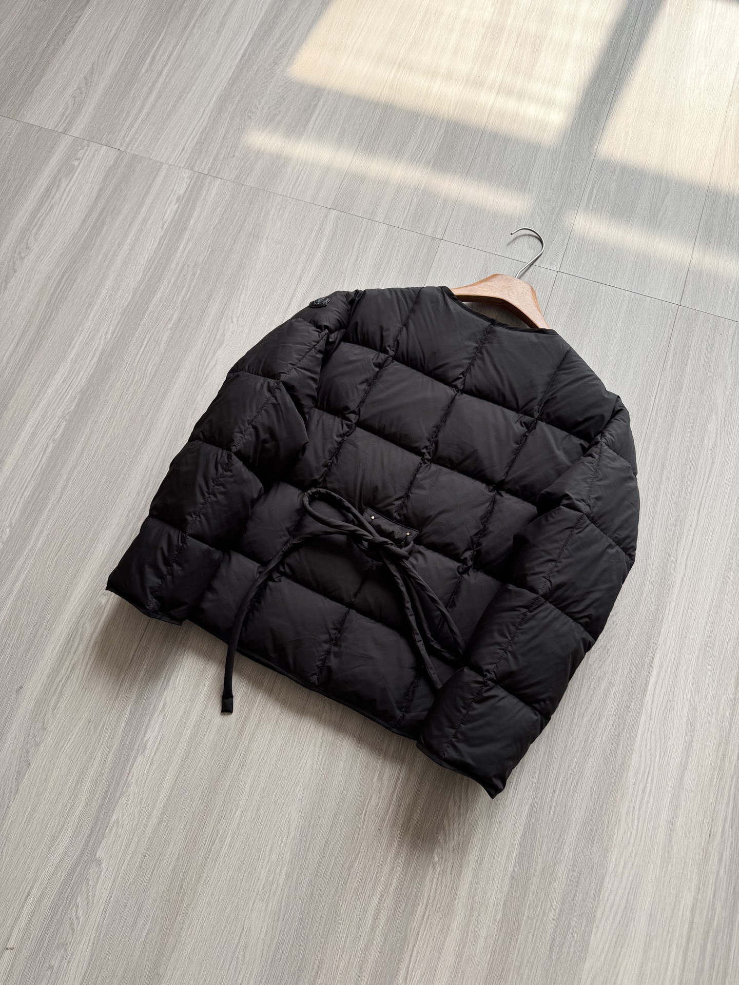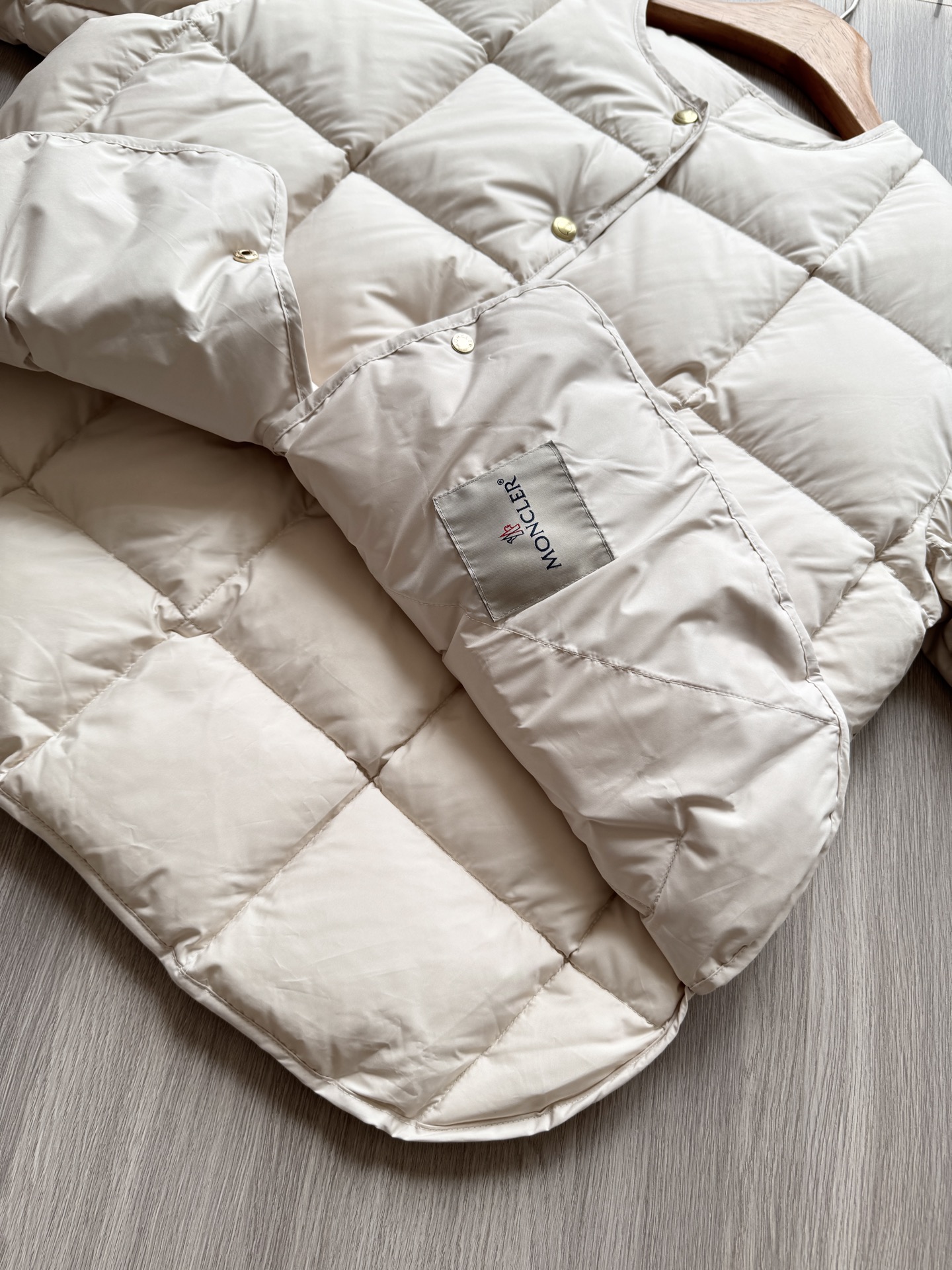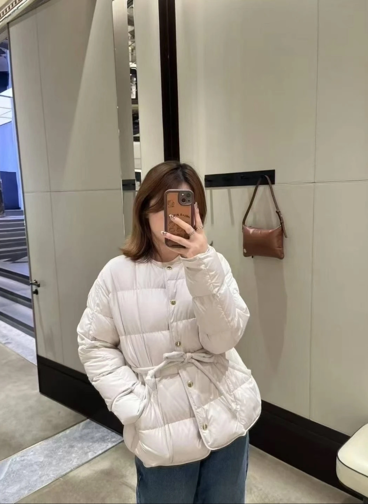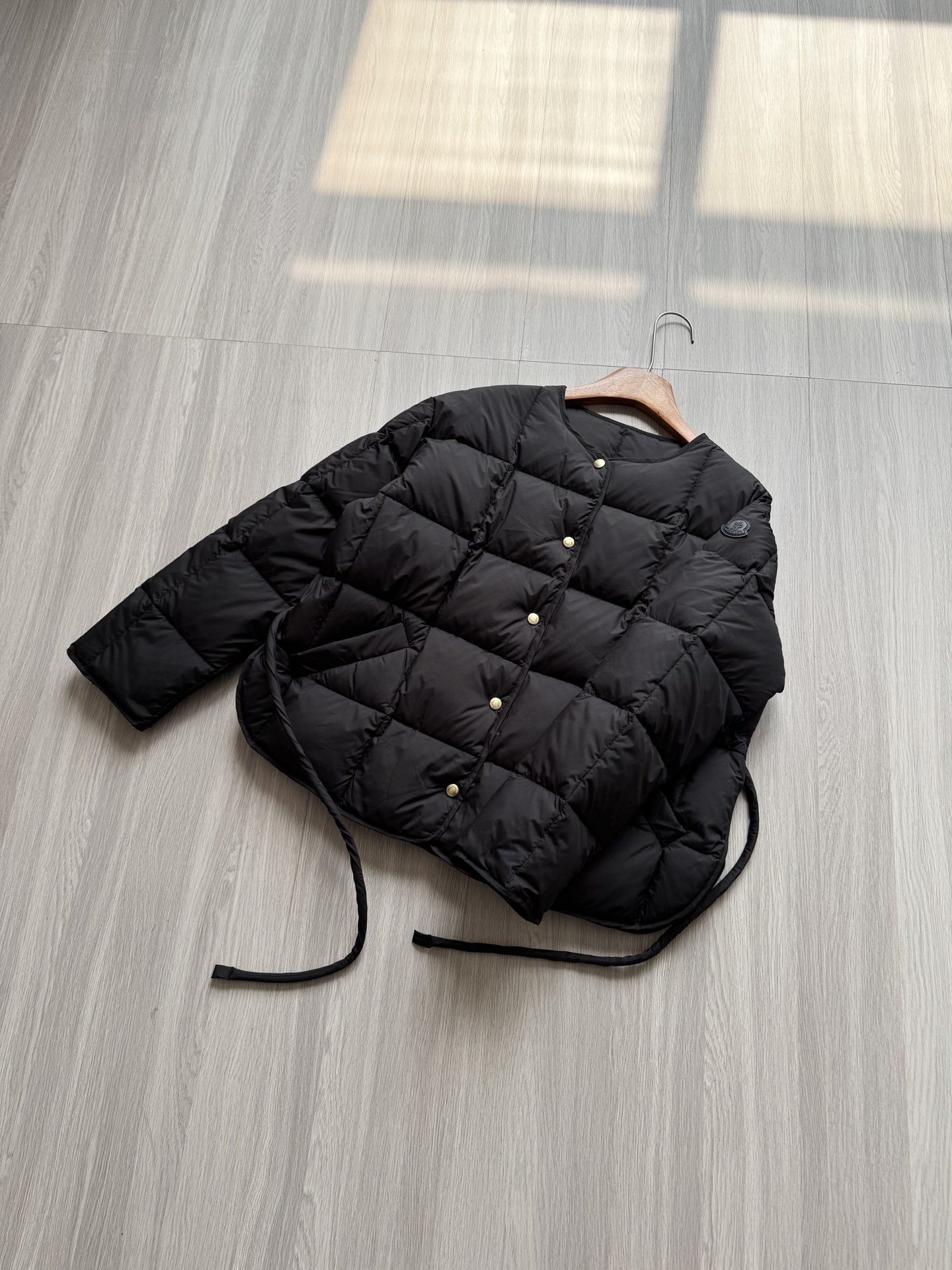 Moncler 盟可睐Caramagne 收腰羽绒服夹克外套 聚酯纤维面料制成,探索柔软廓形和材质,面料经过拉绒处理,增添纹理质感,呈现光滑外观!收腰腰带和无领设计,勾勒柔美造型,宽松版型,在寒冷天气中可轻松叠穿⚠️填充90白鹅绒羽绒 按扣开合 可拆卸腰带