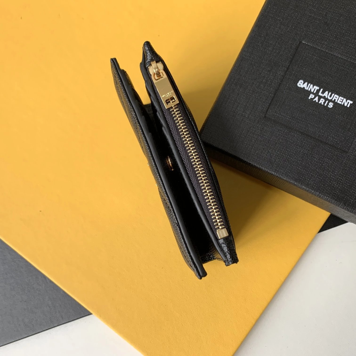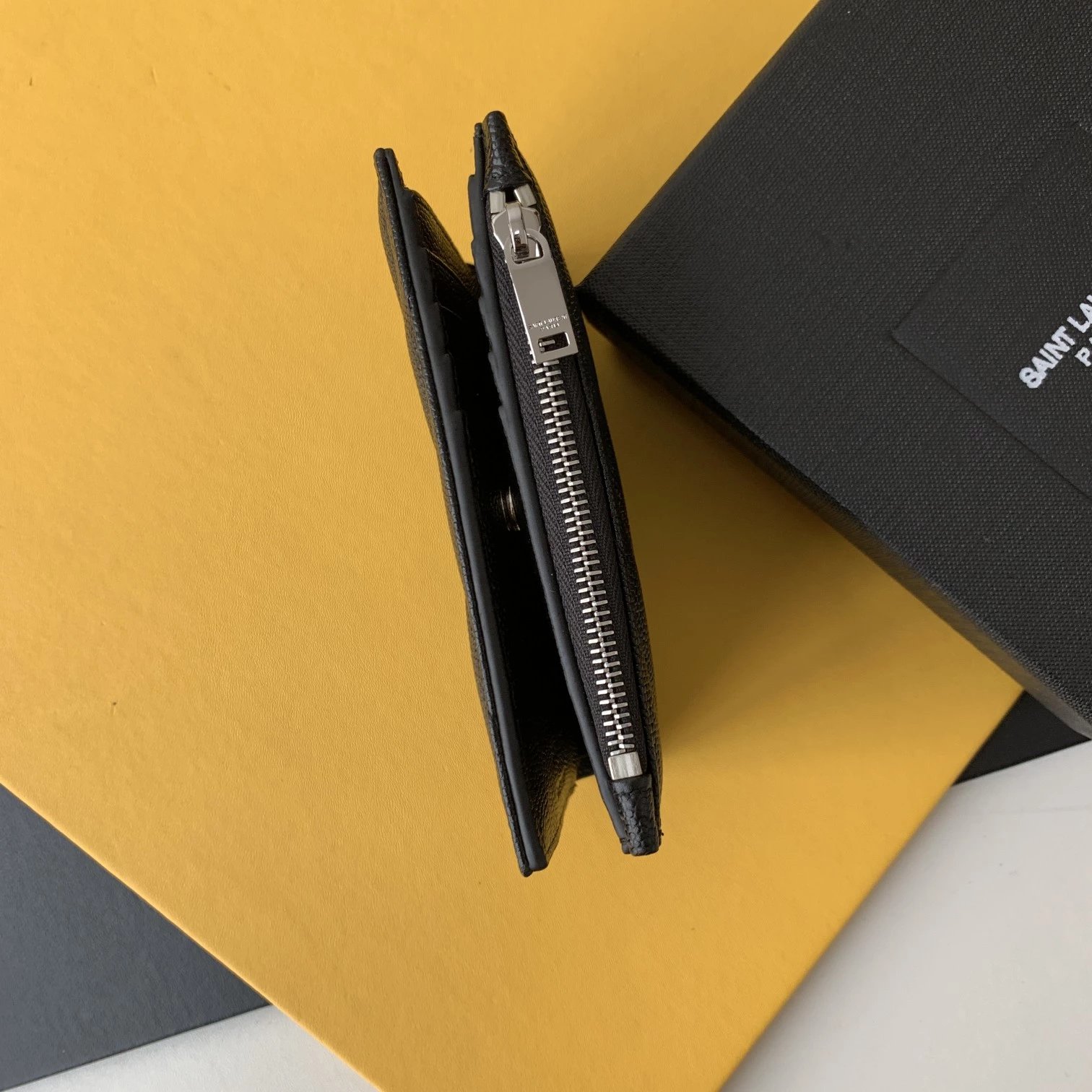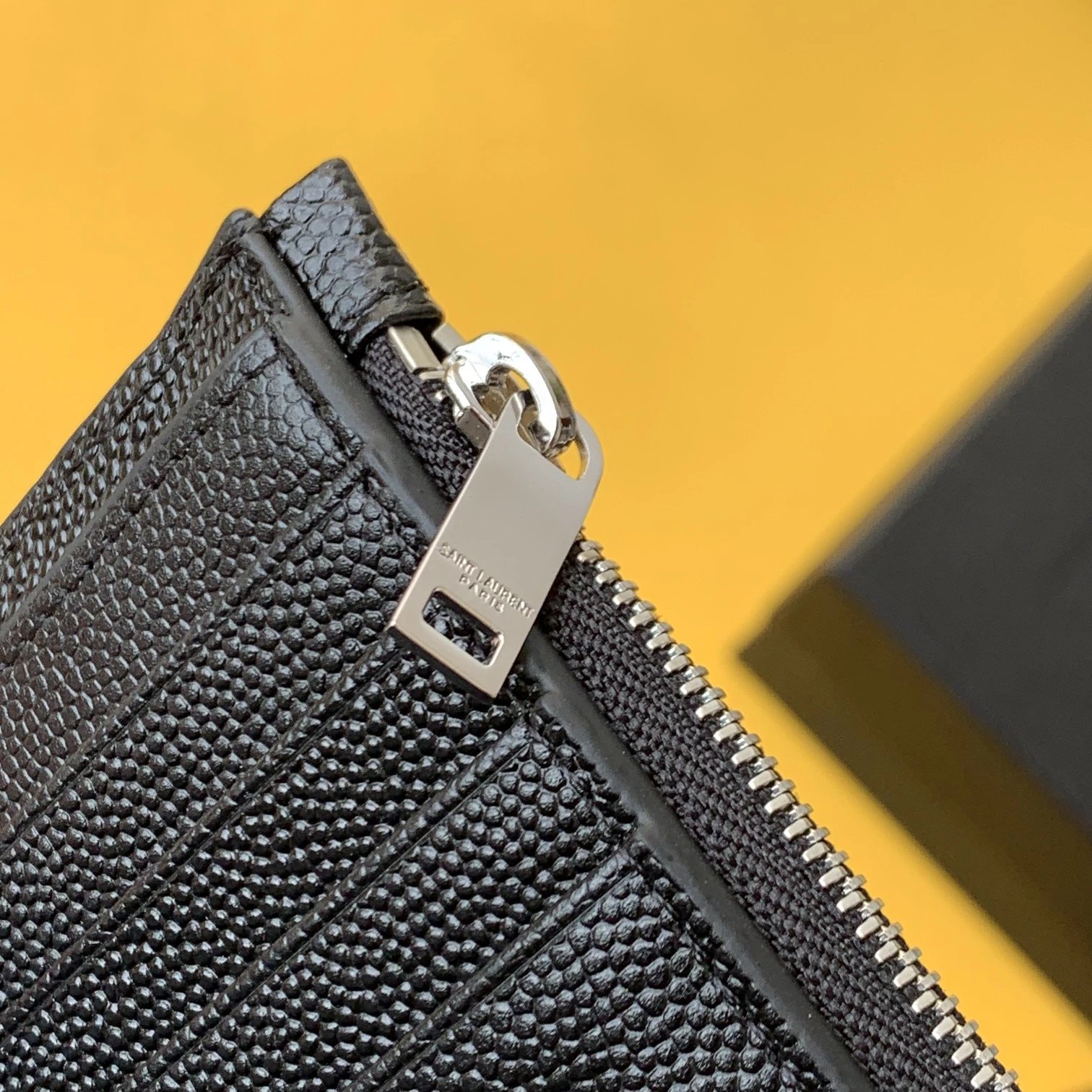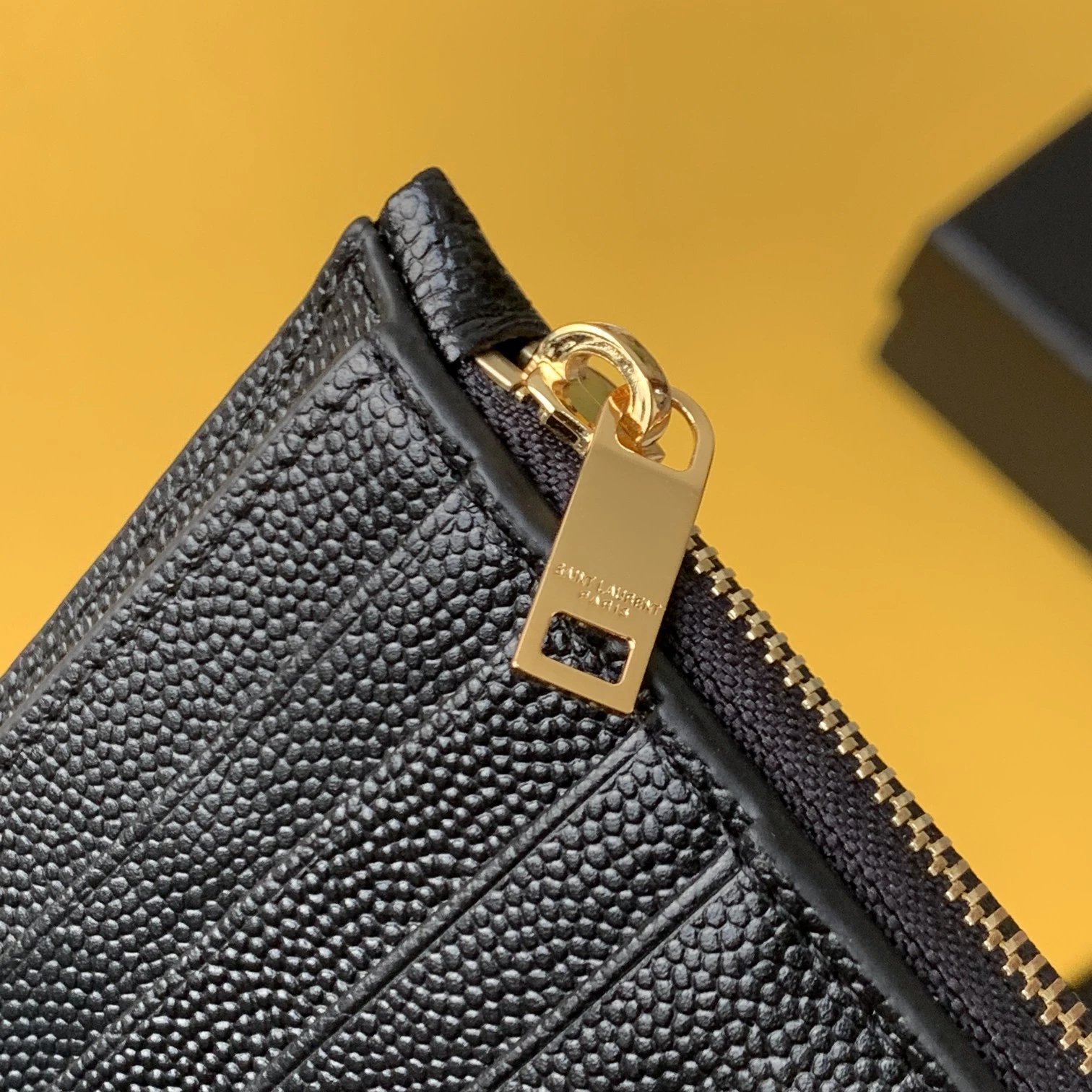 采用了颗粒纹理牛皮皮革、搭配中央金属联结YSL标志四合扣收口、8个卡位槽+2个平口袋+1个纸币插槽+1个零钱拉链袋 !