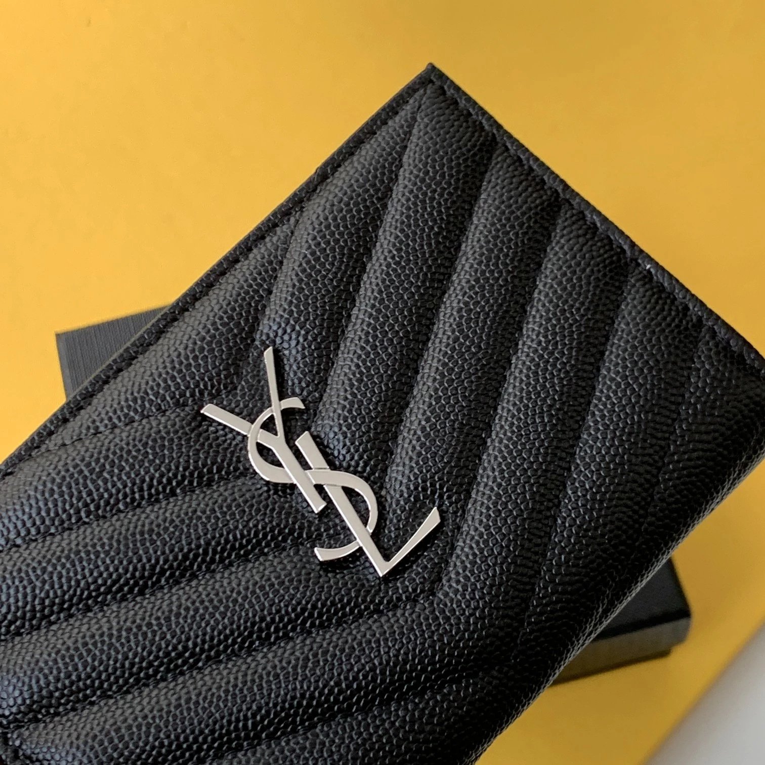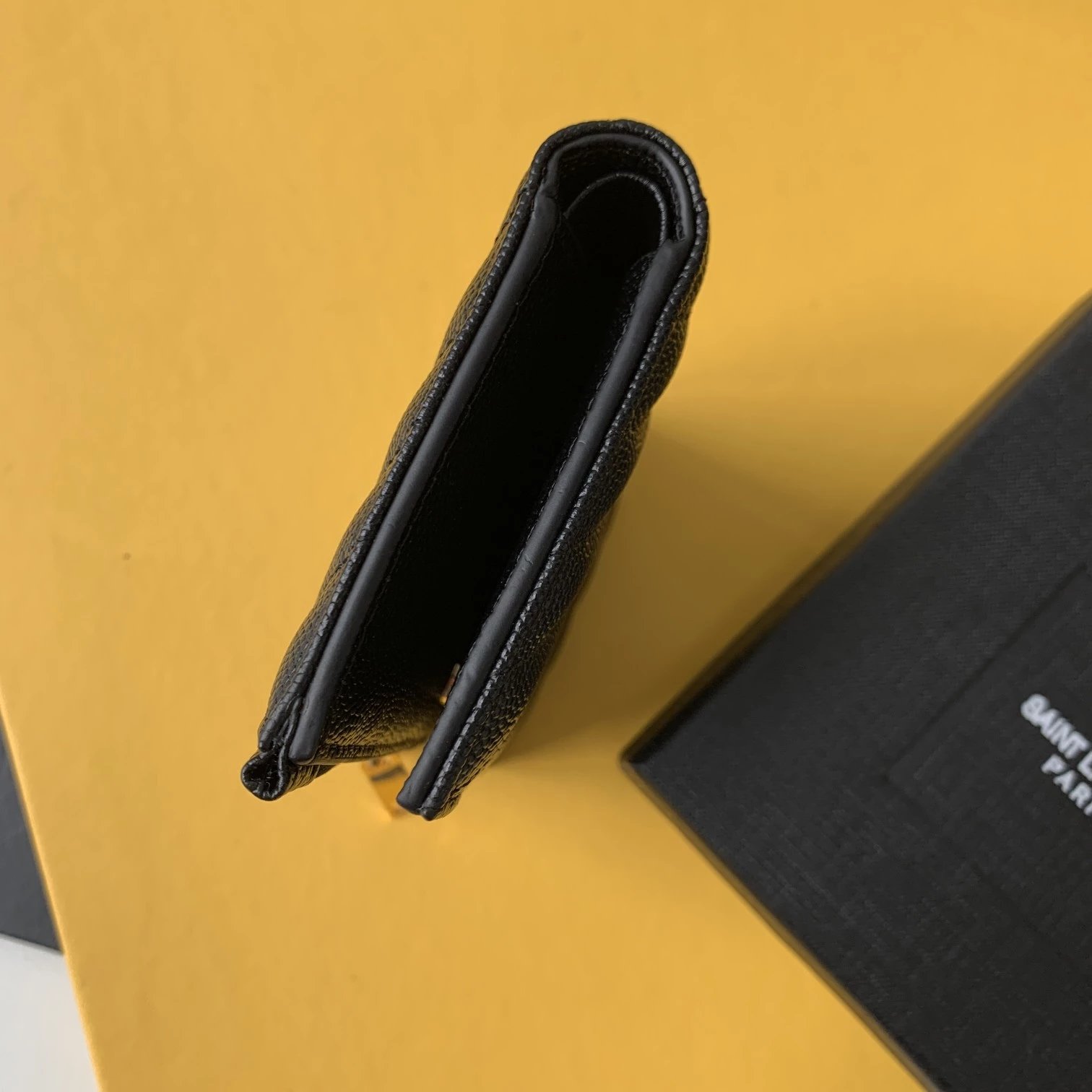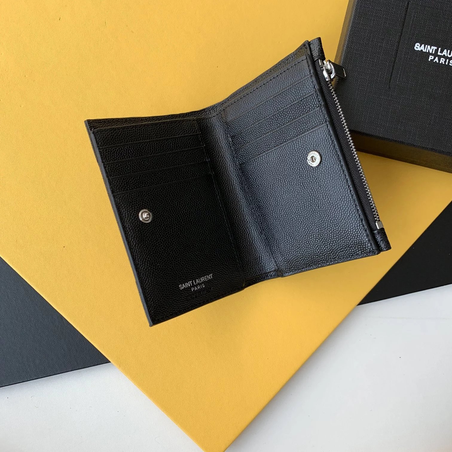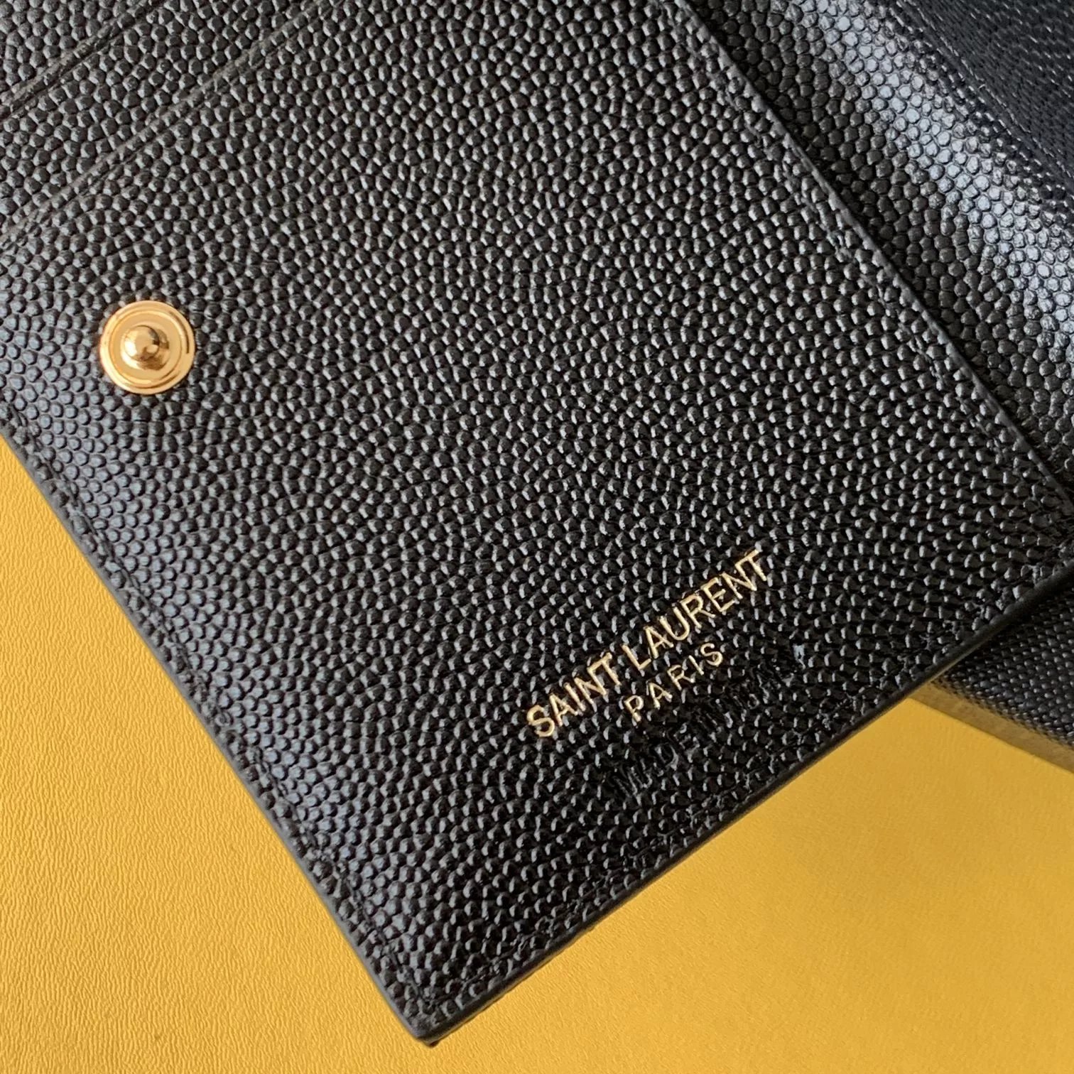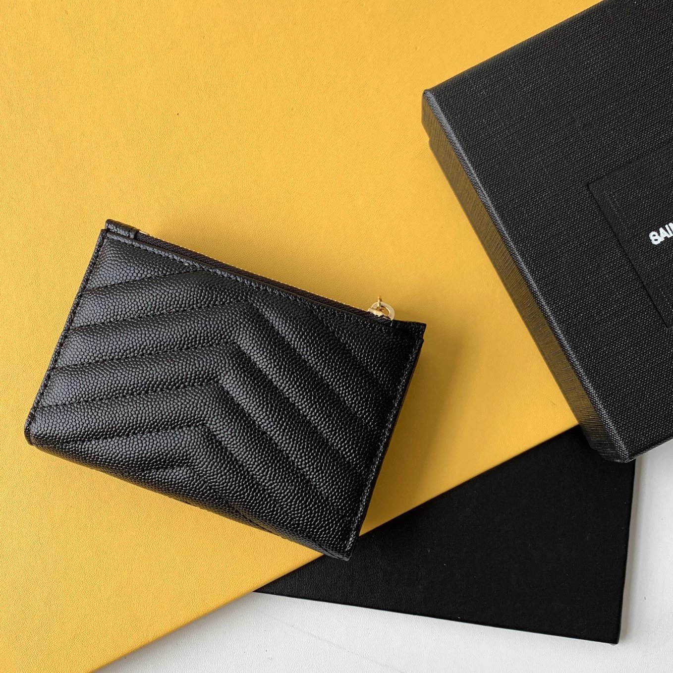 采用了颗粒纹理牛皮皮革、搭配中央金属联结YSL标志四合扣收口、8个卡位槽+2个平口袋+1个纸币插槽+1个零钱拉链袋 !