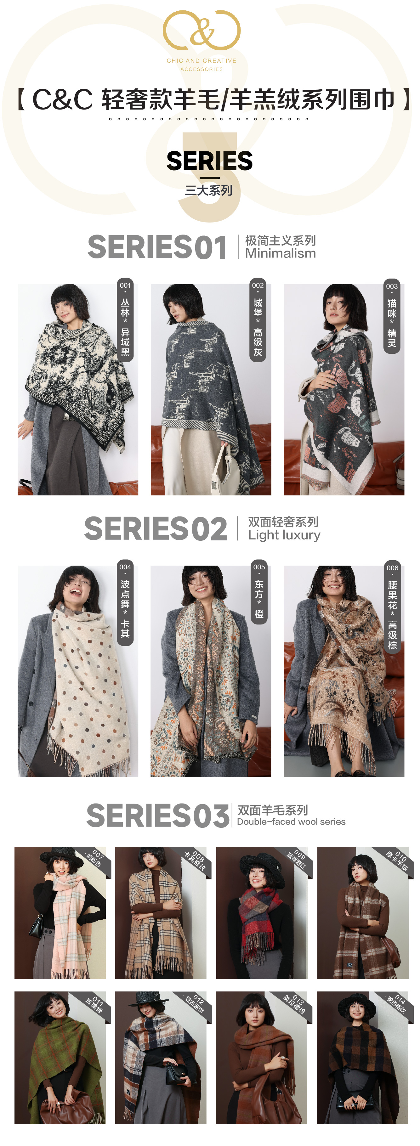 双面羊毛系列 :007奶粉色、008卡其格纹、009蓝调酒红、010摩卡米棕、011琉璃绿、012复古蓝棕、013美拉德棕、014驼色格纹