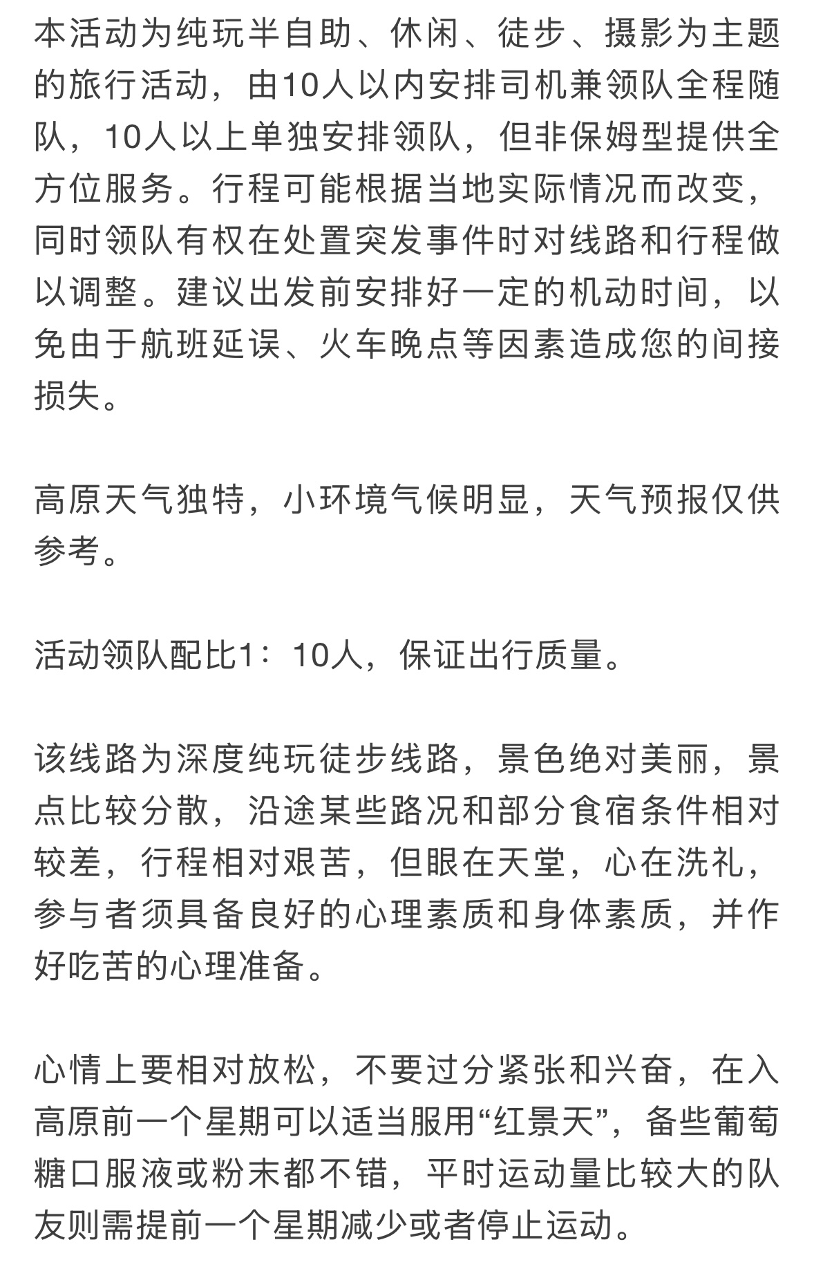 4.高反风险:部分地区海拔较高,易发生高反现象。参与者在攀登或徒步过程中应适应高原环境,避免出现高反症状。