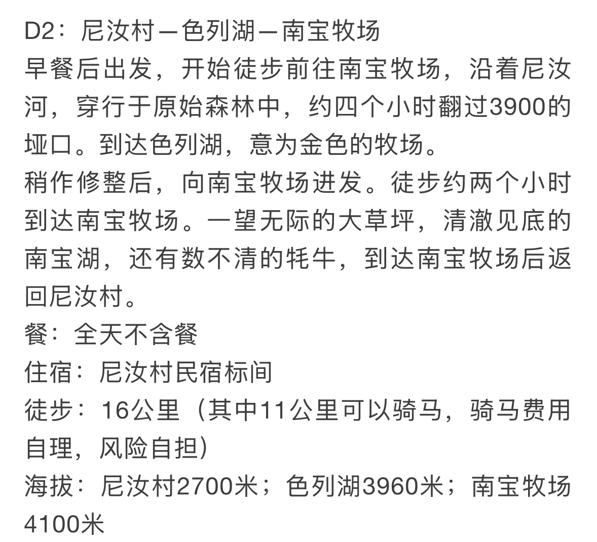 全程住宿默认双人拼房,拼不到房间需要补3晚单房差500元,节假日单房差600。餐食,个人骑马费用,个人提前下撤产生的费用。