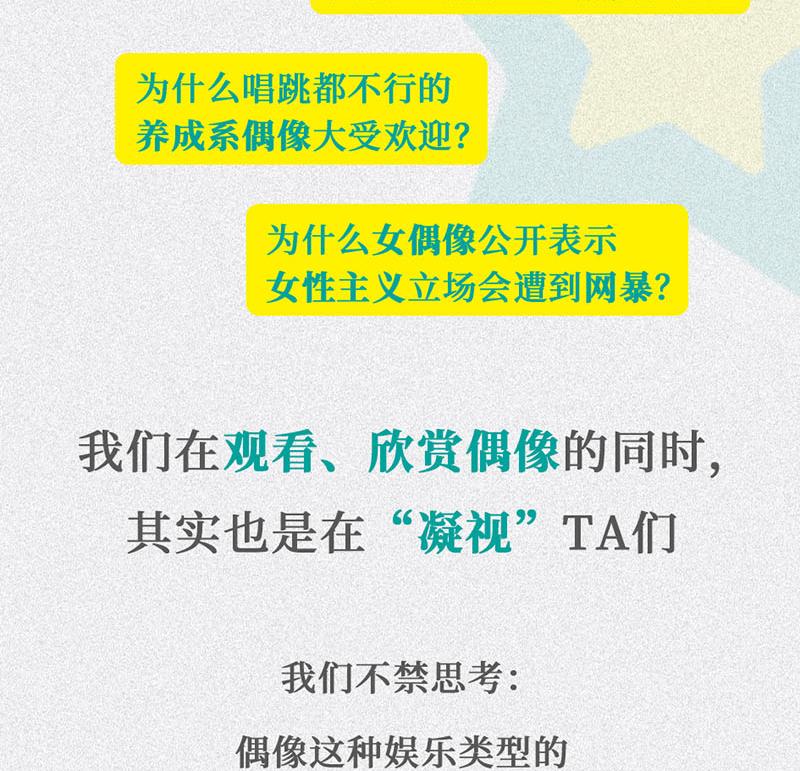 【一】关于偶像,我们往往有很多困惑……- 为什么偶像恋爱频频,会因此“脱粉回踩”?- 为什么私生现象难以遏制,为什么偶像总在贩卖人设?- 为什么唱跳都不行的养成系偶像大受欢迎?- 为什么女偶像公开表示自己的女性主义立场会遭到网暴?我们在观看、欣赏偶像的同时,其实也是在“凝视”TA们我们不禁思考:“偶像这种娱乐类型的特有魅力到底是什么呢?‘观看偶像’究竟是种怎样的行为?”