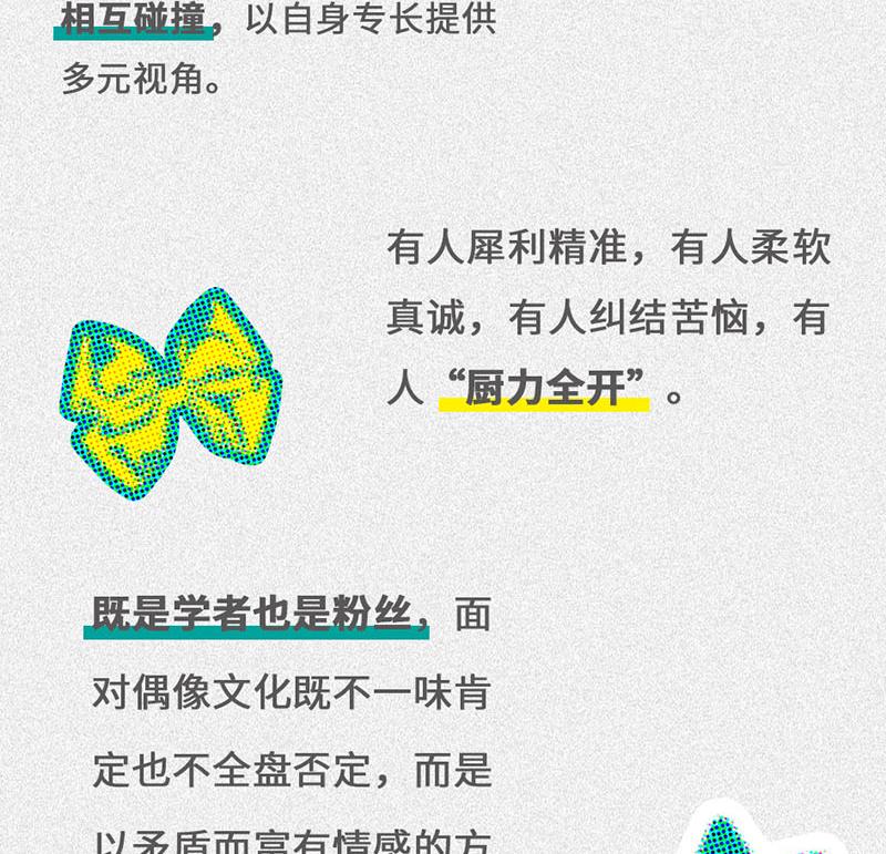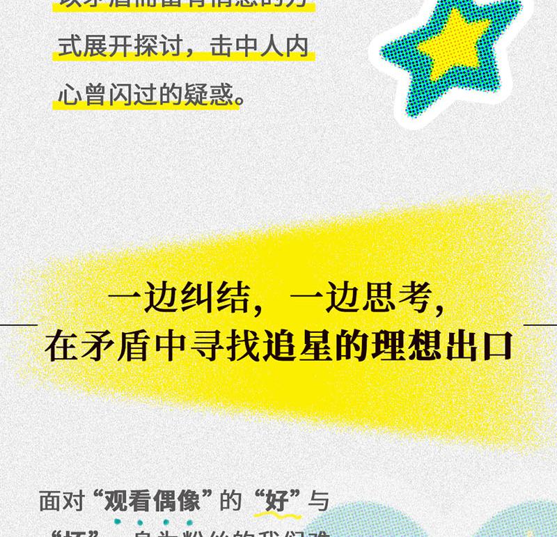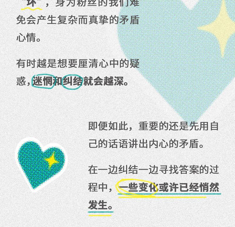 【四】一边纠结,一边思考,在矛盾中寻找追星的理想出口。这是以爱意联结彼此的活动:偶像和给彼此带来快乐,从对方身上收获能量,在不计回报的互相给予中爱与被爱;这也是催生负面情绪的活动:被人气与流量绑架,因过分的占有欲受伤,对消费一个活生生的人的苦恼……不愿伤害自己爱的人——或许正是出于这样的善意,会产生复杂而真挚的矛盾心情。甚至有时越是想要厘清心中的疑惑,迷惘和纠结就会越深。重要的是先用自己的话语讲出内心的矛盾,在一边纠结一边寻找答案的过程中,一些变化或许已经悄然发生。