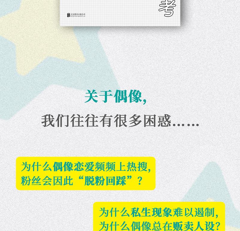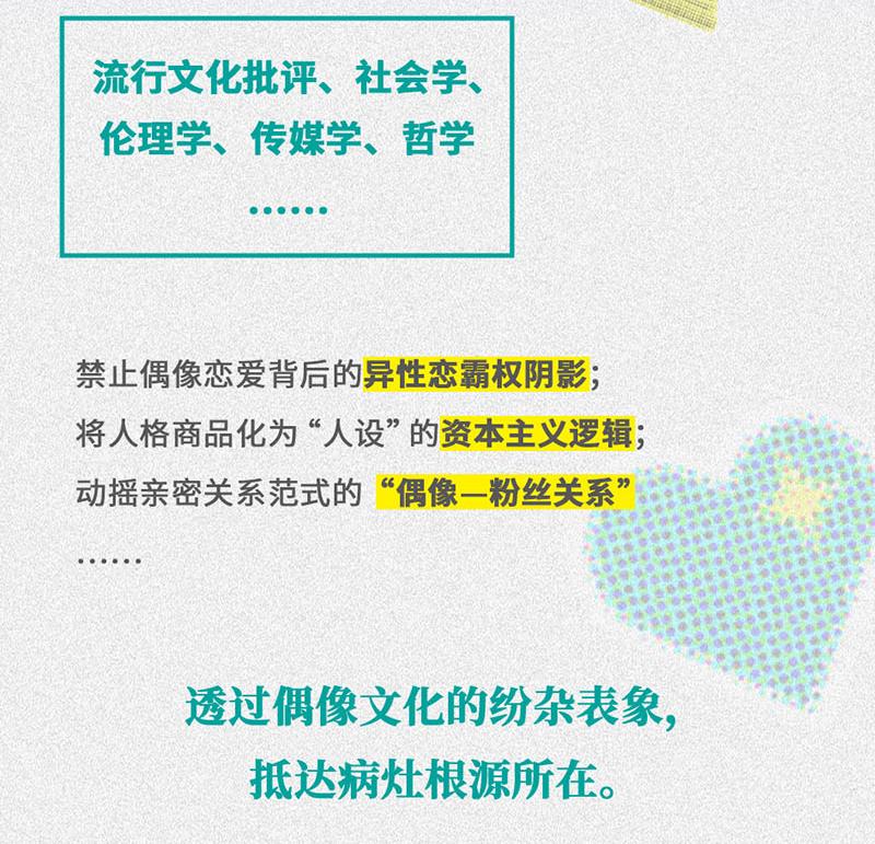 【三】九位“饭圈学术大佬”化追星热情为研究动力,解析充满矛盾的偶像文化!流行文化批评家、性别与社会学研究者、媒体撰稿人、游戏编剧、同人志写手……身份各异的九人,交叉学科相互碰撞,以自身专长提供多元视角。有人犀利精准,有人柔软真诚,有人纠结苦恼,有人“厨力全开”。既是学者也是,面对偶像文化既不一味肯定也不全盘否定,而是以矛盾而富有情感的方式展开探讨,击中人内心曾闪过的疑惑。