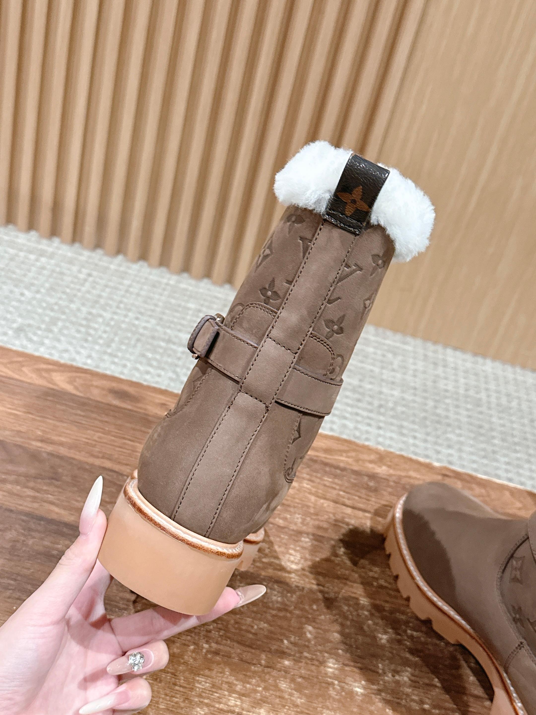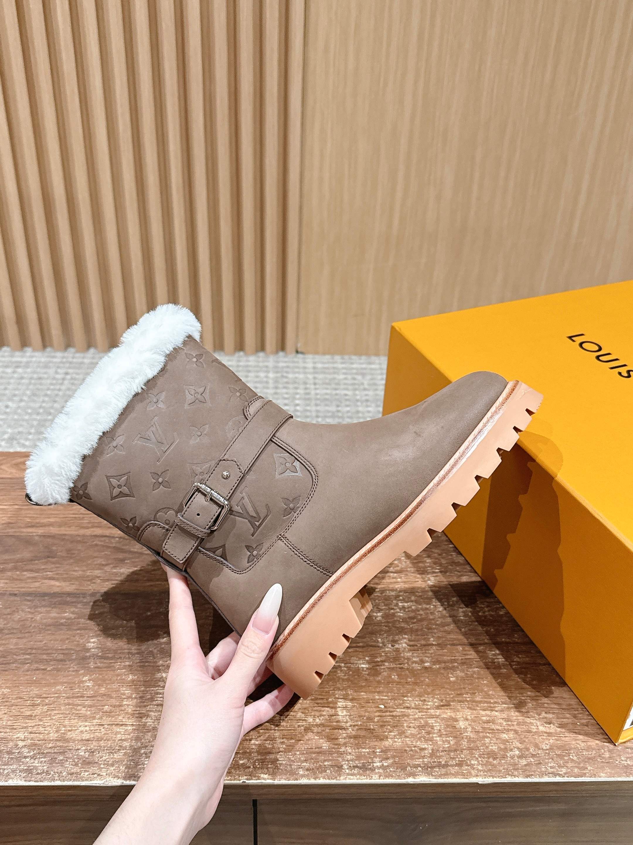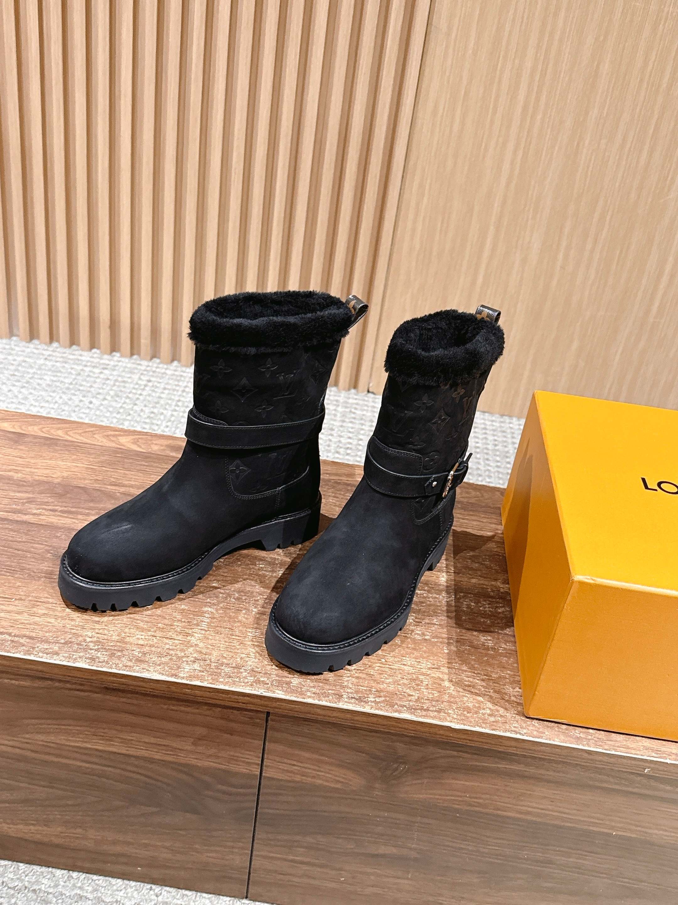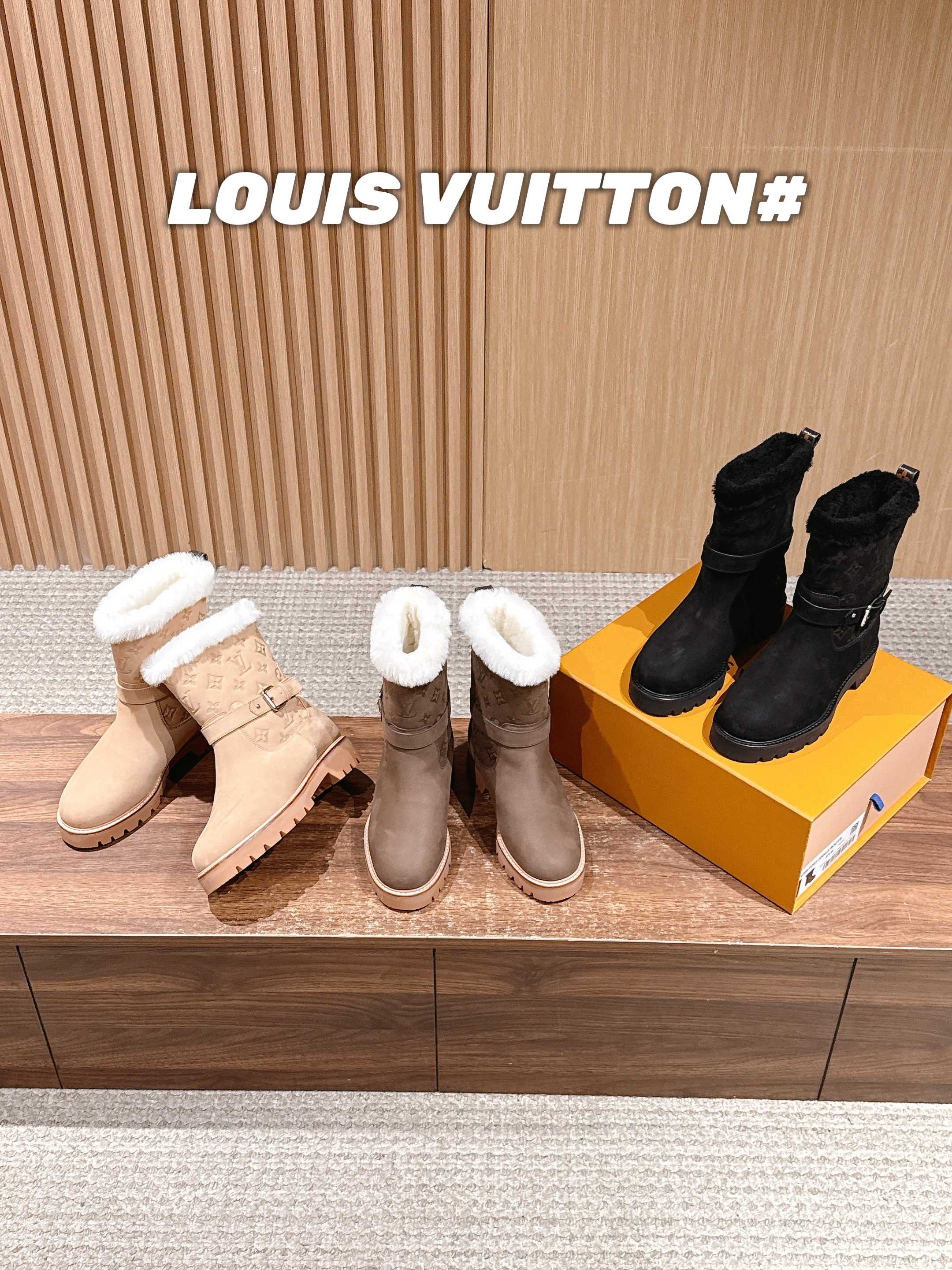 𝐋𝐨𝐮𝐢𝐬 𝐕𝐮𝐢𝐭𝐭𝐨𝐧 𝐓𝐞𝐧𝐢𝐭𝐨𝐫𝐲 #及裸靴 驴牌秋冬新款羊毛靴 本款及踝靴为正绒面牛皮革局部压印 Monogram 图案,搭配稳固橡胶外底。舒适羊毛皮内衬在靴筒顶部以包边形式呈现。莹泽搭扣与饰钉点亮腰带风格饰带。 Size:35-39(40/41定制不退换)