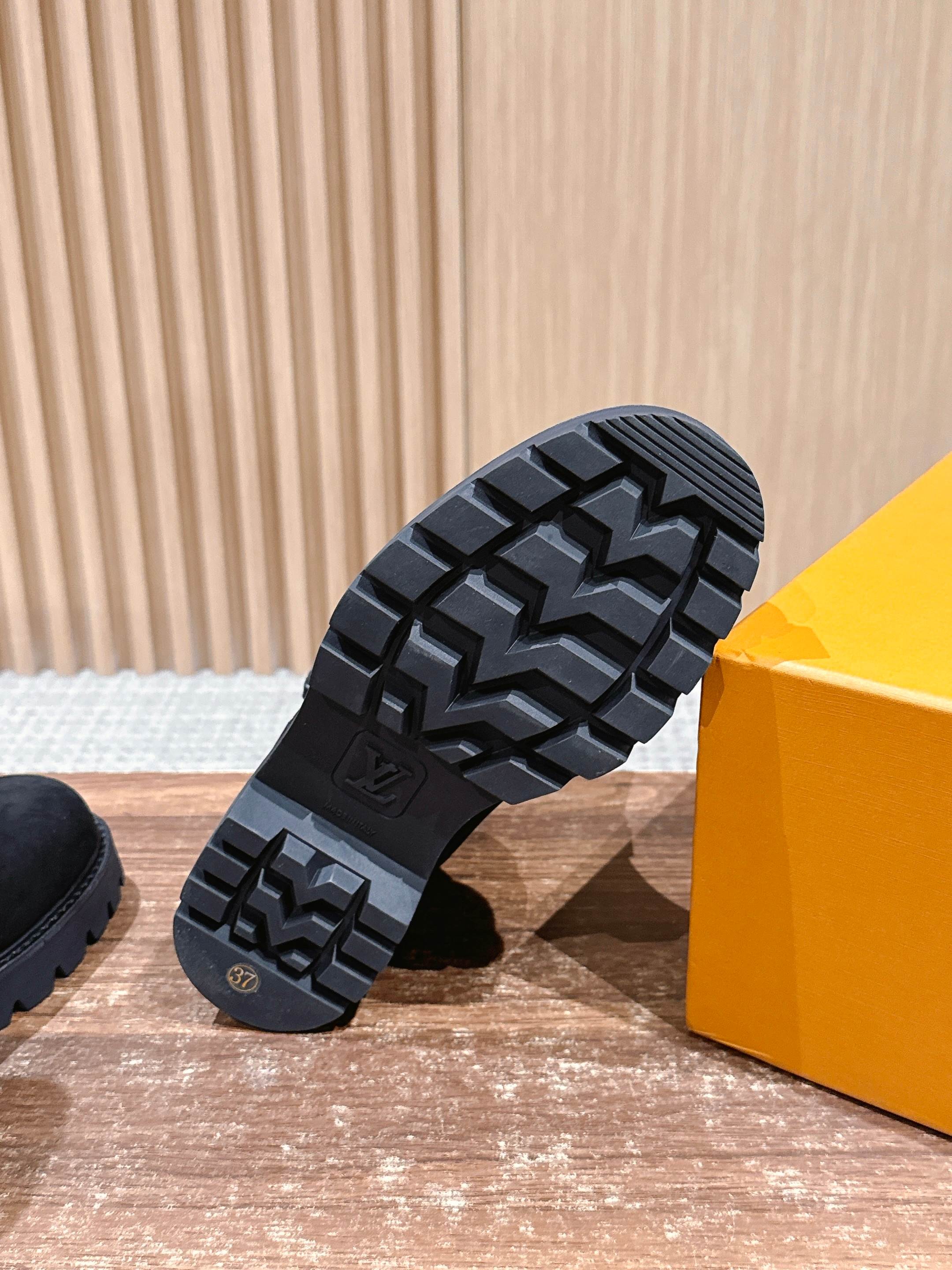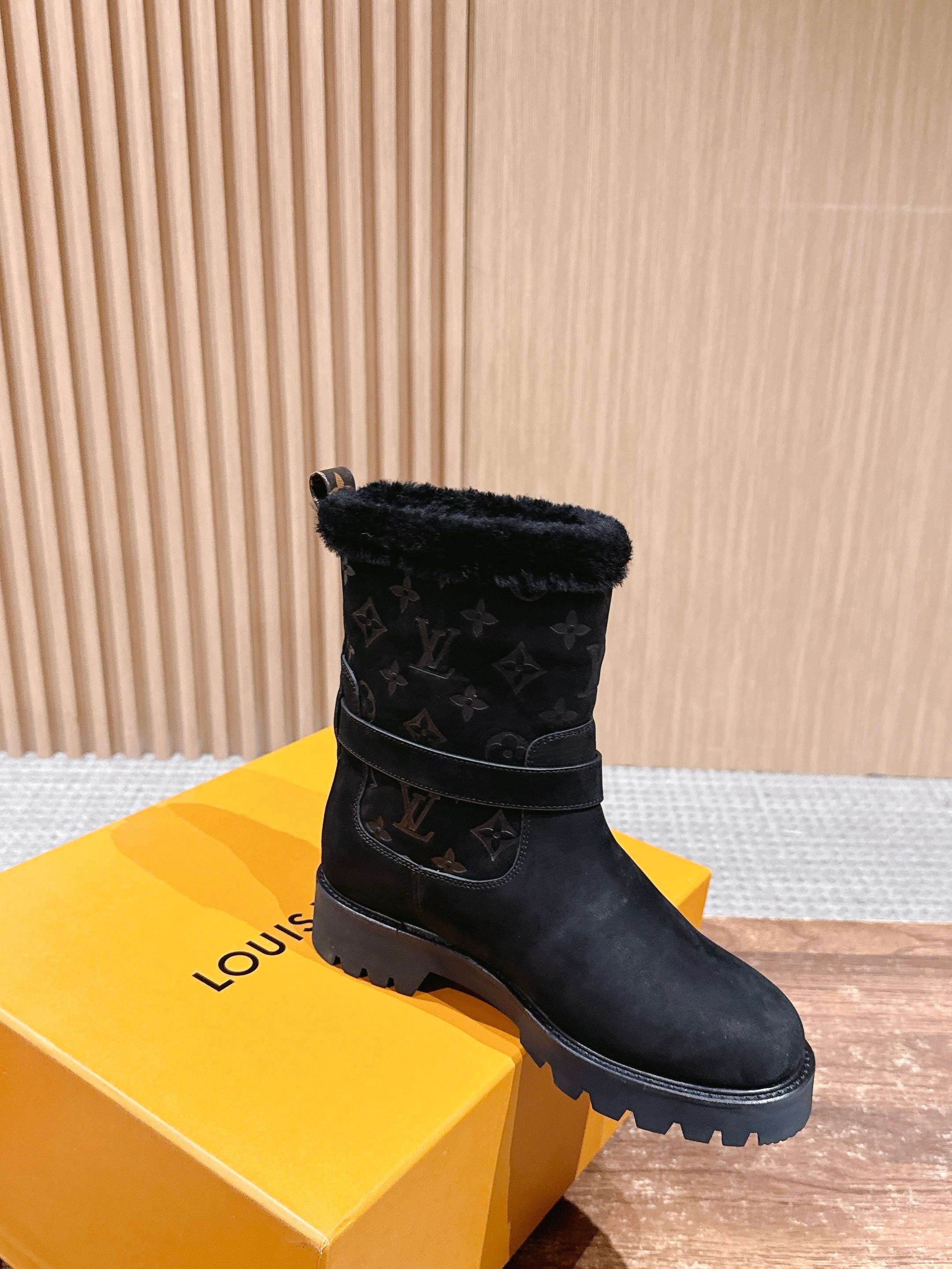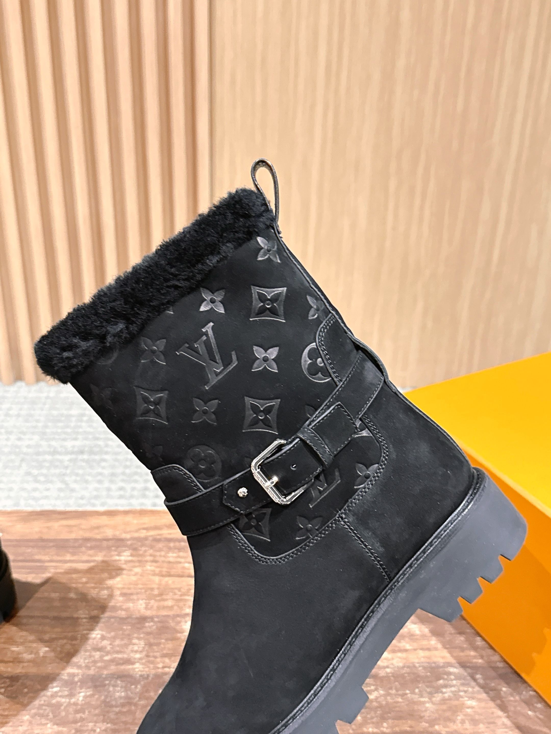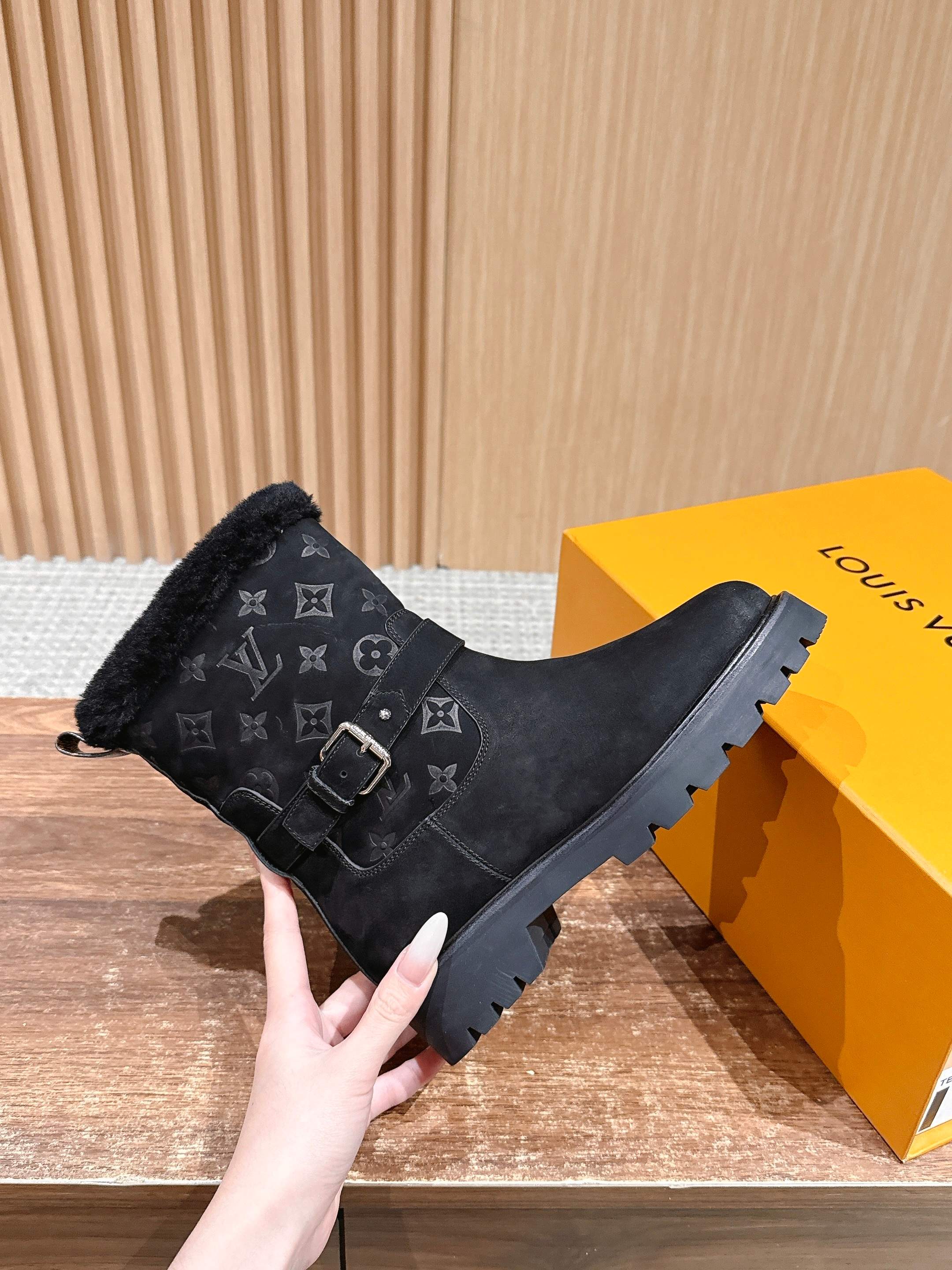 𝐋𝐨𝐮𝐢𝐬 𝐕𝐮𝐢𝐭𝐭𝐨𝐧 𝐓𝐞𝐧𝐢𝐭𝐨𝐫𝐲 #及裸靴 驴牌秋冬新款羊毛靴 本款及踝靴为正绒面牛皮革局部压印 Monogram 图案,搭配稳固橡胶外底。舒适羊毛皮内衬在靴筒顶部以包边形式呈现。莹泽搭扣与饰钉点亮腰带风格饰带。 Size:35-39(40/41定制不退换)