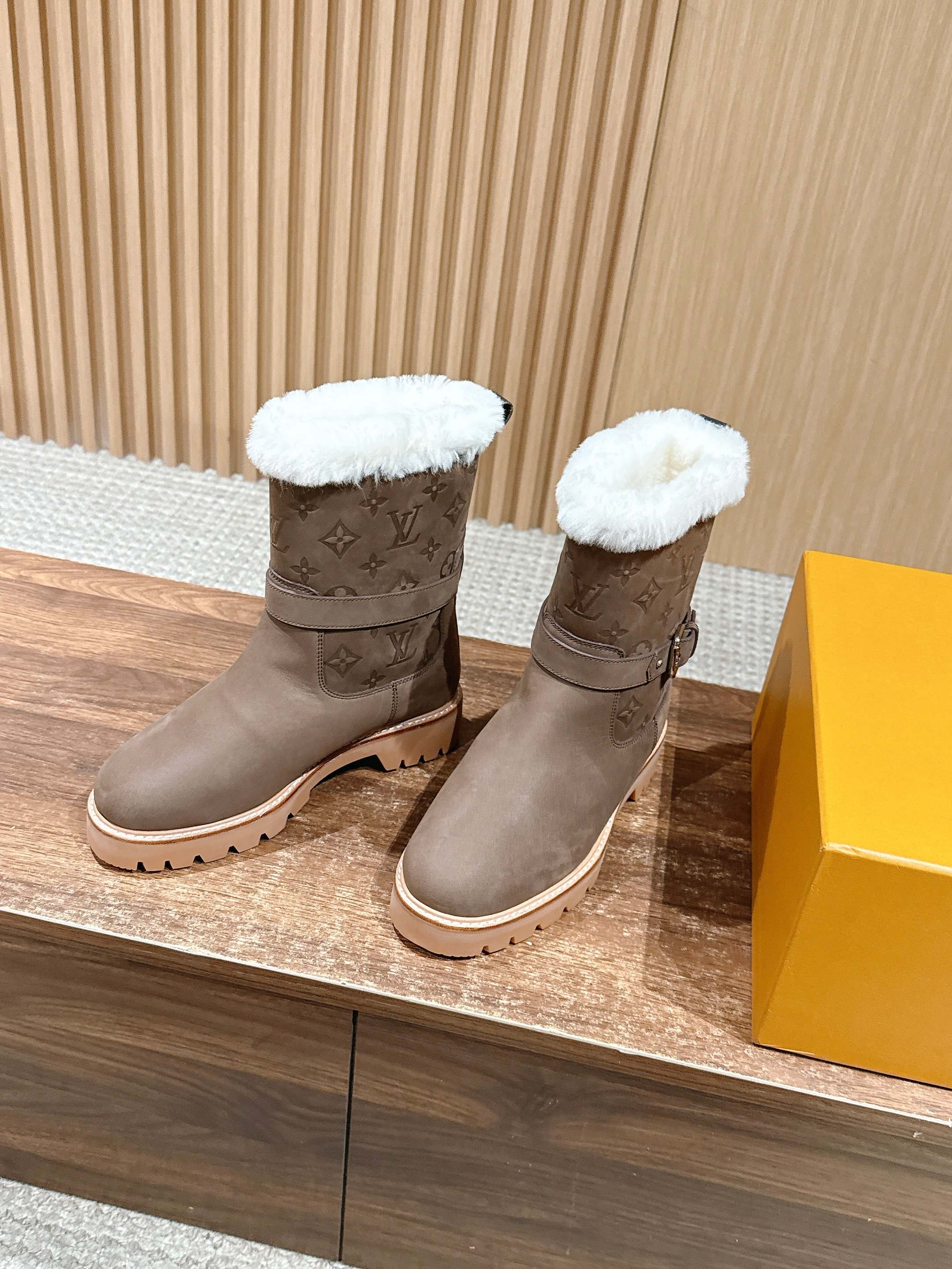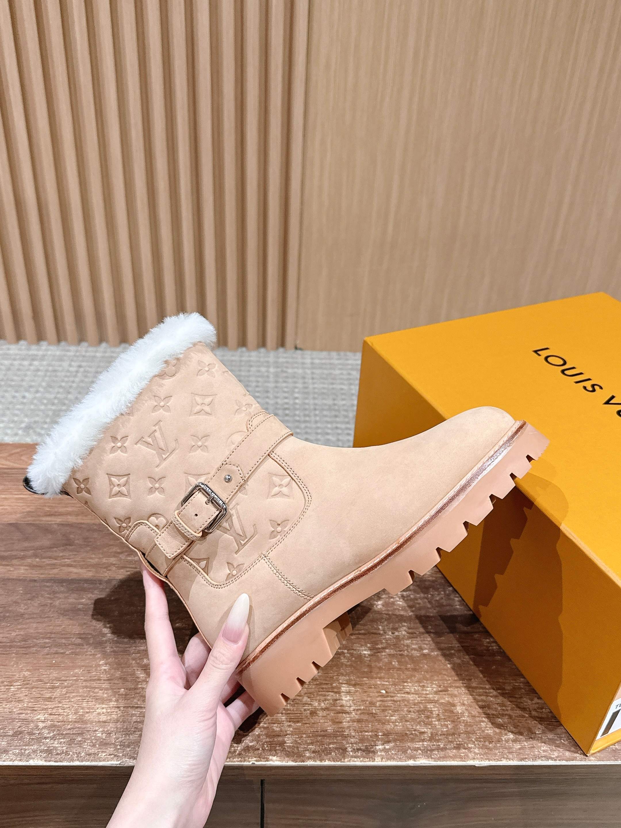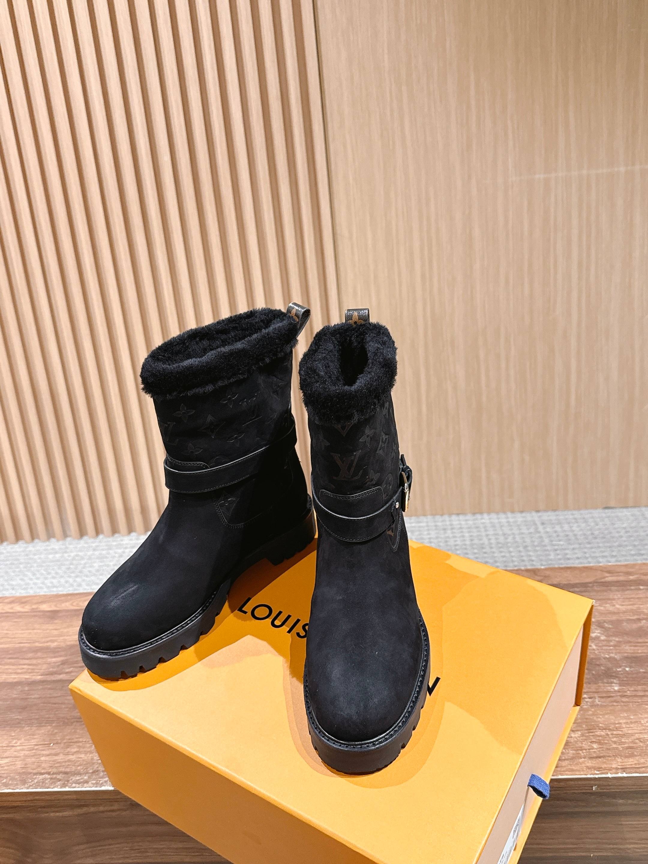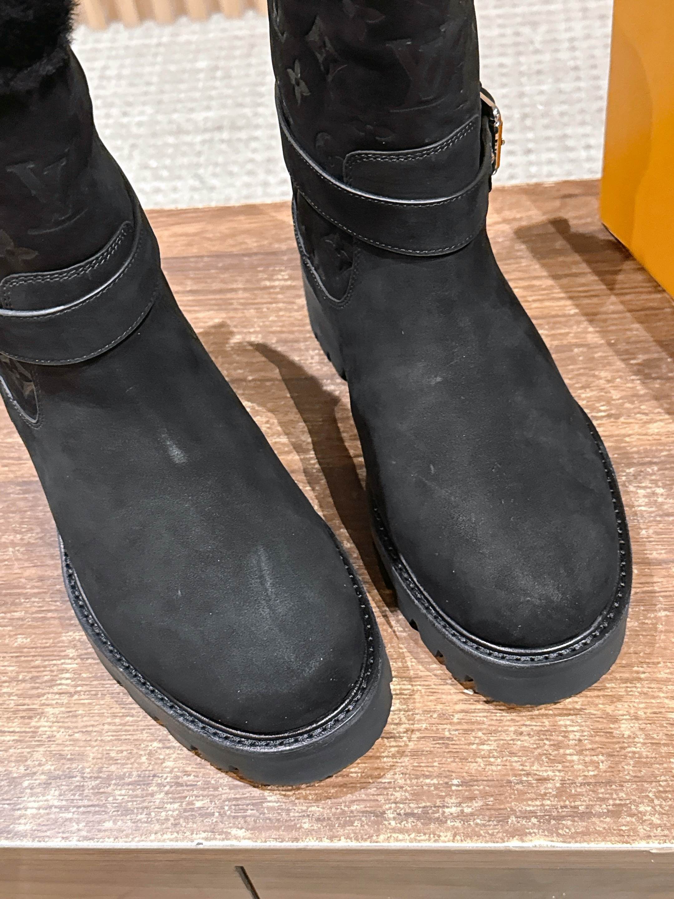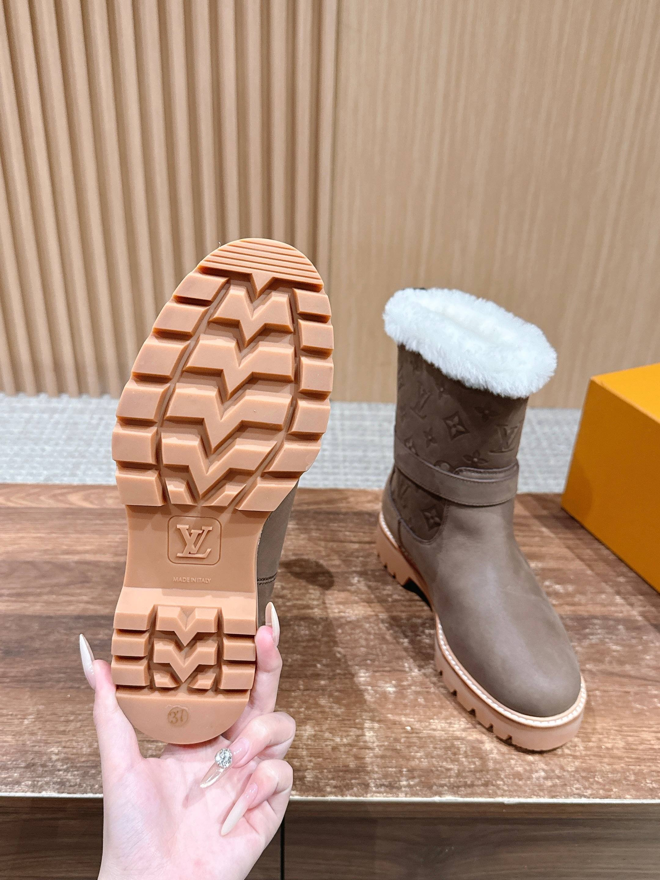 𝐋𝐨𝐮𝐢𝐬 𝐕𝐮𝐢𝐭𝐭𝐨𝐧 𝐓𝐞𝐧𝐢𝐭𝐨𝐫𝐲 #及裸靴 驴牌秋冬新款羊毛靴 本款及踝靴为正绒面牛皮革局部压印 Monogram 图案,搭配稳固橡胶外底。舒适羊毛皮内衬在靴筒顶部以包边形式呈现。莹泽搭扣与饰钉点亮腰带风格饰带。 Size:35-39(40/41定制不退换)