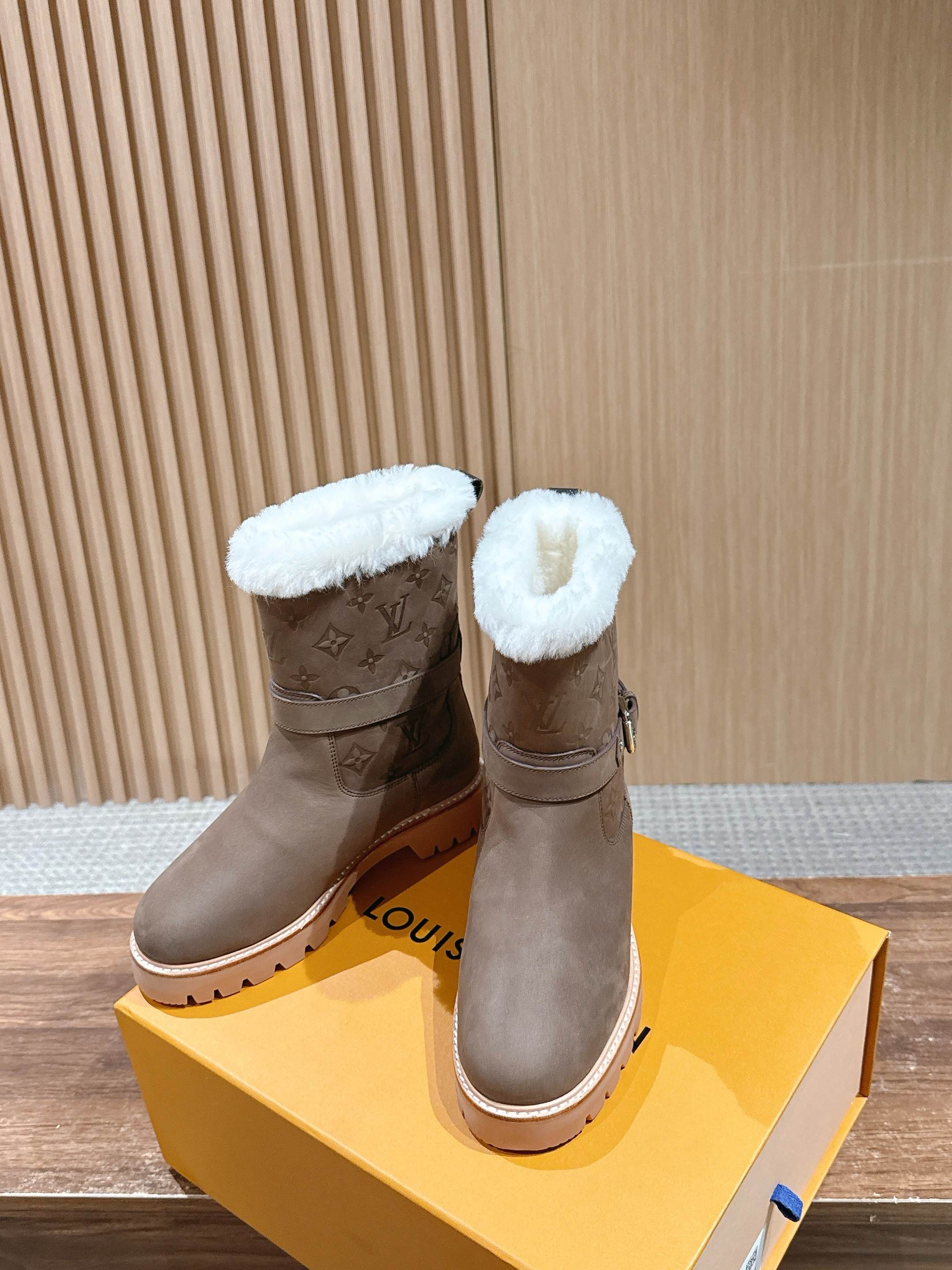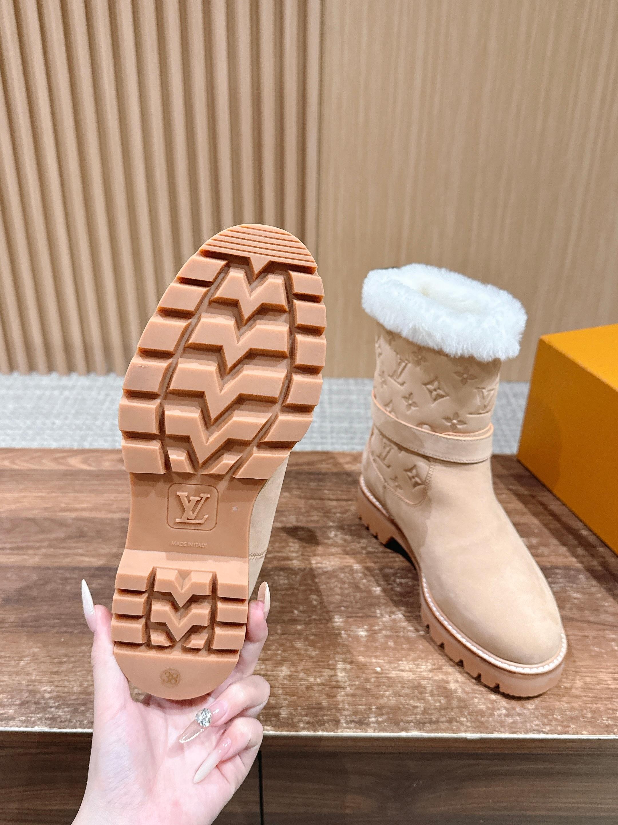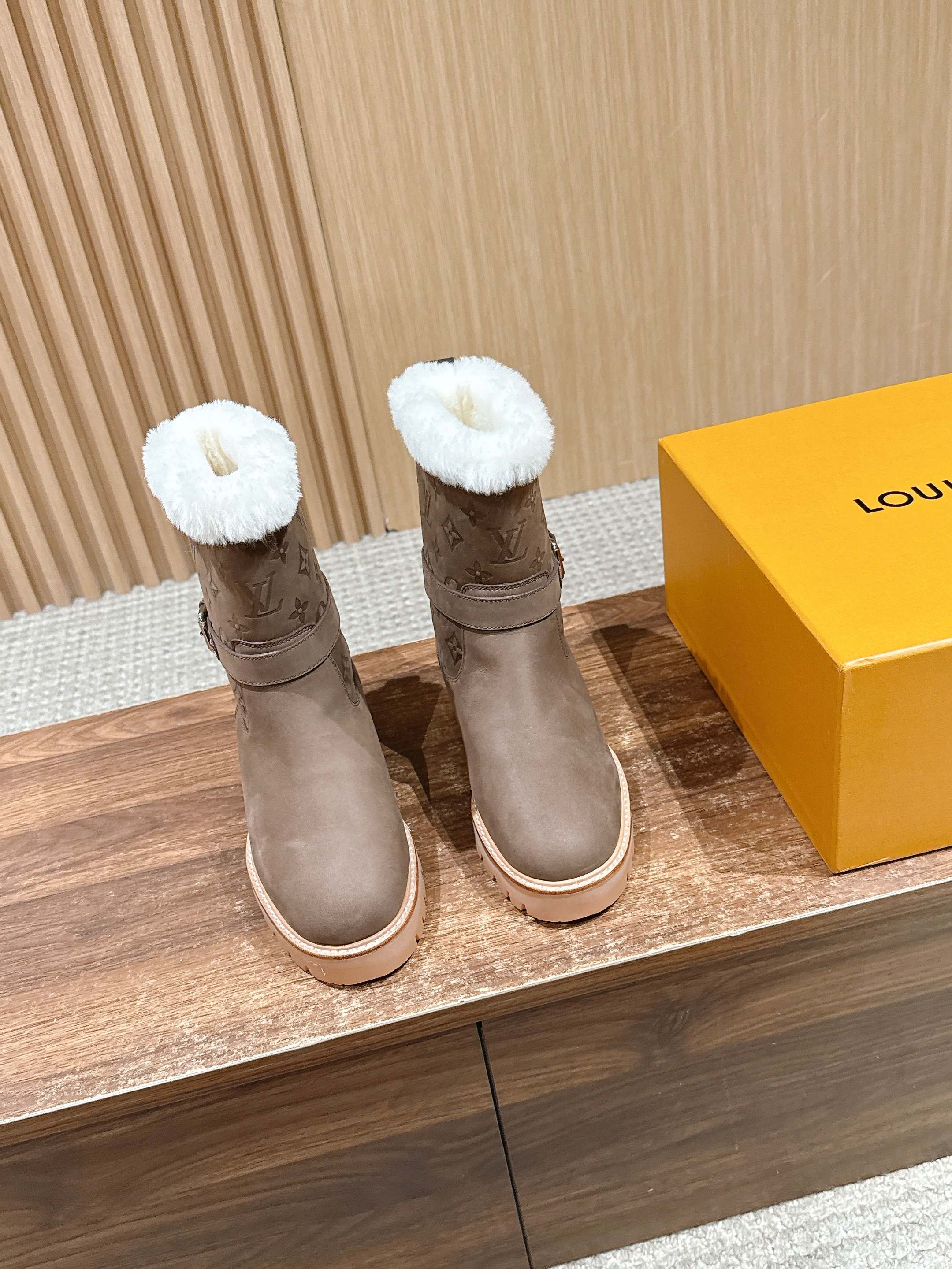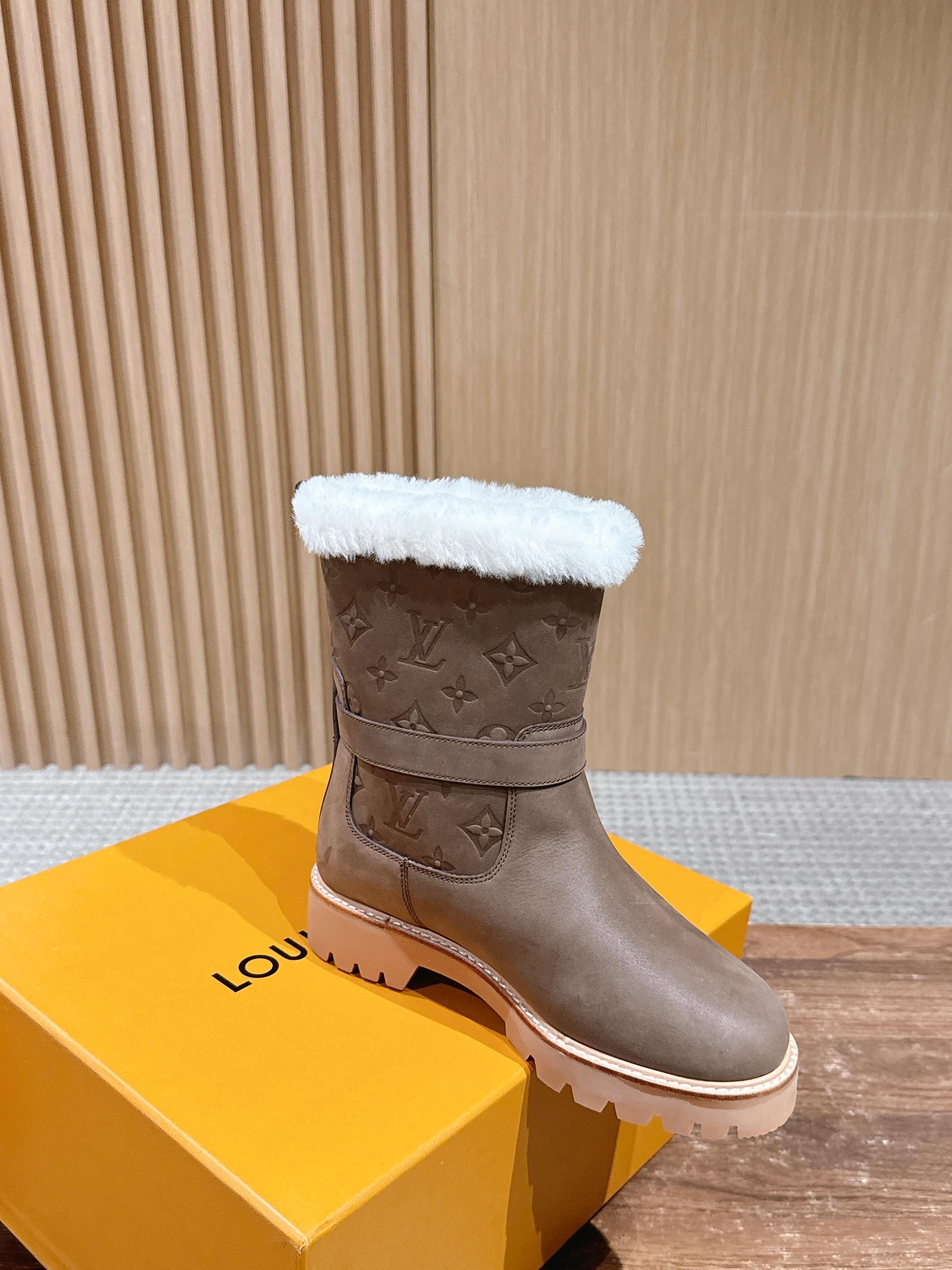 𝐋𝐨𝐮𝐢𝐬 𝐕𝐮𝐢𝐭𝐭𝐨𝐧 𝐓𝐞𝐧𝐢𝐭𝐨𝐫𝐲 #及裸靴 驴牌秋冬新款羊毛靴 本款及踝靴为正绒面牛皮革局部压印 Monogram 图案,搭配稳固橡胶外底。舒适羊毛皮内衬在靴筒顶部以包边形式呈现。莹泽搭扣与饰钉点亮腰带风格饰带。 Size:35-39(40/41定制不退换)