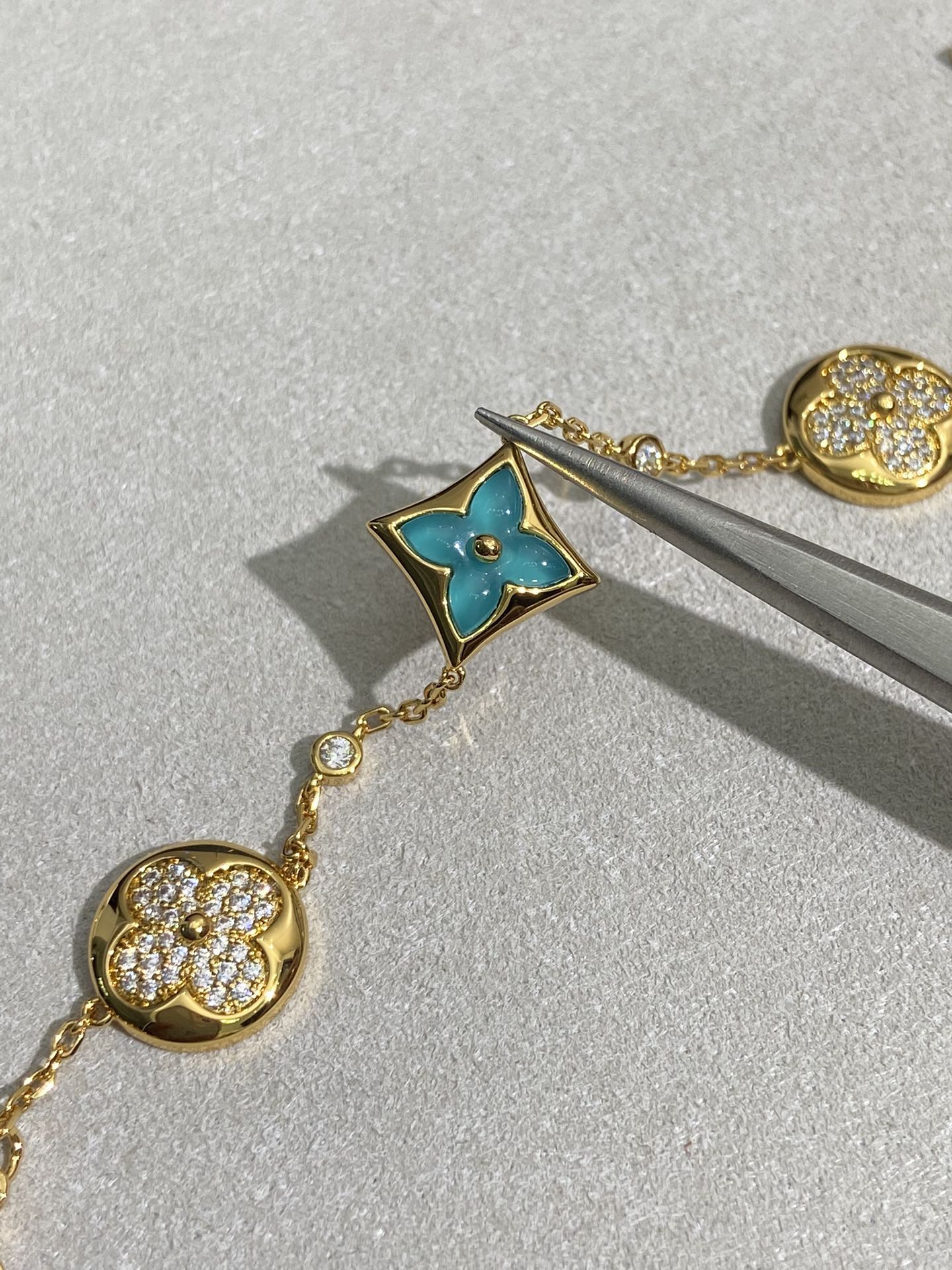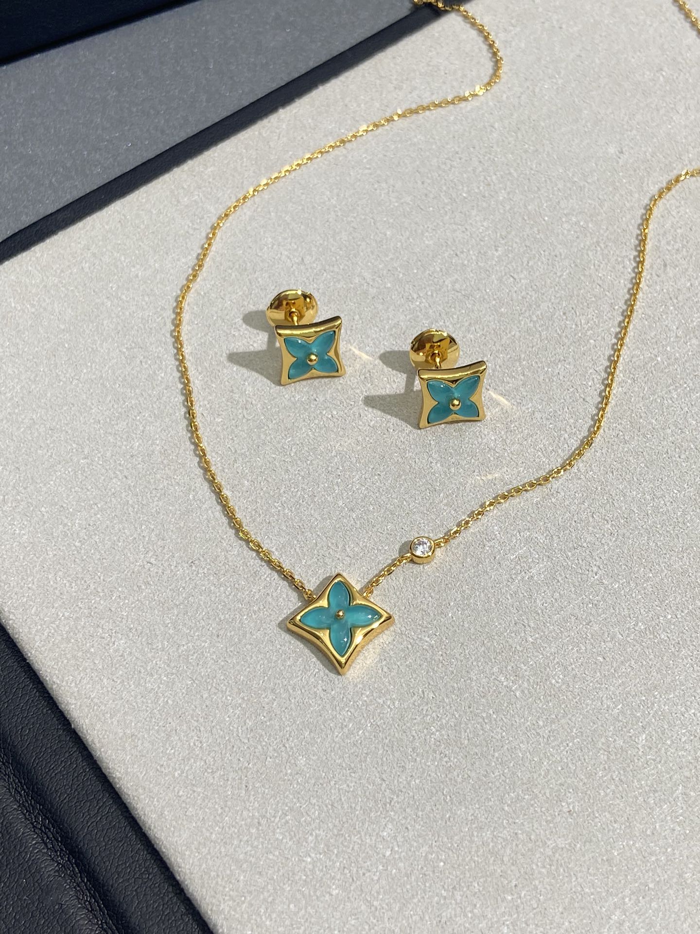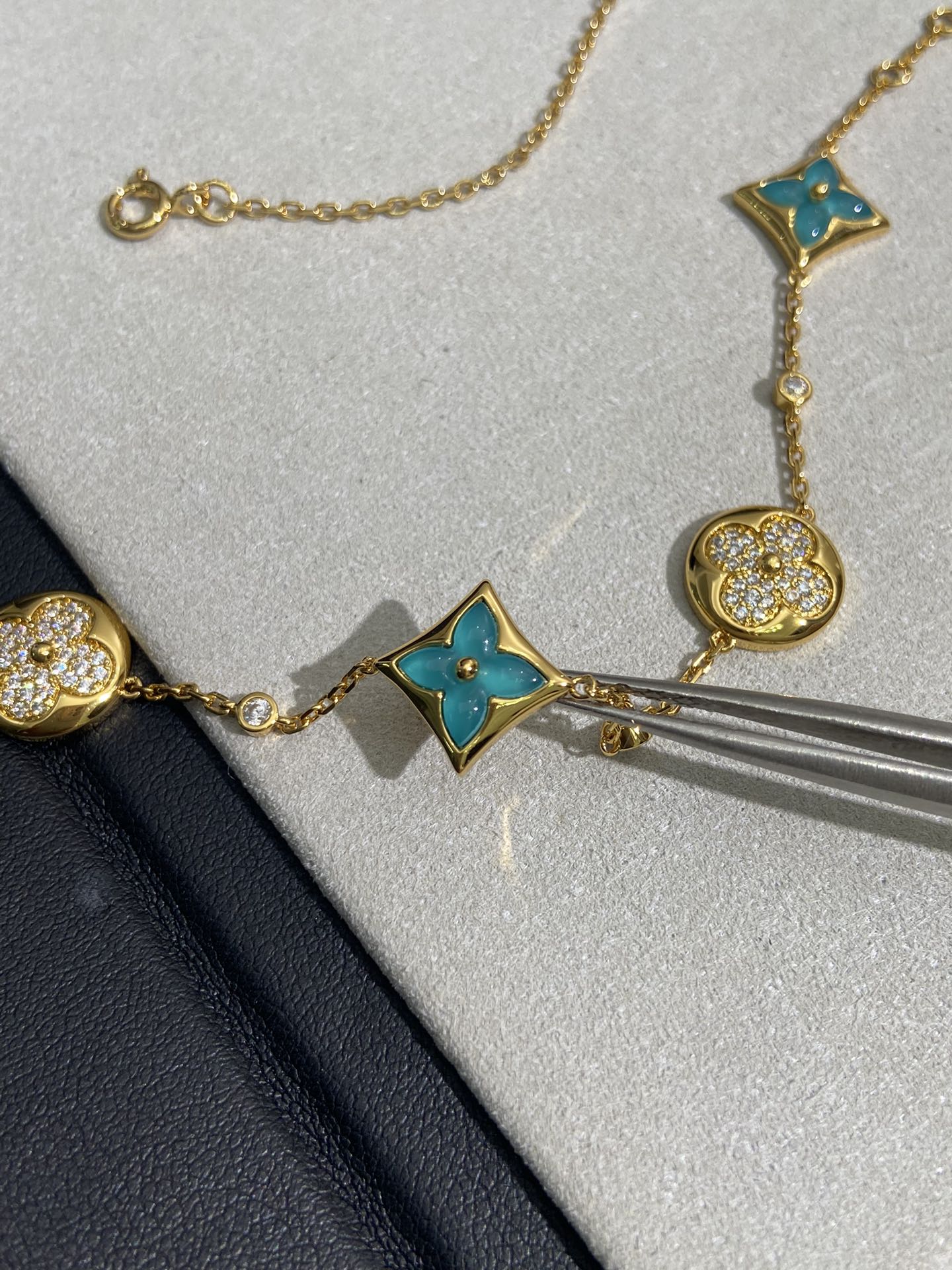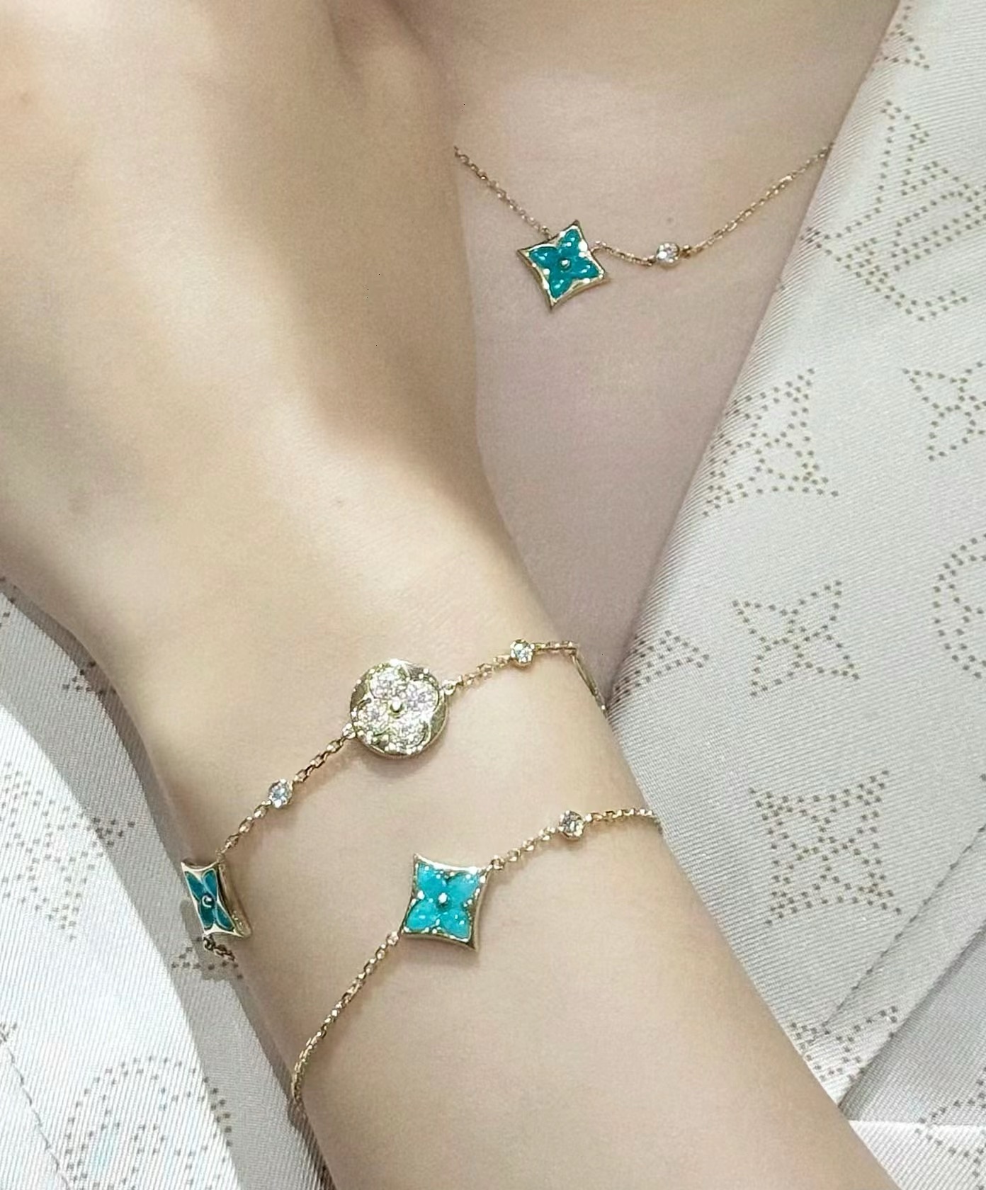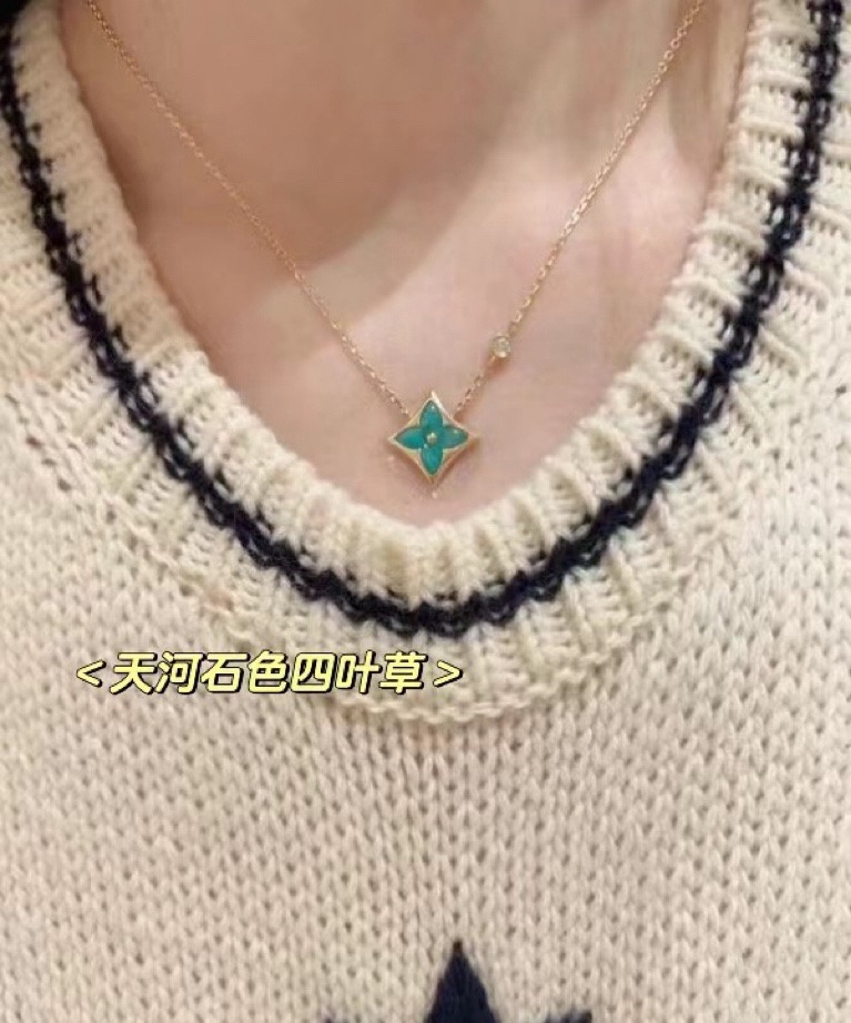实拍 新品天河石 Blossom项链 L家的珠宝,很多宝贝们还不太了解 但是其实我们 的Blossom 系列工艺和审美试戴了就无法抗拒~今天给大家带来的是我们的新品项链天河石|亚马逊石 天河石又称“亚马逊石”,蕞早发现地在亚马逊河流域,因为它的蓝绿色,使人连想到亚马逊河。天河石功效与作用 1.彰显气质;天河石是一种温润的玉石,与东方女性的传统美十分吻合,女性佩戴天河石饰品之后,可以彰显出自身所具有的温婉、贤淑的气质。 2.信心的灌注,结合了静谧的蓝与自在的绿,天河石的蓝绿色给人一种沉稳的力量,大大的增强女性自信魅力。 春来河水绿如蓝,天河石那抹Tiffany蓝,轻浅明艳,佩戴衬得肤色粉嫩、白皙,搭配素色服装能起到色彩点缀作用,职场女性着装套装也能增加时尚感。这种蓝绿色让人具有清冷气质同时带来恬静的氛围~V金镀金材质