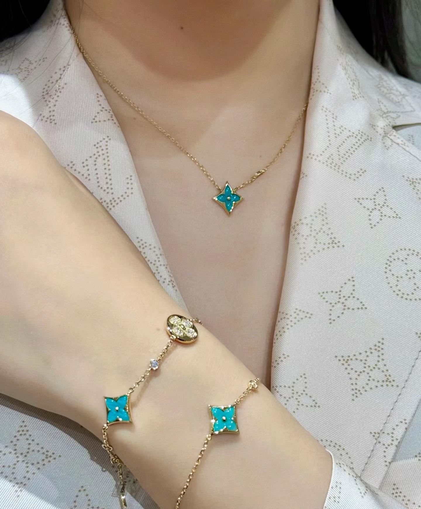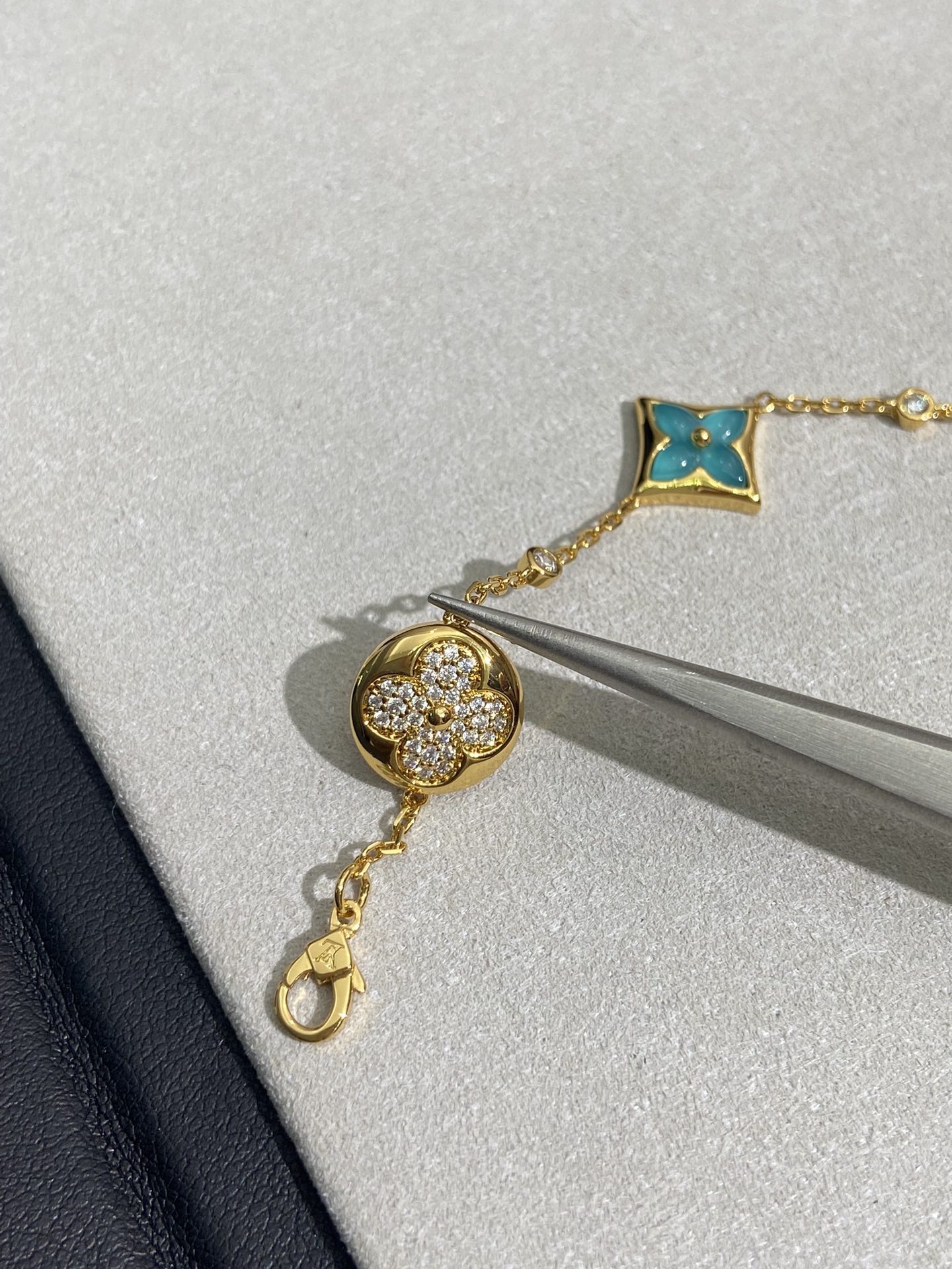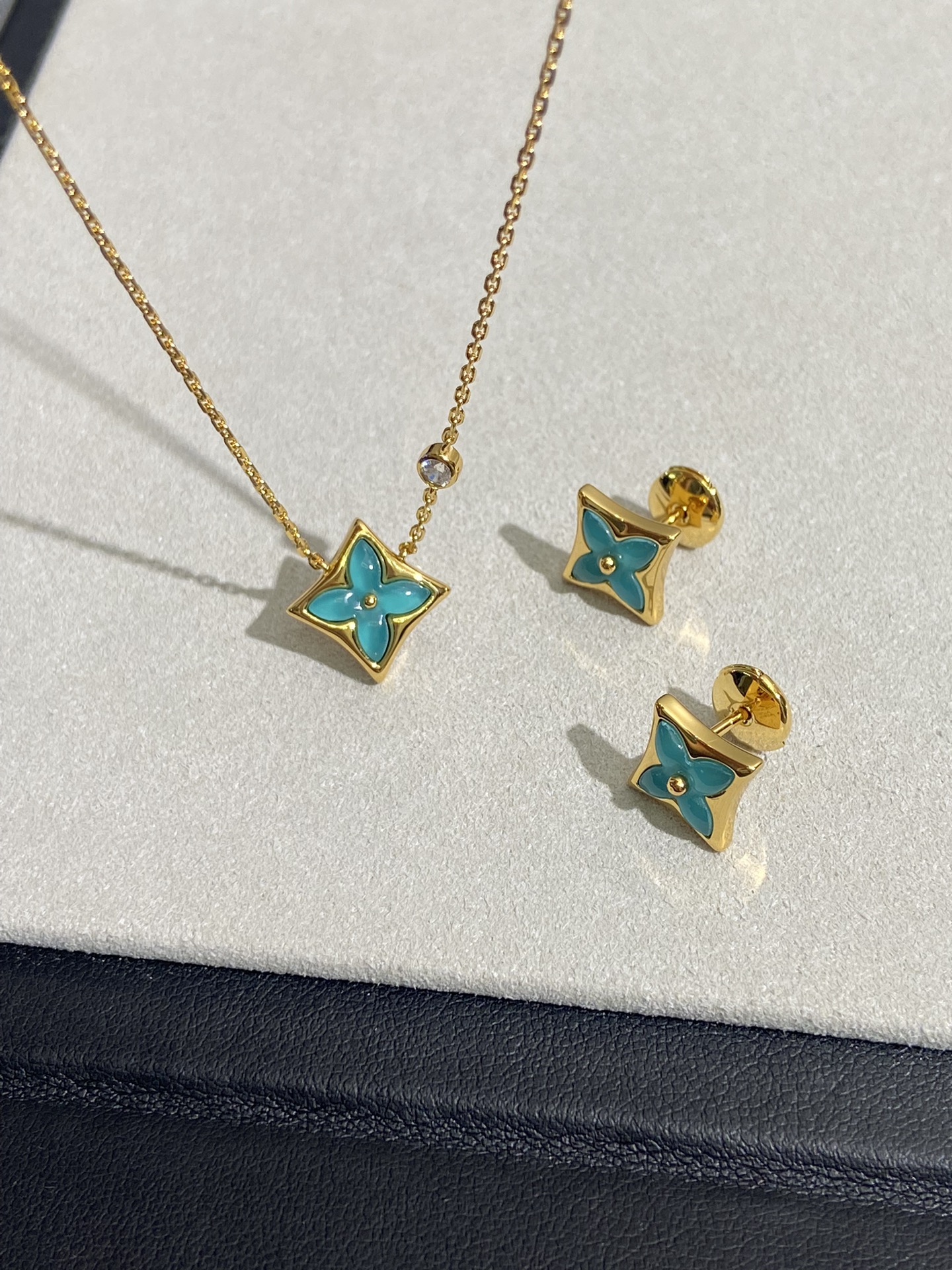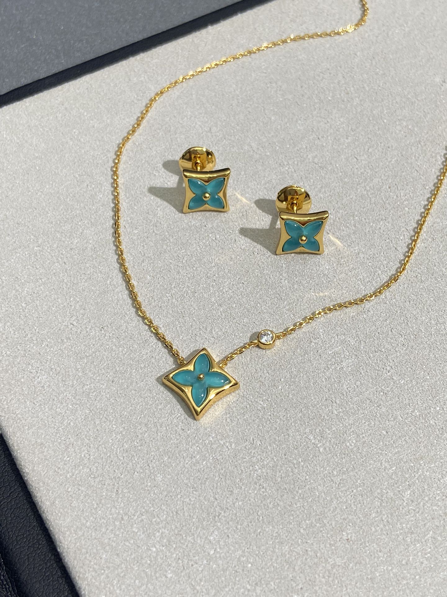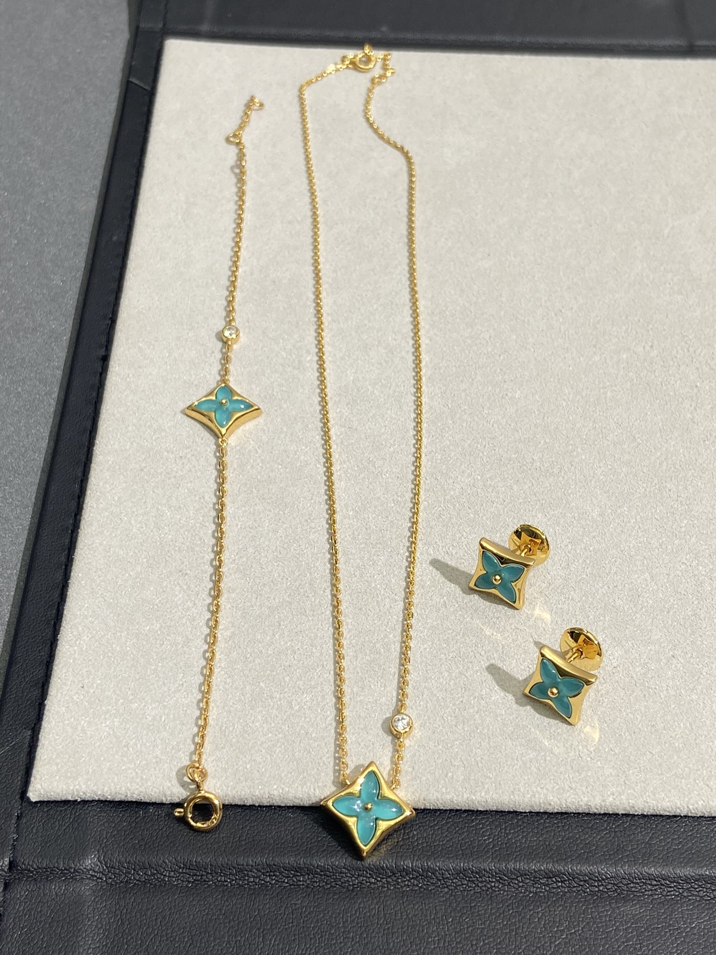 实拍 新品天河石 Blossom项链 L家的珠宝,很多宝贝们还不太了解 但是其实我们 的Blossom 系列工艺和审美试戴了就无法抗拒~今天给大家带来的是我们的新品项链天河石|亚马逊石 天河石又称“亚马逊石”,蕞早发现地在亚马逊河流域,因为它的蓝绿色,使人连想到亚马逊河。天河石功效与作用 1.彰显气质;天河石是一种温润的玉石,与东方女性的传统美十分吻合,女性佩戴天河石饰品之后,可以彰显出自身所具有的温婉、贤淑的气质。 2.信心的灌注,结合了静谧的蓝与自在的绿,天河石的蓝绿色给人一种沉稳的力量,大大的增强女性自信魅力。 春来河水绿如蓝,天河石那抹Tiffany蓝,轻浅明艳,佩戴衬得肤色粉嫩、白皙,搭配素色服装能起到色彩点缀作用,职场女性着装套装也能增加时尚感。这种蓝绿色让人具有清冷气质同时带来恬静的氛围~V金镀金材质