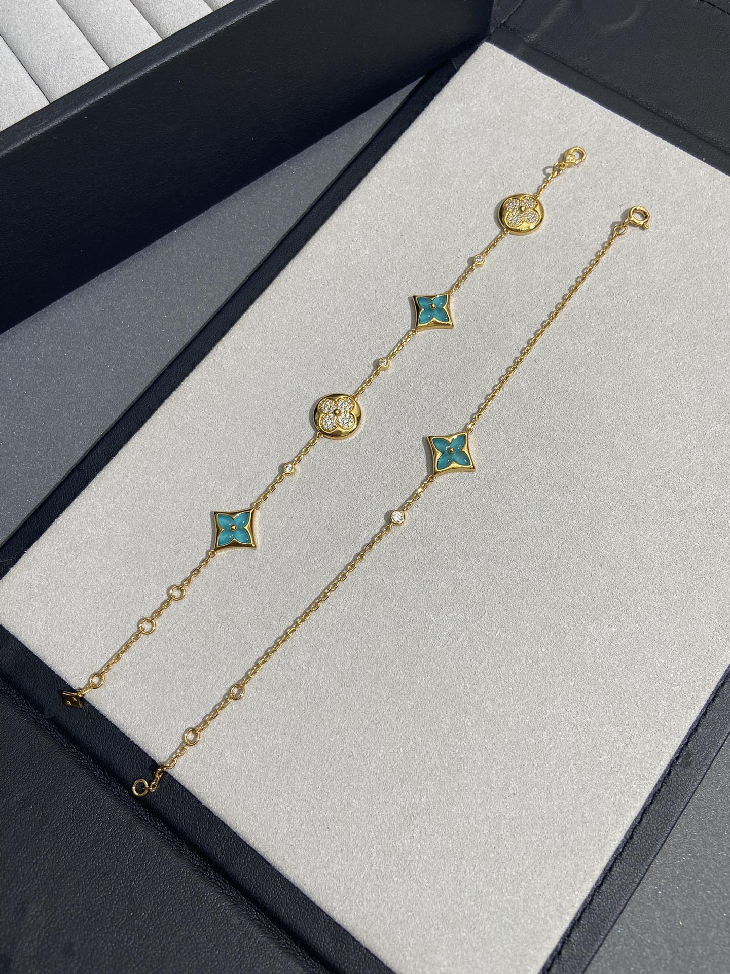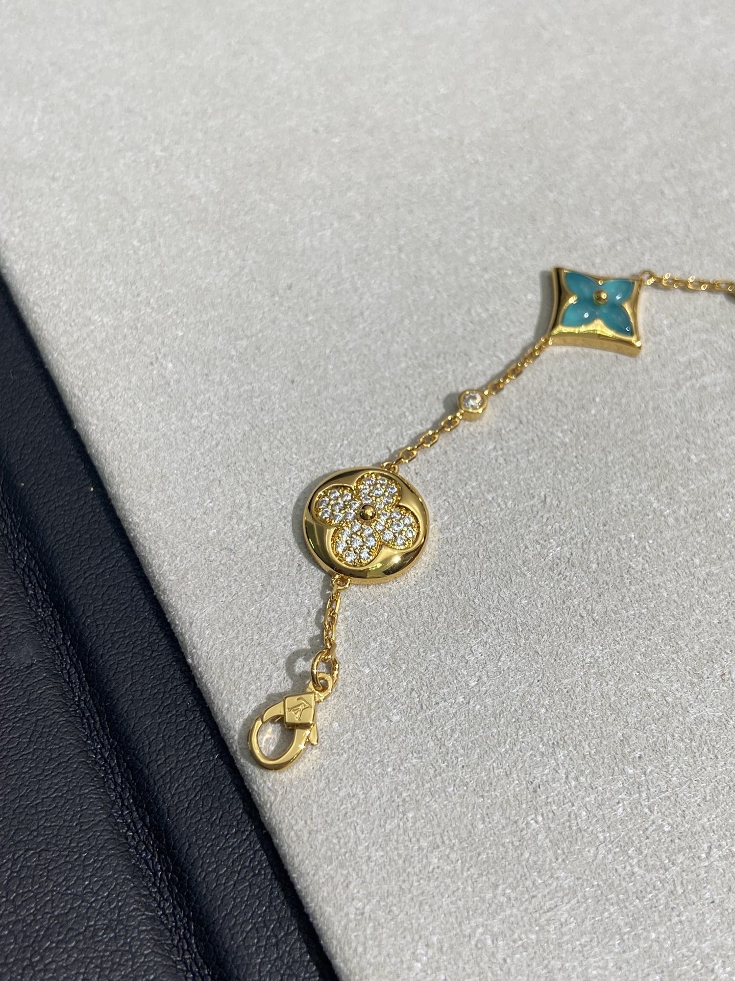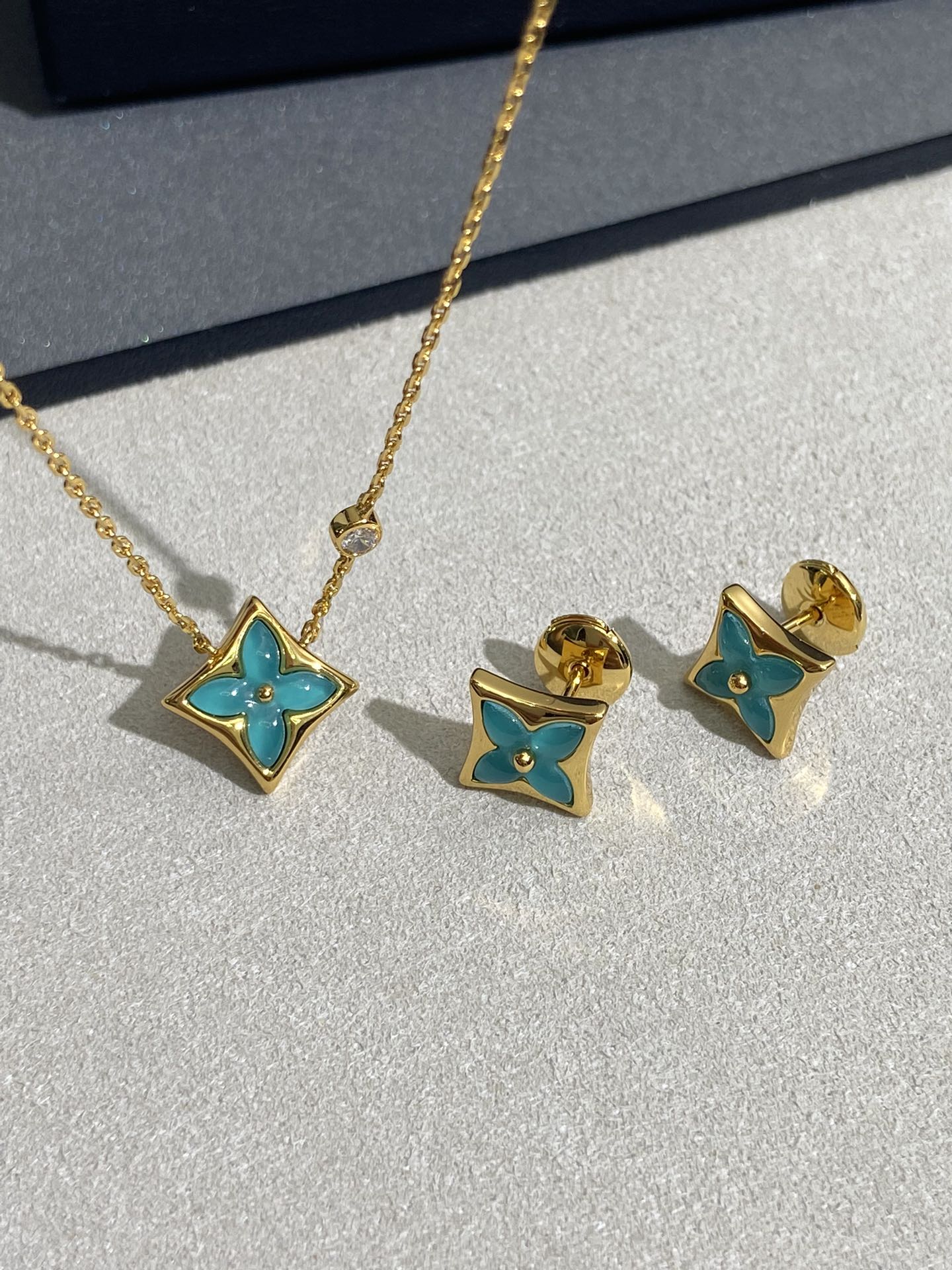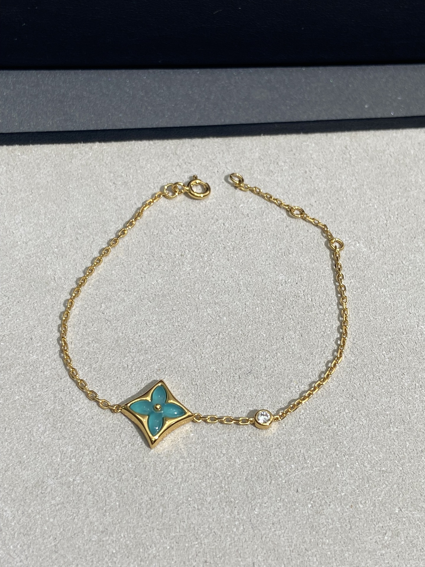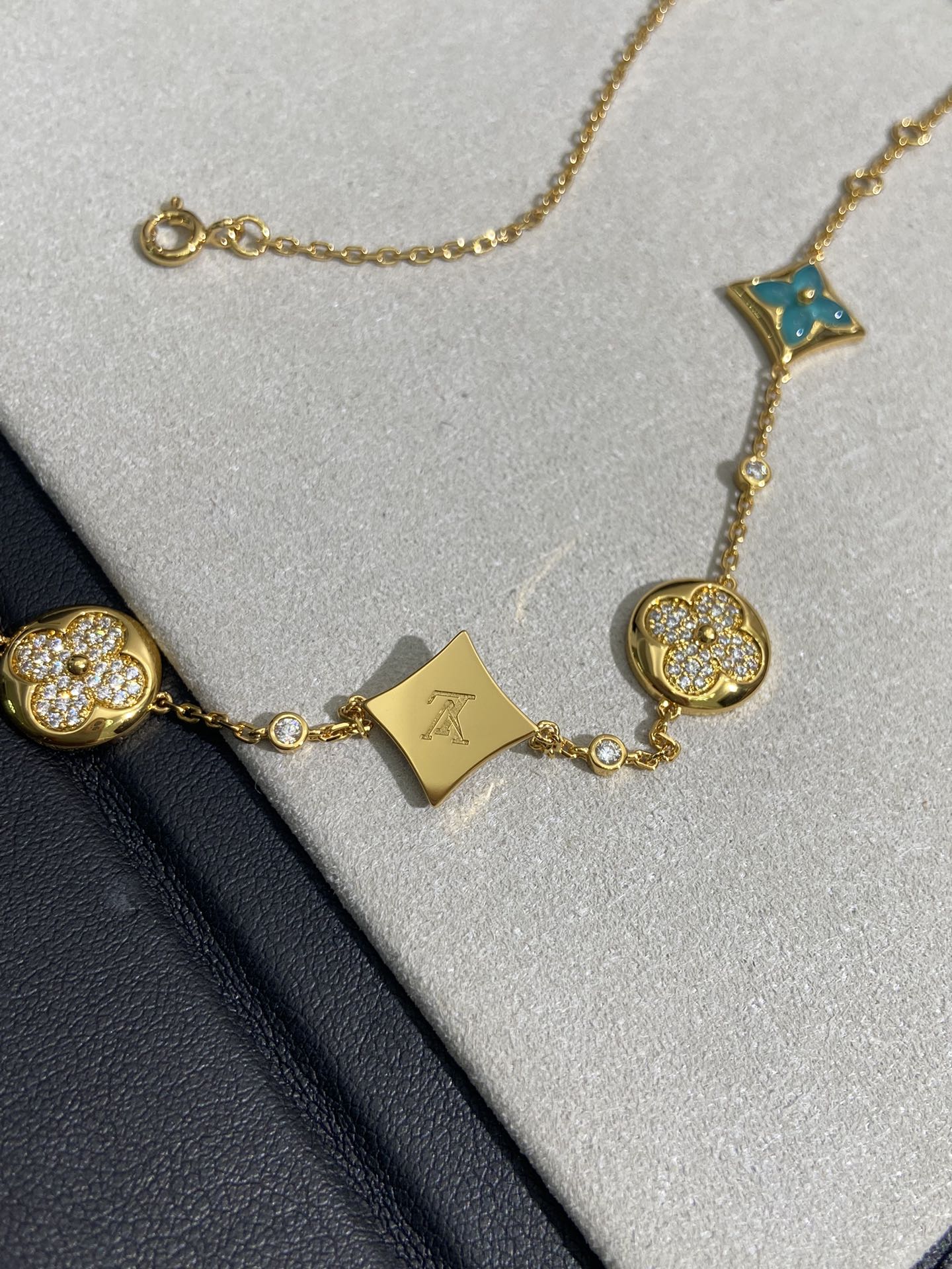 实拍 新品天河石 Blossom项链 L家的珠宝,很多宝贝们还不太了解 但是其实我们 的Blossom 系列工艺和审美试戴了就无法抗拒~今天给大家带来的是我们的新品项链天河石|亚马逊石 天河石又称“亚马逊石”,蕞早发现地在亚马逊河流域,因为它的蓝绿色,使人连想到亚马逊河。天河石功效与作用 1.彰显气质;天河石是一种温润的玉石,与东方女性的传统美十分吻合,女性佩戴天河石饰品之后,可以彰显出自身所具有的温婉、贤淑的气质。 2.信心的灌注,结合了静谧的蓝与自在的绿,天河石的蓝绿色给人一种沉稳的力量,大大的增强女性自信魅力。 春来河水绿如蓝,天河石那抹Tiffany蓝,轻浅明艳,佩戴衬得肤色粉嫩、白皙,搭配素色服装能起到色彩点缀作用,职场女性着装套装也能增加时尚感。这种蓝绿色让人具有清冷气质同时带来恬静的氛围~V金镀金材质