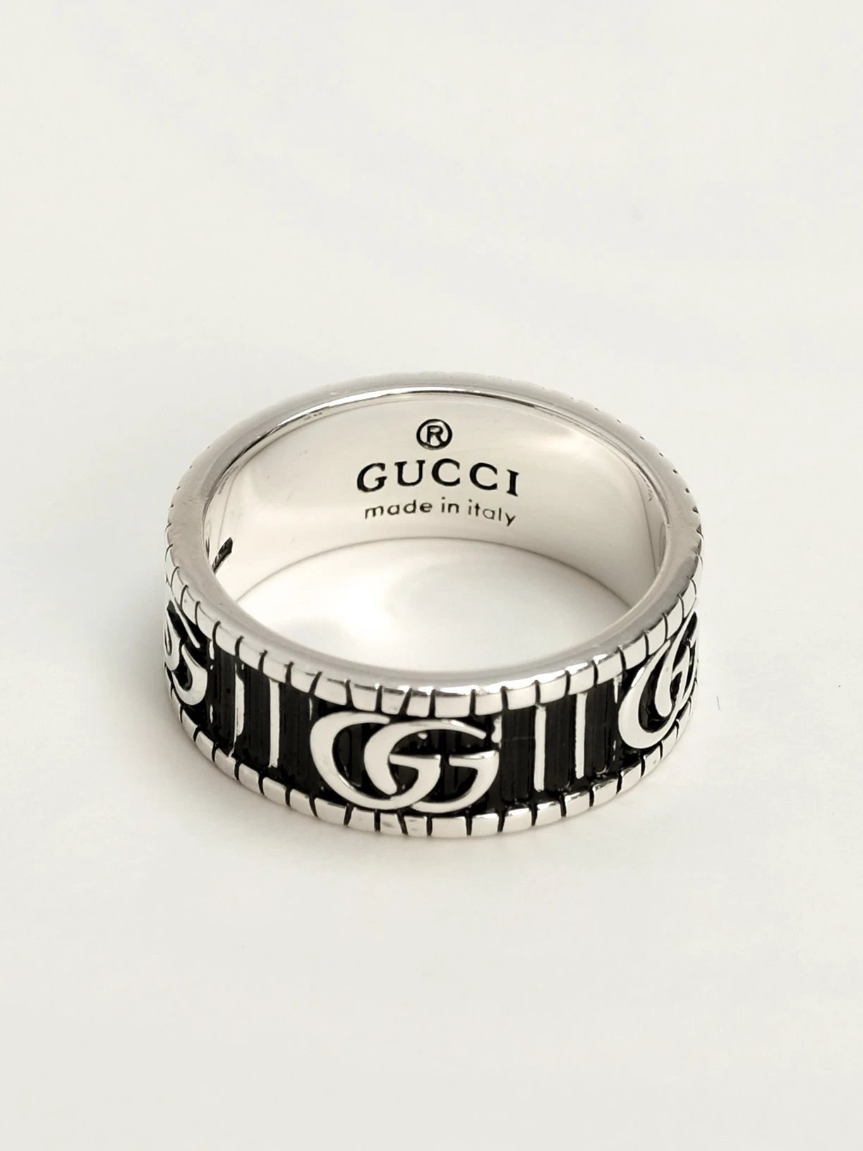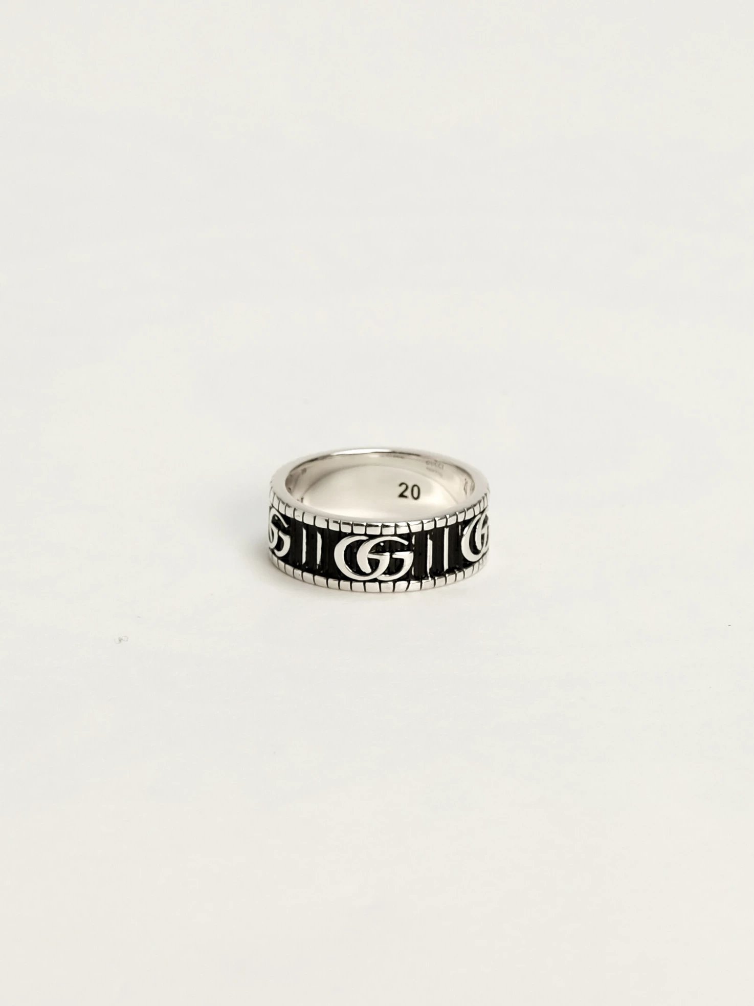 双G始终是品牌设计中不可或缺的一部分。将70年代Gucci典藏腰带的设计与现代美学相结合,别具一格的双G与纯银珠宝系列的精美刻花图案相得益彰。双色效果与立体条纹设计形成对比美感,标志性的品牌元素为纤细的戒指平添层次。