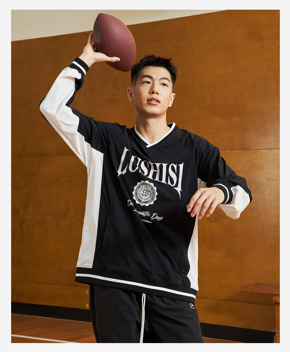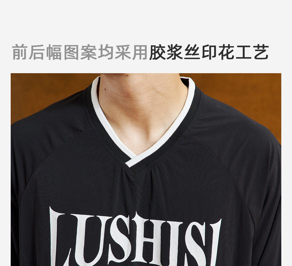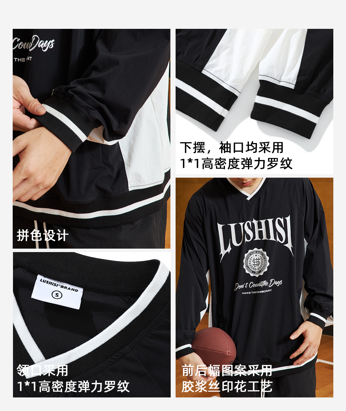 LUSHISI「棉感速干」双色拼接字母撞色运动复古风混纺棉长袖t恤