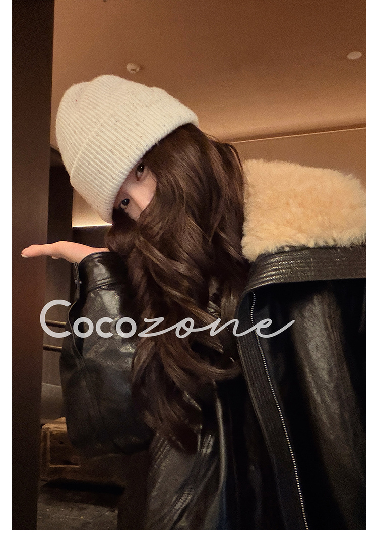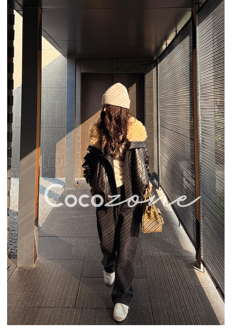 COCO ZONE 刘 一一 “黑胶皮衣”90鹅绒油蜡绵羊皮皮衣 CD2A3195