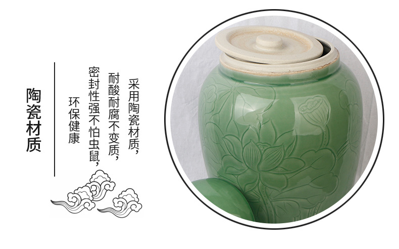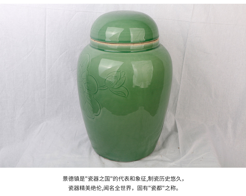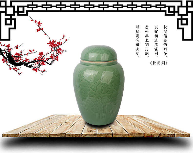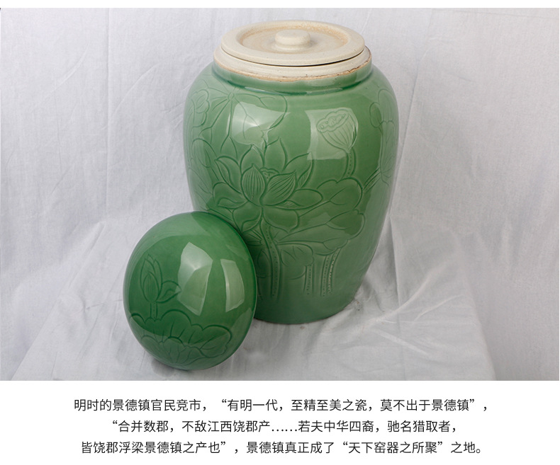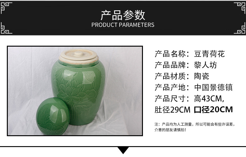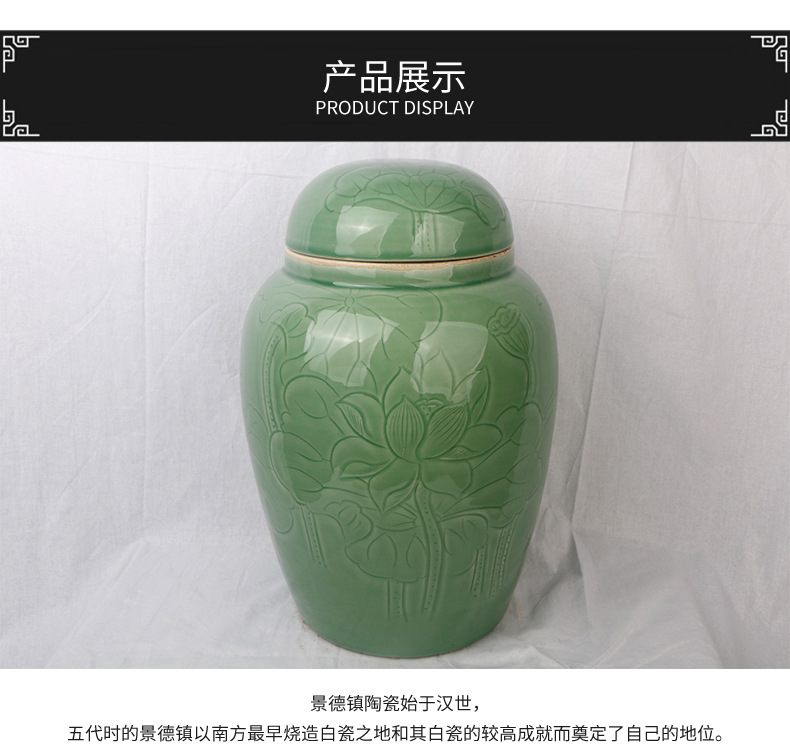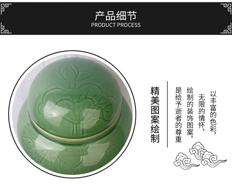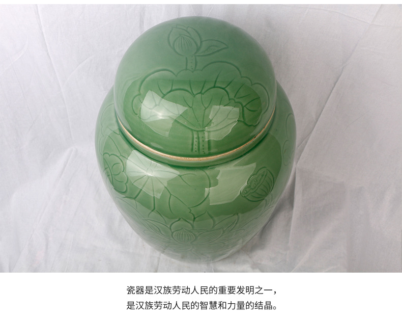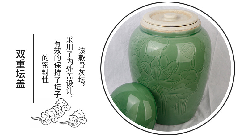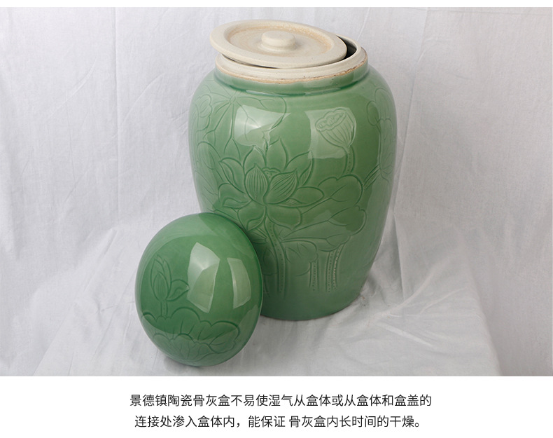 景德镇陶瓷骨灰罐 直身大口豆青荷花骨灰坛