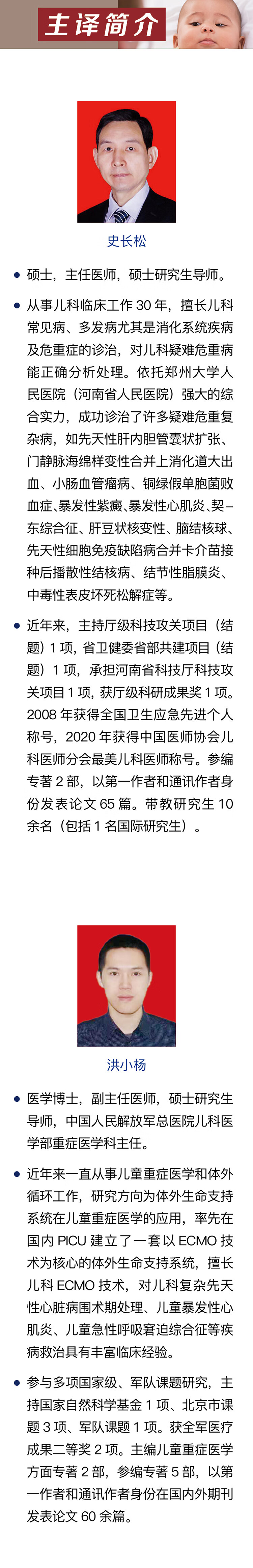 史长松,硕士,主任医师、硕士研究生导师。中国医师协会儿童重症医师分会呼吸危重症及机械通气专业委员会委员,中华医学会儿科分会急救学组重症呼吸和机械通气协作组委员,中华医学会儿科分会急救学组重症感染协作组委员,河南省医学会第十届儿科学分会副主任委员,河南省医学会儿科学分会第三届小儿急救学组副组长,河南省中西医结合学会儿科分会副主任委员,河南省医学科学普及学会儿科专业委员会副主任委员,河南省医学会重症医学分会第三届儿科学组副组长,中国医学救援协会儿科分会第二届委员会常务委员,河南省医院协会儿童医院(科)分会常务委员,河南省医院协会重症医学分会常务委员,河南省医师协会第四届儿科分会常务委员,河南省预防接种异常反应鉴定专家组成员,河南省微循环学会儿科分会第一届会长,河南省新型冠状病毒疫苗接种异常反应救治专家组成员,河南省儿科医疗质量控制专家委员会副主任委员,河南省妇幼保健机构评审专家,《中华实用诊断与治疗杂志》《中国当代儿科杂志》《医药论坛杂志》编委。从事儿科临床工作30年,擅长儿科常见病、多发病尤其是消化系统疾病及危重症的诊治,对儿科疑难危重病能正确分析处理。依托郑州大学人民医院(河南省人民医院)强大的综合实力,成功诊治了许多疑难危重复杂病,如先天性肝内胆管囊状扩张、门静脉海绵样变性合并上消化道大出血、小肠血管瘤病、铜绿假单胞菌败血症、暴发性紫癜、暴发性心肌炎、契-东综合征、肝豆状核变性、脑结核球、先天性细胞免疫缺陷病合并卡介苗接种后播散性结核病、结节性脂膜炎、中毒性表皮坏死松解症等。近年来,主持厅级科技攻关项目(结题)1项,省卫健委省部共建项目(结题)1项,承担河南省科技厅科技攻关项目1项,获厅级科研成果奖1项。2008年获得全国卫生应急先进个人称号,2020年获得中国医师协会儿科医师分会最美儿科医师称号。参编专著2部,以第一作者和通讯作者身份发表论文65篇。带教研究生10余名(包括1名国际研究生)。
