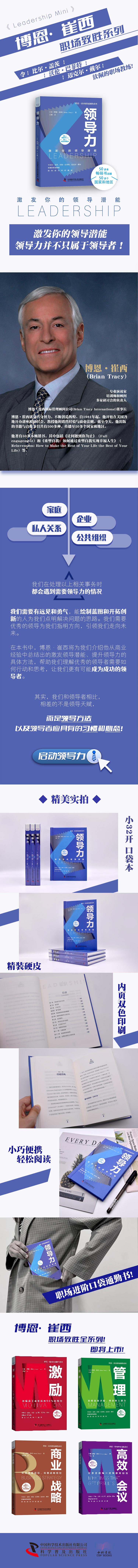 领导者并不是天生的,掌握一定的方法,我们都有可能成为领导者! 我们和领导者相比,相差的不是领导天赋,而是领导方法以及领导者应具有的习惯和心态。 博恩·崔西将自己的商业经验总结成这本短小精悍的“领导力笔记”,教我们如何像领导者一样行动和思考,助我们激发出自己的领导潜能。 如果你是领导者,这本书能让你发现自己的突破点。如果你还不是领导者,这本书可能是你成为领导之路上的有力助推器。