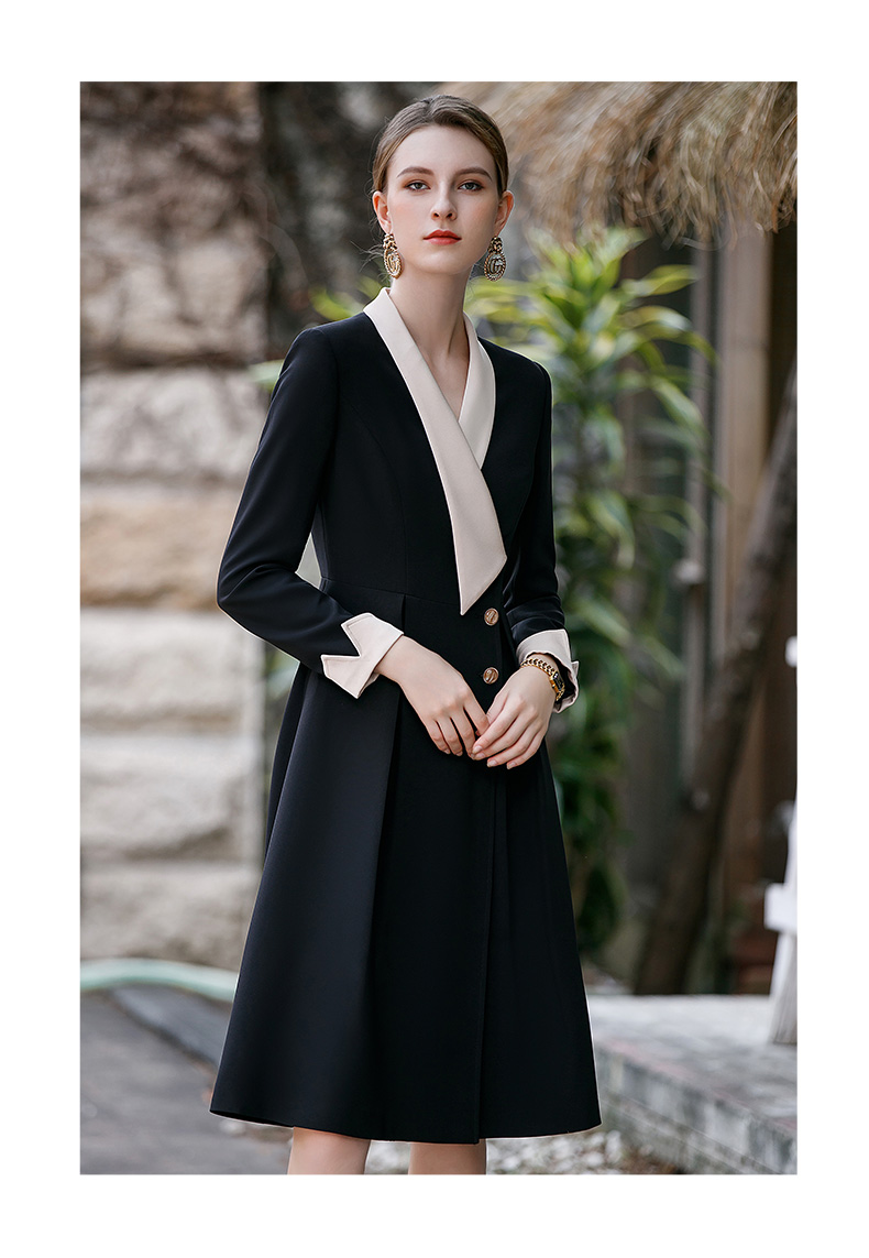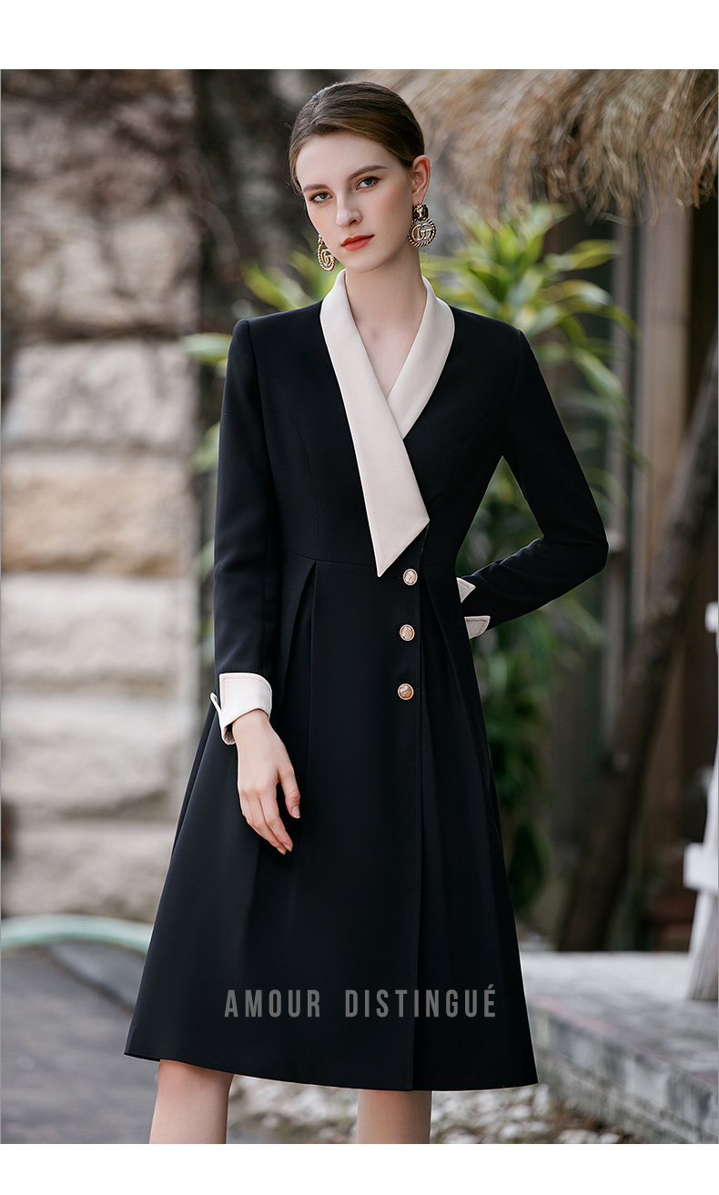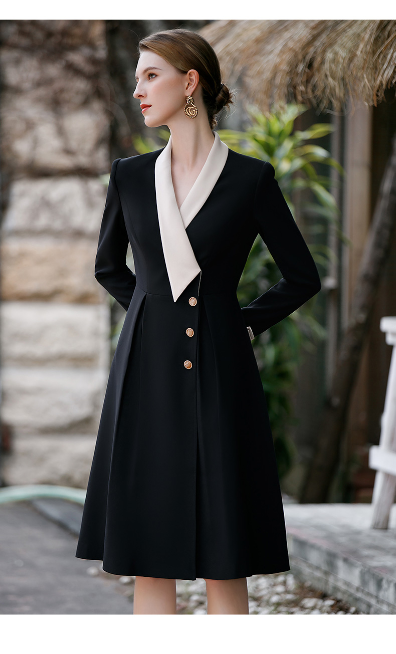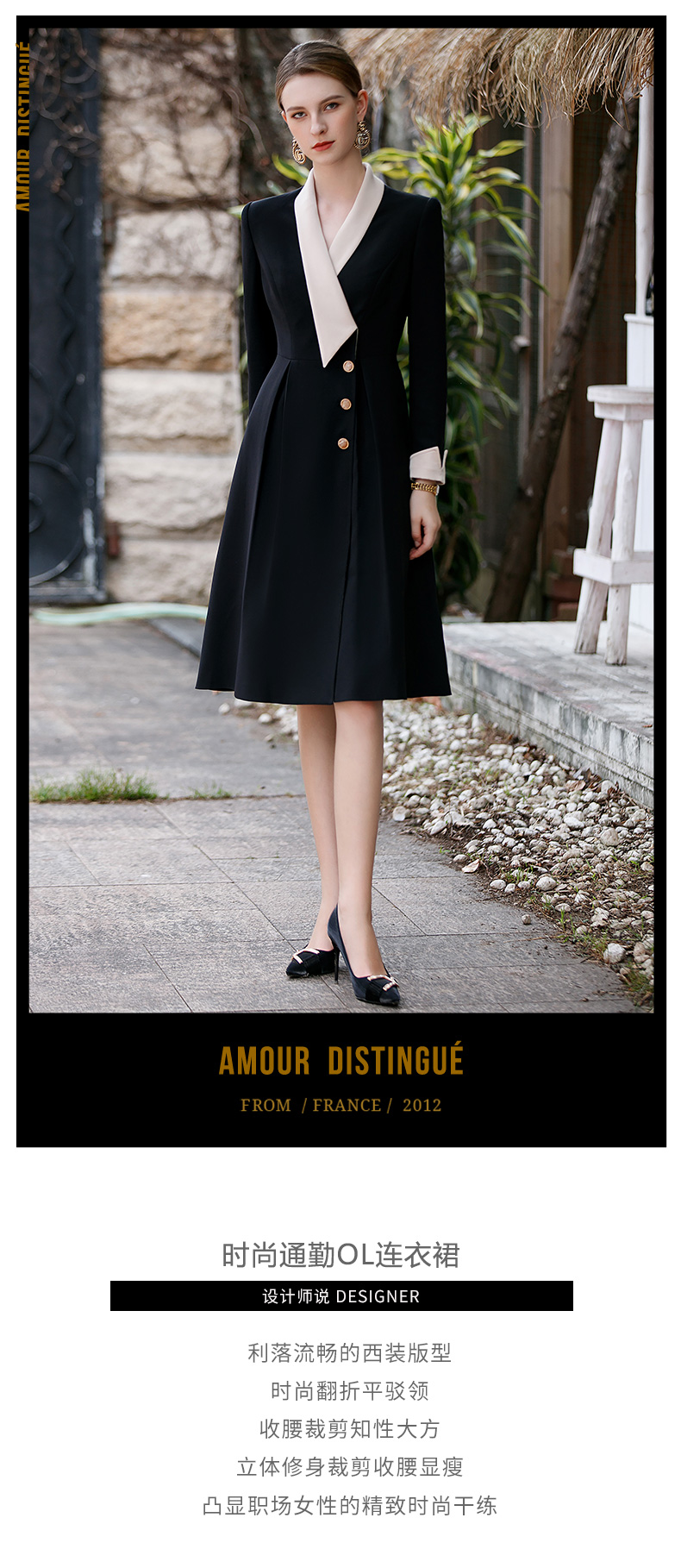 高级感缎面领西装连衣裙女气质职业裙子收腰大摆接拼黑色西服裙