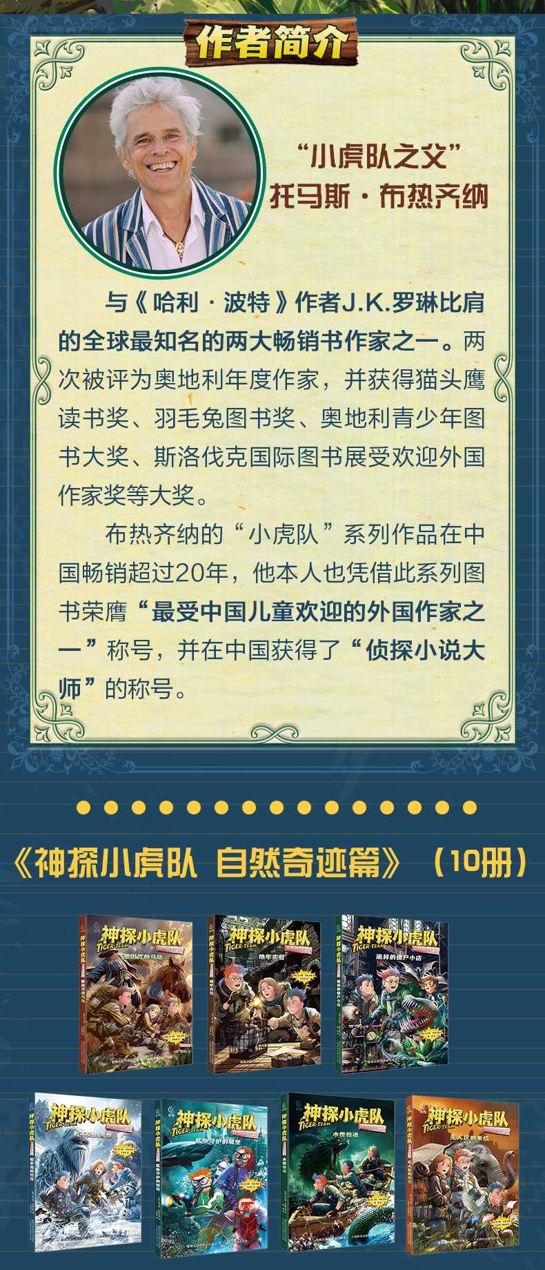 托马斯布热齐纳,;小虎队之父,知名畅销书作家,德语国家具有巨大影响力的童书作家之一。他曾两次被评为奥地利年度作家,并获得猫头鹰读书奖、羽毛兔图书奖、奥地利青少年图书大奖、斯洛伐克国际图书展受欢迎外国作家奖等大奖。布热齐纳的;小虎队系列作品在中国畅销超过20年,他本人也凭借此系列图书荣膺;最受中国儿童欢迎的外国作家称号,并在中国获得了;侦探小说大师的称号。读书是一次冒险,布热齐纳希望自己的小读者在阅读中感到充实、无畏、坚强和自信。