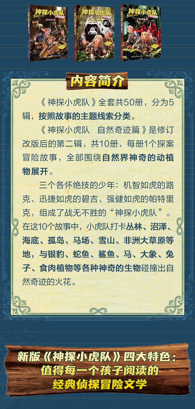 《神探小虎队 自然奇迹篇》是修订改版后的第二辑,共10册,每册1个探案冒险故事,全部围绕自然界神奇的动植物展开。
