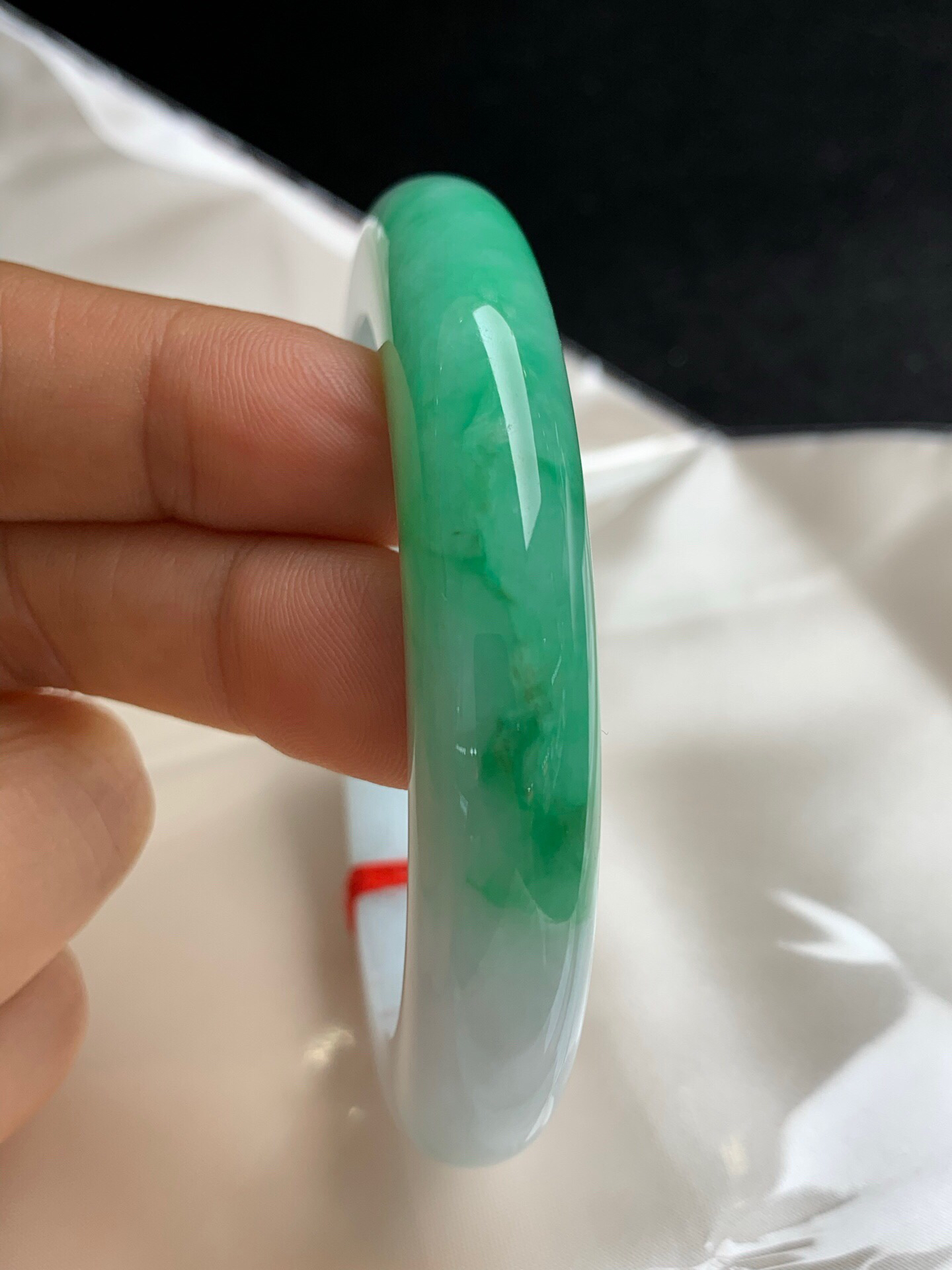 612980,55.2圈口,细糯飘绿正圈平安镯,白底飘绿,窄条秀气条形