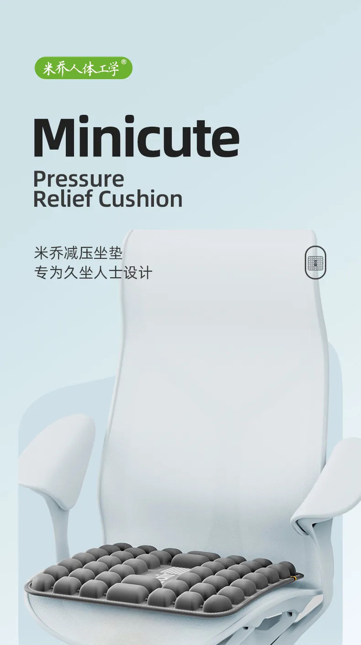 米乔坐垫上有做46颗减震气囊,气囊之间的气体流动会产生“反重力”效果,从而缓冲压力,减轻臀部负荷。同时,3D气囊内的气流通道可以分散垂直压力并平衡受力点,实现减震效果。人体工学的设计和整体多角度的包裹以及全方位的动态支撑,使得坐感舒适的同时还能释放屁屁压力,不会越坐越扁。坐垫的凸槽设计既符合人体曲线还有通风透气的特点,天气热坐久了也不担心闷得湿湿的。新升级的水冷版坐垫,更是进行了清凉升级,采用不易吸收热量的惰性温感材料,大幅度降低热能传导,三层面料设计,从内到外有调温清凉层、透气TPU和外层的氨纶纤维,舒适又清凉!