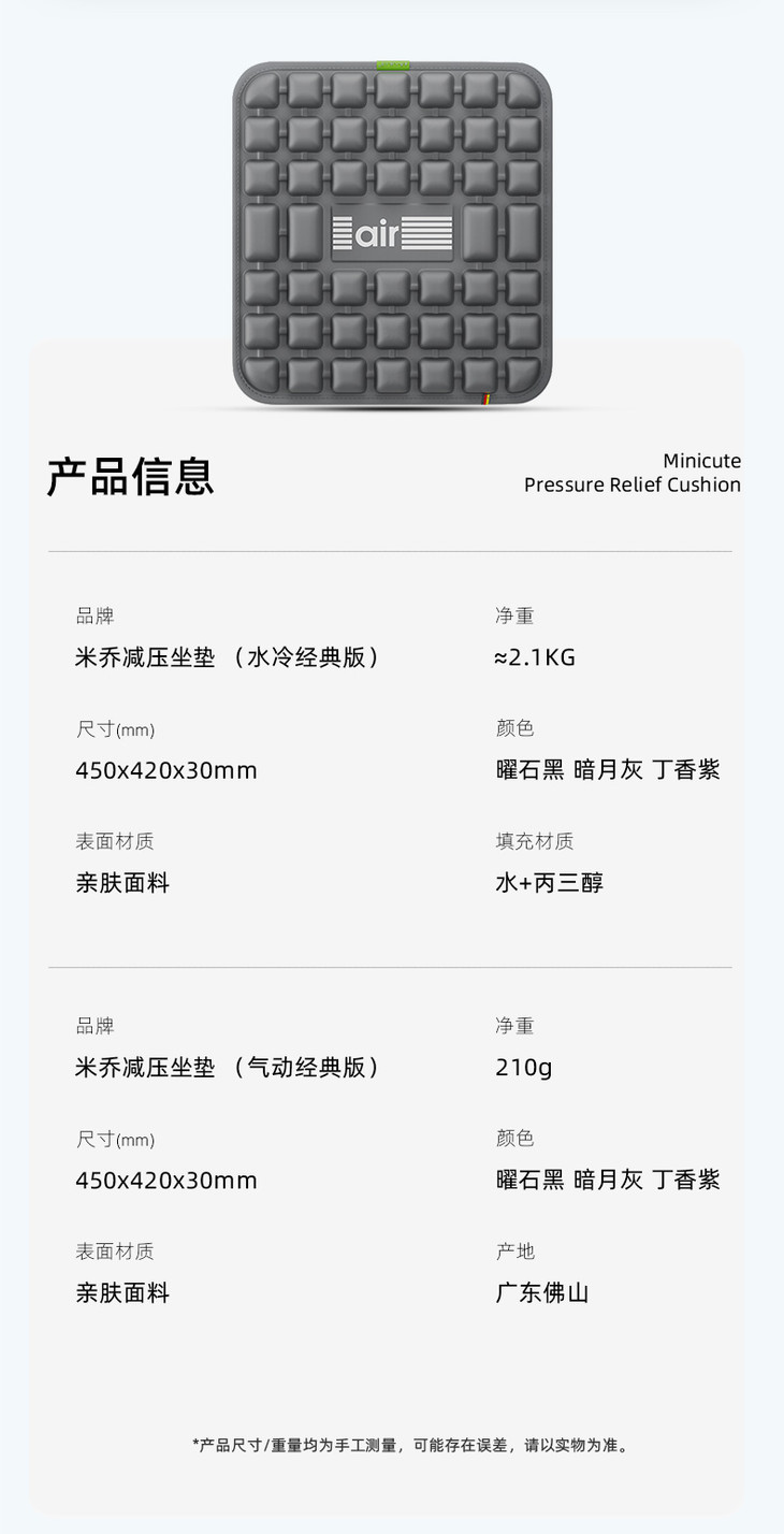 对于每天都粘在椅子上的我来说,舒适的坐垫真的是刚需了,特别是夏天,姨妈,粘腻。。。贵的便宜的,都试了遍,只能说,贵有贵但道理,还是选了米乔,凉感、减震、舒适还略略美臀,久坐星人要入!坐垫有分气动和水冷两款,如果是准备放车里就选气动,放家里或者办公室就根据喜好选就行!