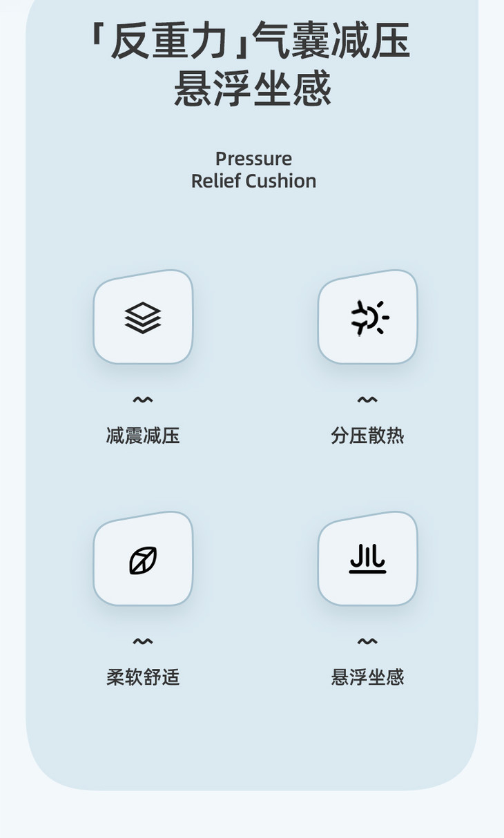 除了高科技外,其它部分也是细节满满,圆弧边角及背面的防滑设计使坐垫与座椅更贴合,气垫背面还设计了充气密封孔,需要充气的按个三四下就能充满,不担心坐久了气垫就扁塌塌,而且,专业测试显示坐垫能承受高达180kg的重量,各种体型都能轻松hold住哦!